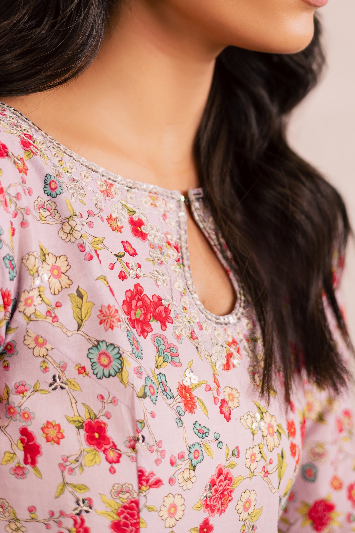 Paired with a contrasting off-white printed cambric shalwar, highlighted with delicate tilla stitch lines at the hem, perfectly complementing the embroidered accents of the shirt.