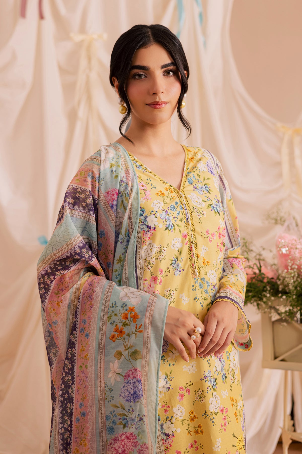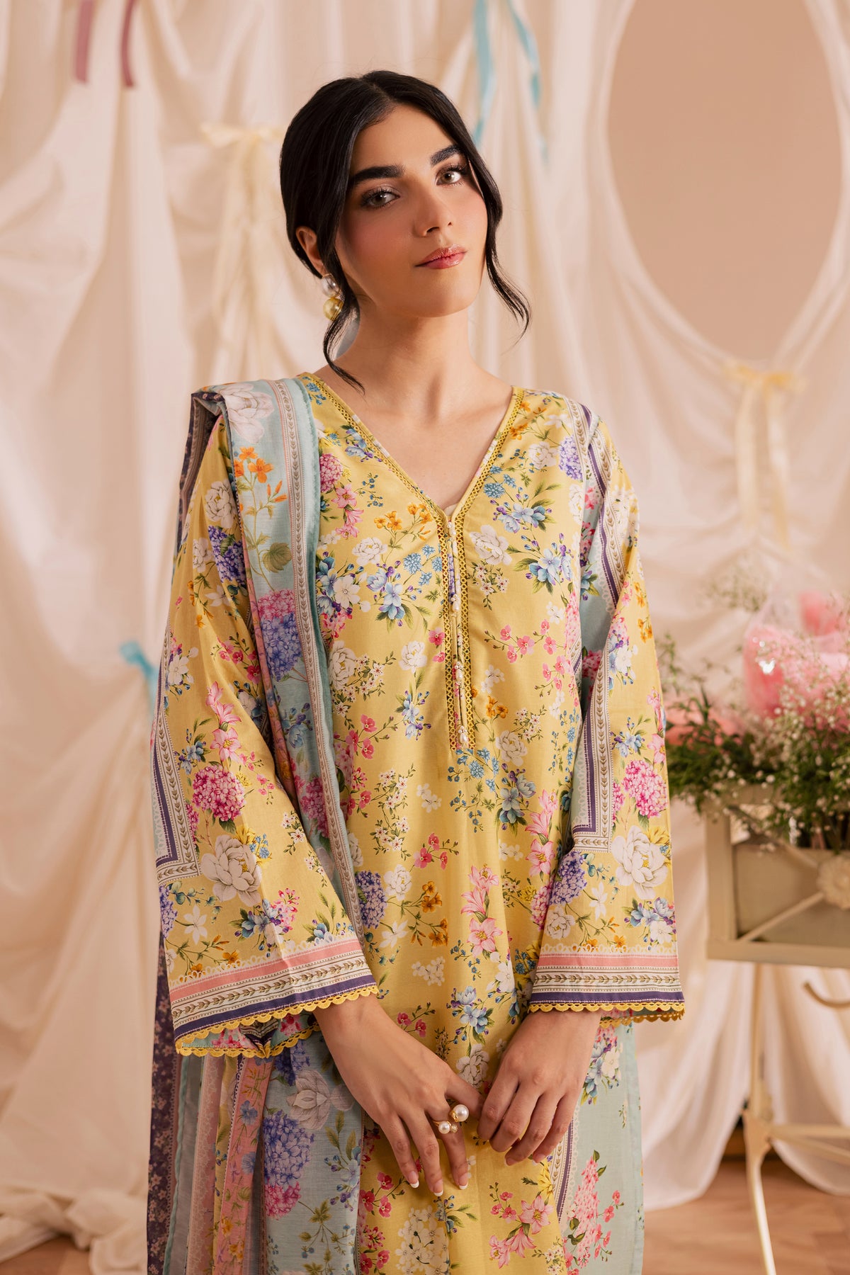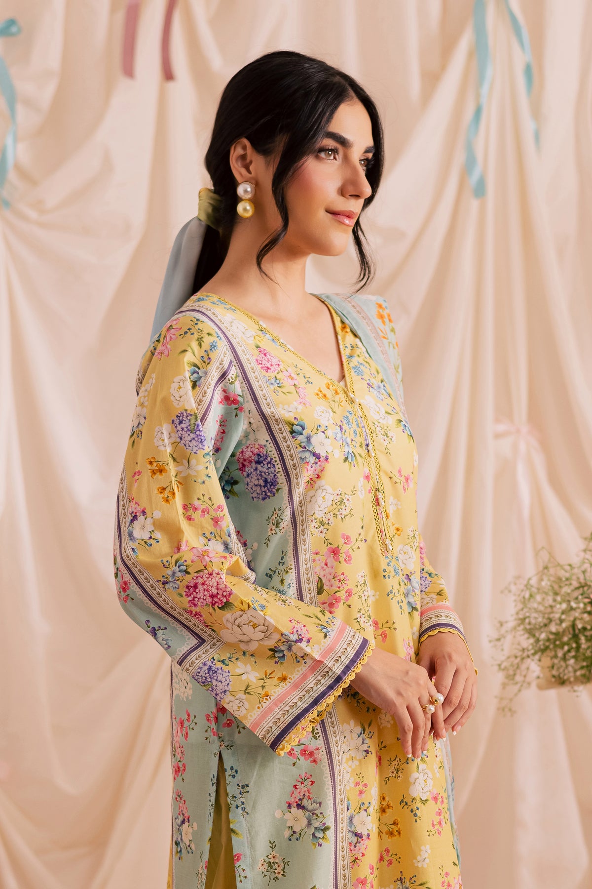 A printed yellow lawn shirt enhanced with delicate lace detailing gracefully adorns the neckline and sleeves, adding an exquisite touch of refinement. The intricate lacework beautifully contrasts with the print, creating a harmonious blend of texture and design.