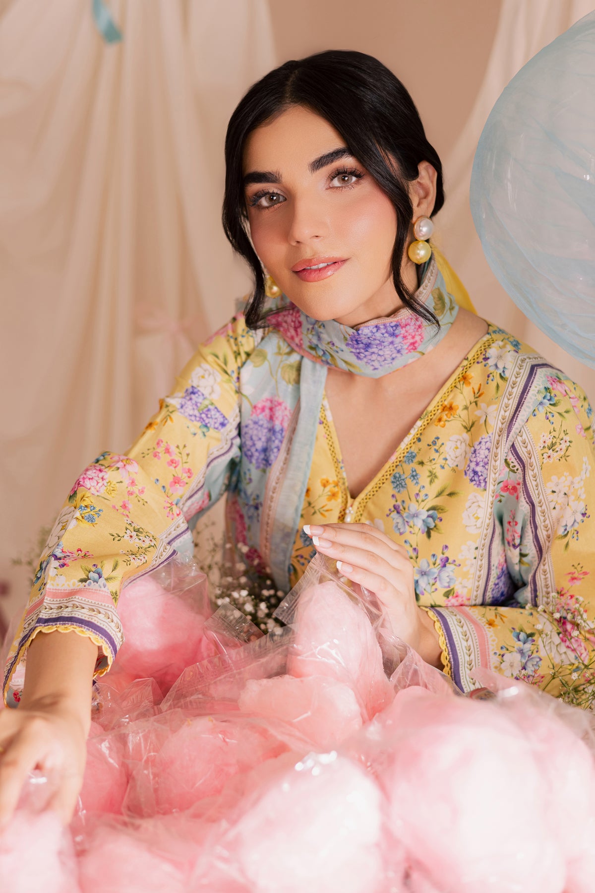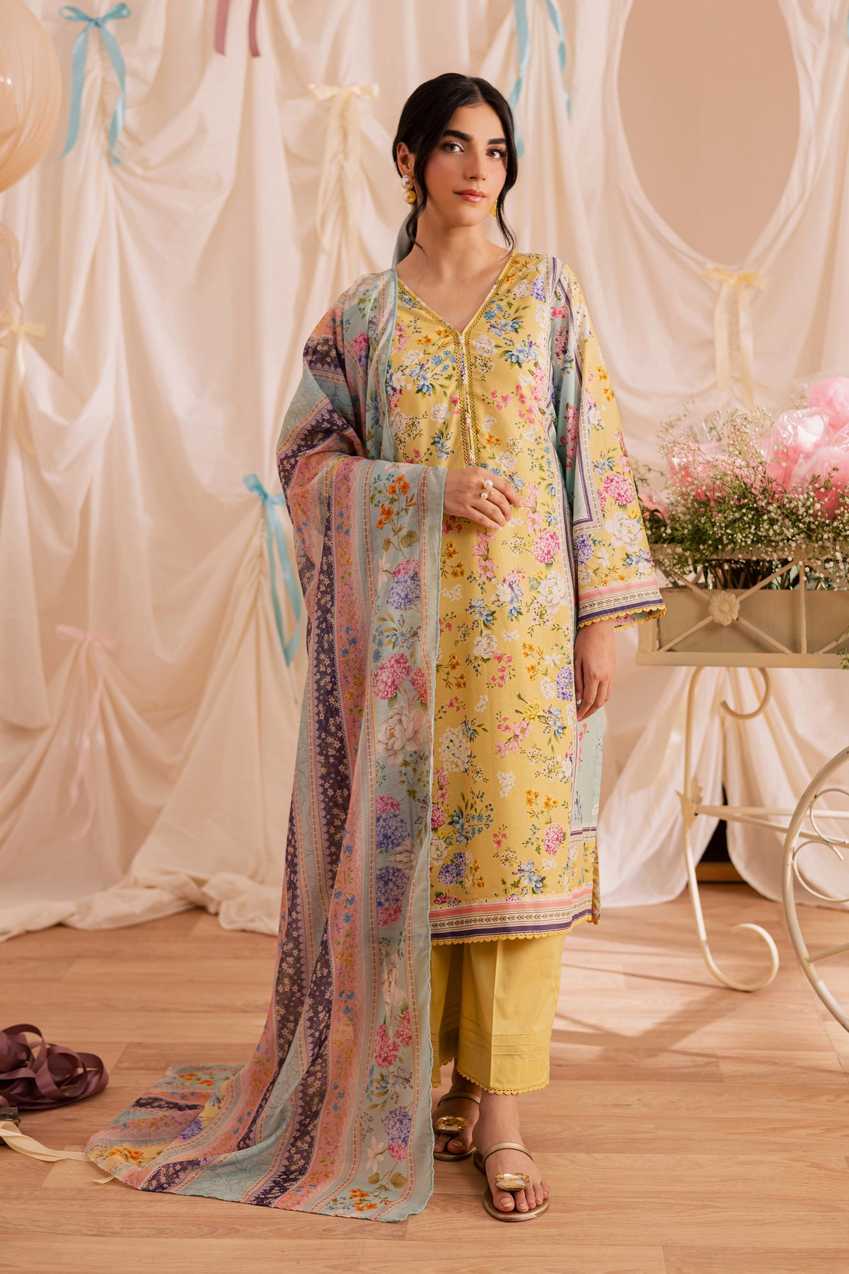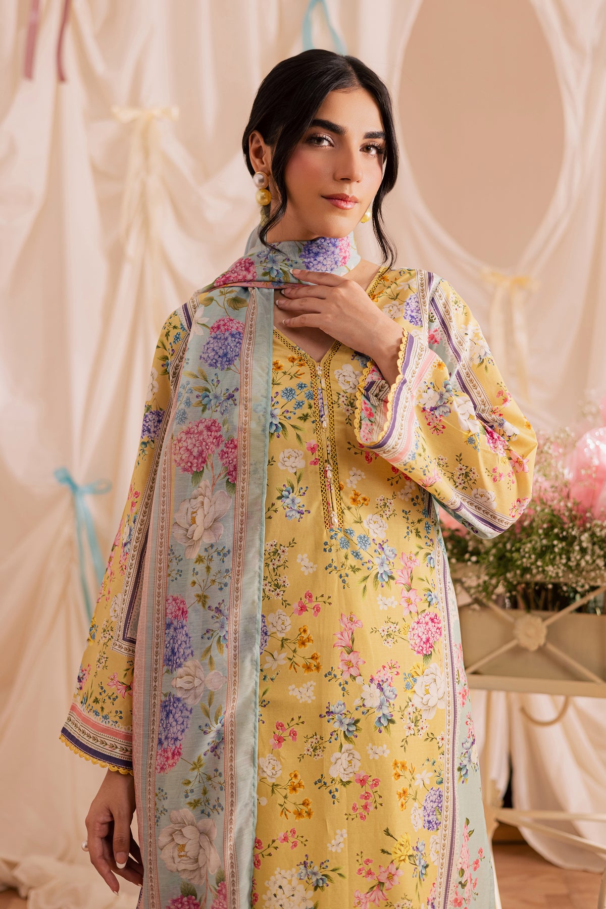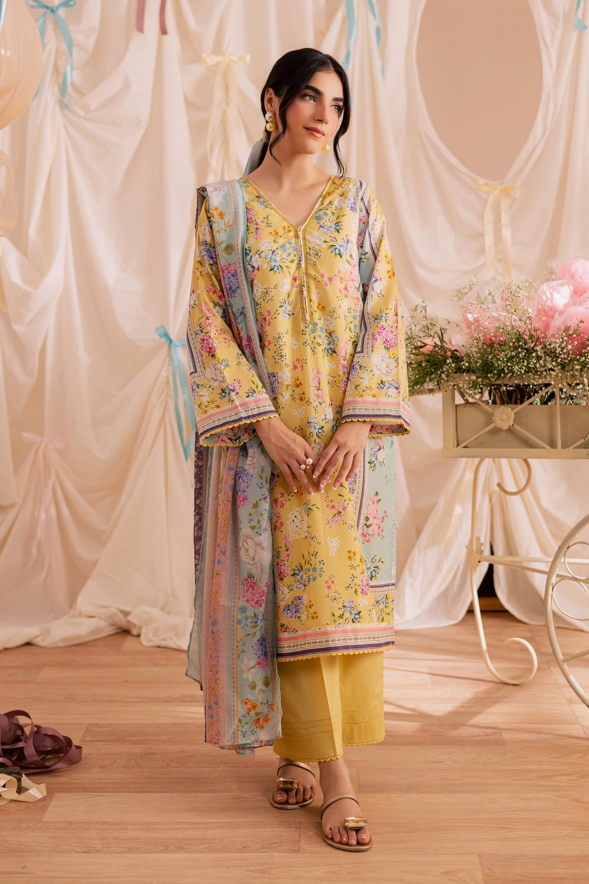 A printed yellow lawn shirt enhanced with delicate lace detailing gracefully adorns the neckline and sleeves, adding an exquisite touch of refinement. The intricate lacework beautifully contrasts with the print, creating a harmonious blend of texture and design.