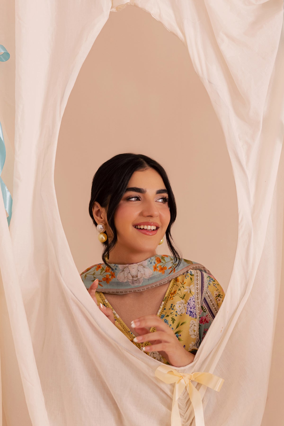 Completing the look, a printed Swiss voile dupatta drapes softly, its light and airy fabric showcasing subtle patterns that bring a gentle, graceful flow to the entire outfit.