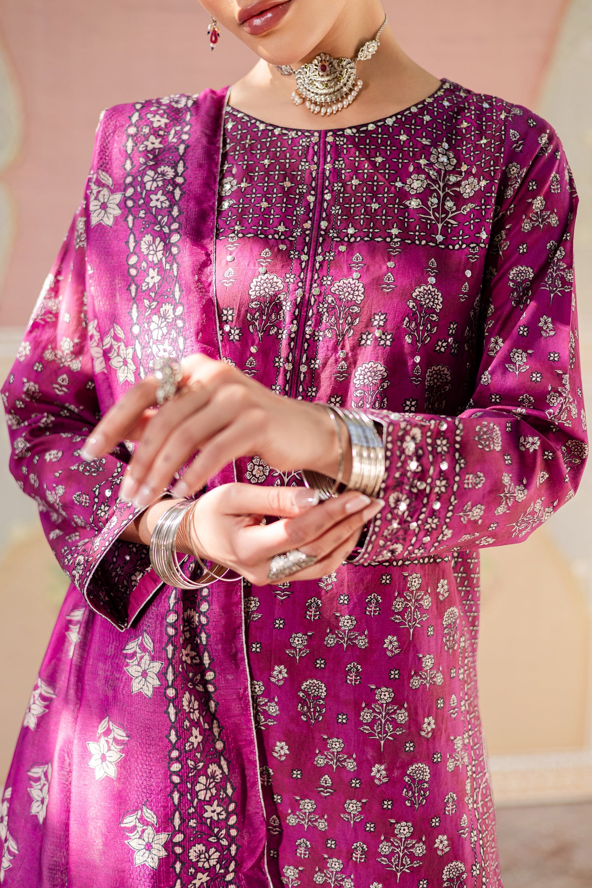 This long, composed pink printed lawn shirt features intricate silver mukesh at the neckline and sleeve hem, offering a subtle yet striking sparkle. The shirt is beautifully finished with dori lace, adding a refined and elegant touch to the design.