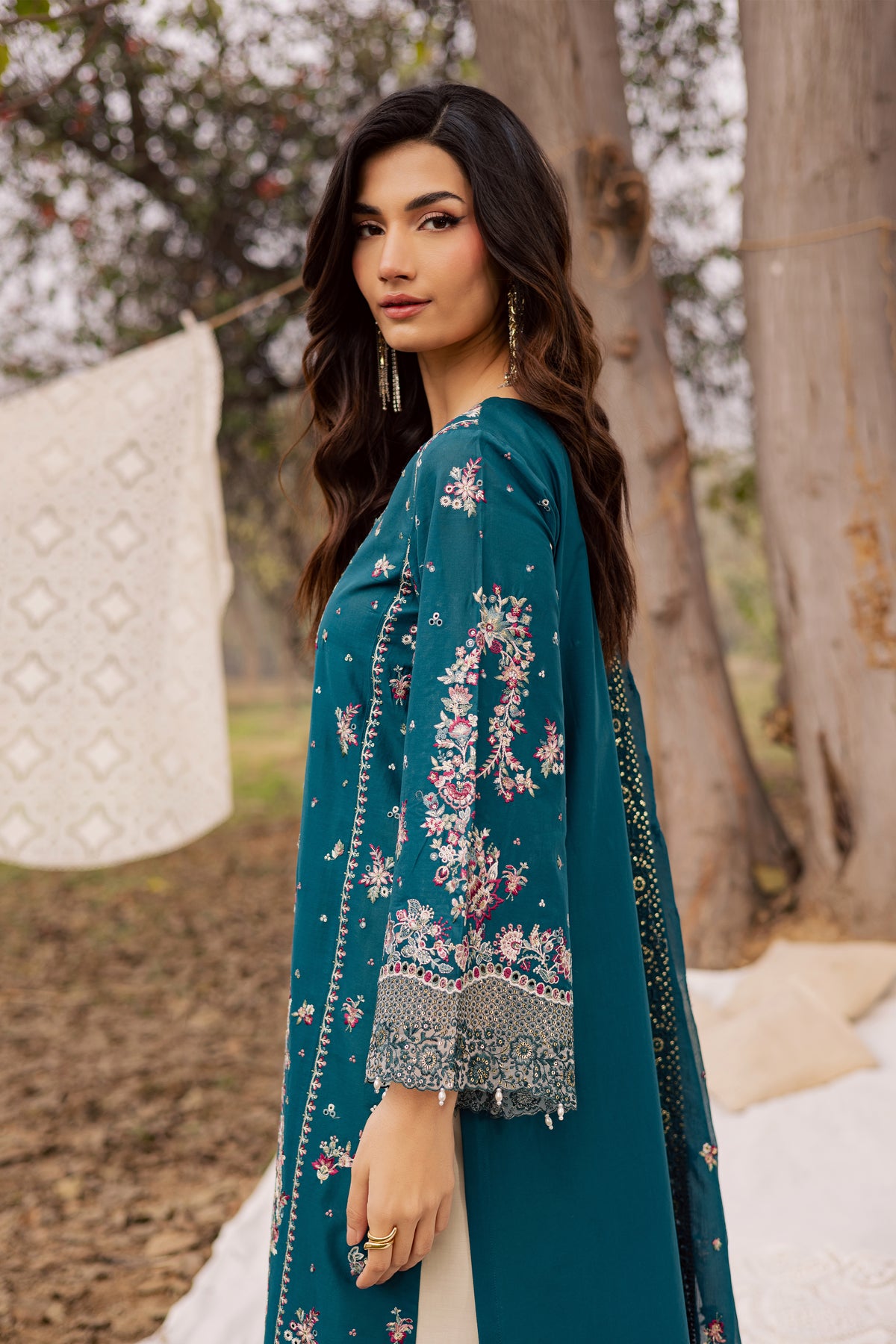 This festive 3pc set in Pima lawn features a flared four-panel zinc shirt with heavy composed embroidery, contrasting organza borders, pearl hangings at the hem, and embroidered flared sleeves. Kavya detailing and side-panel embroidery elevate the luxurious Eid look.