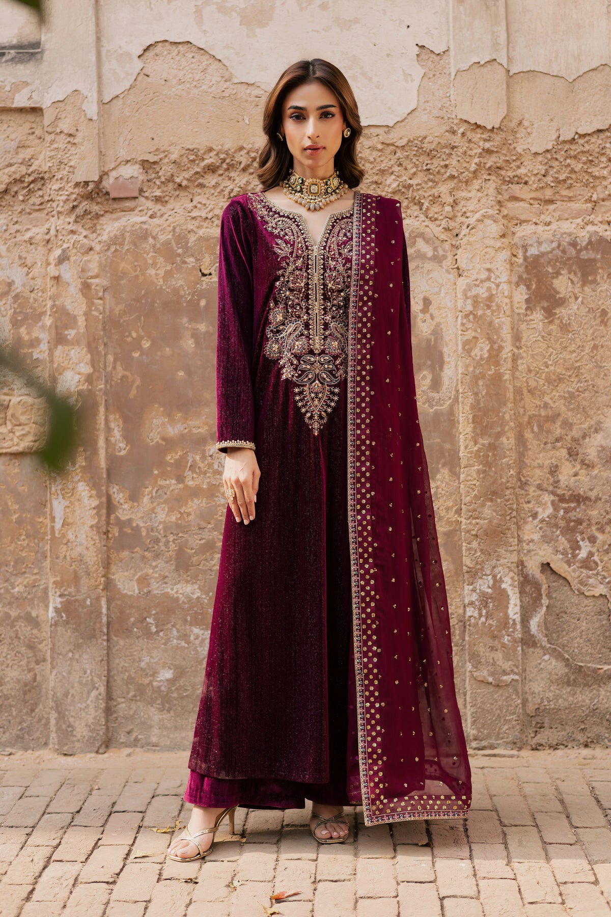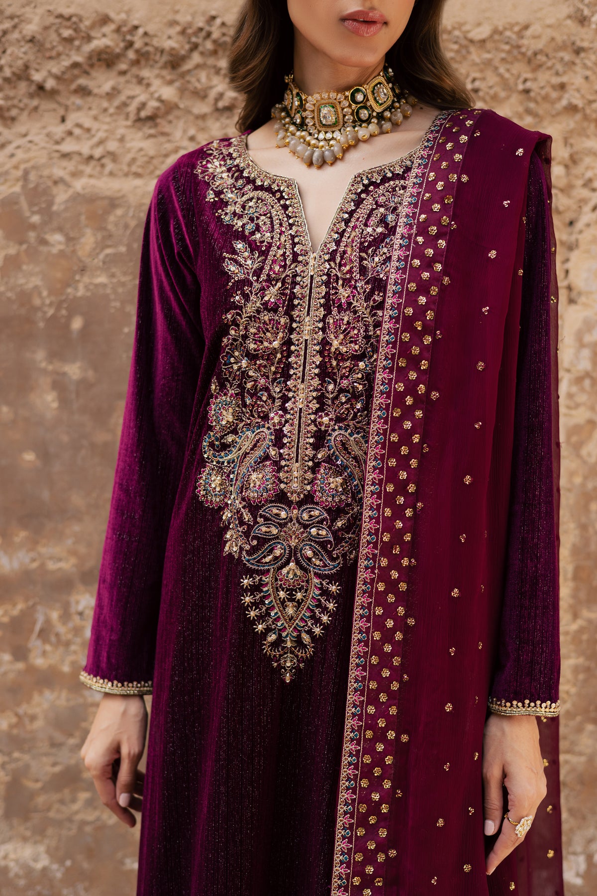 This three piece velvet set features a long fancy line shirt with a composed embroidered neckline enhanced with adda work detailing. The full fitted sleeves are finished with adda work at the cuffs, adding a refined and structured touch to the design.