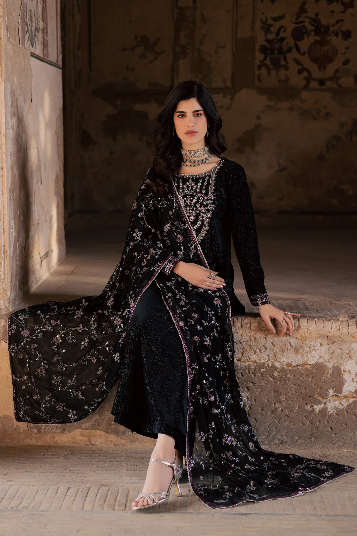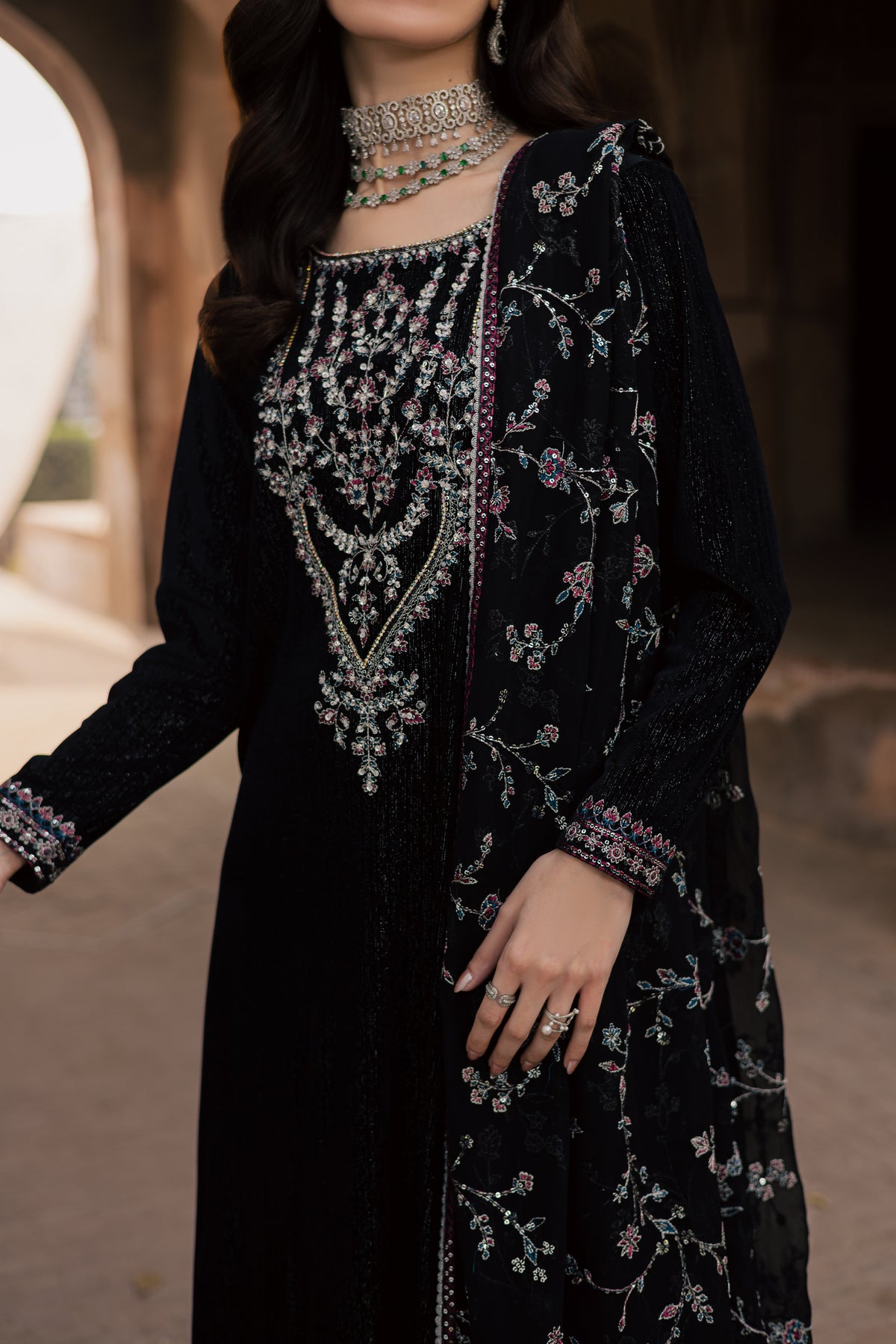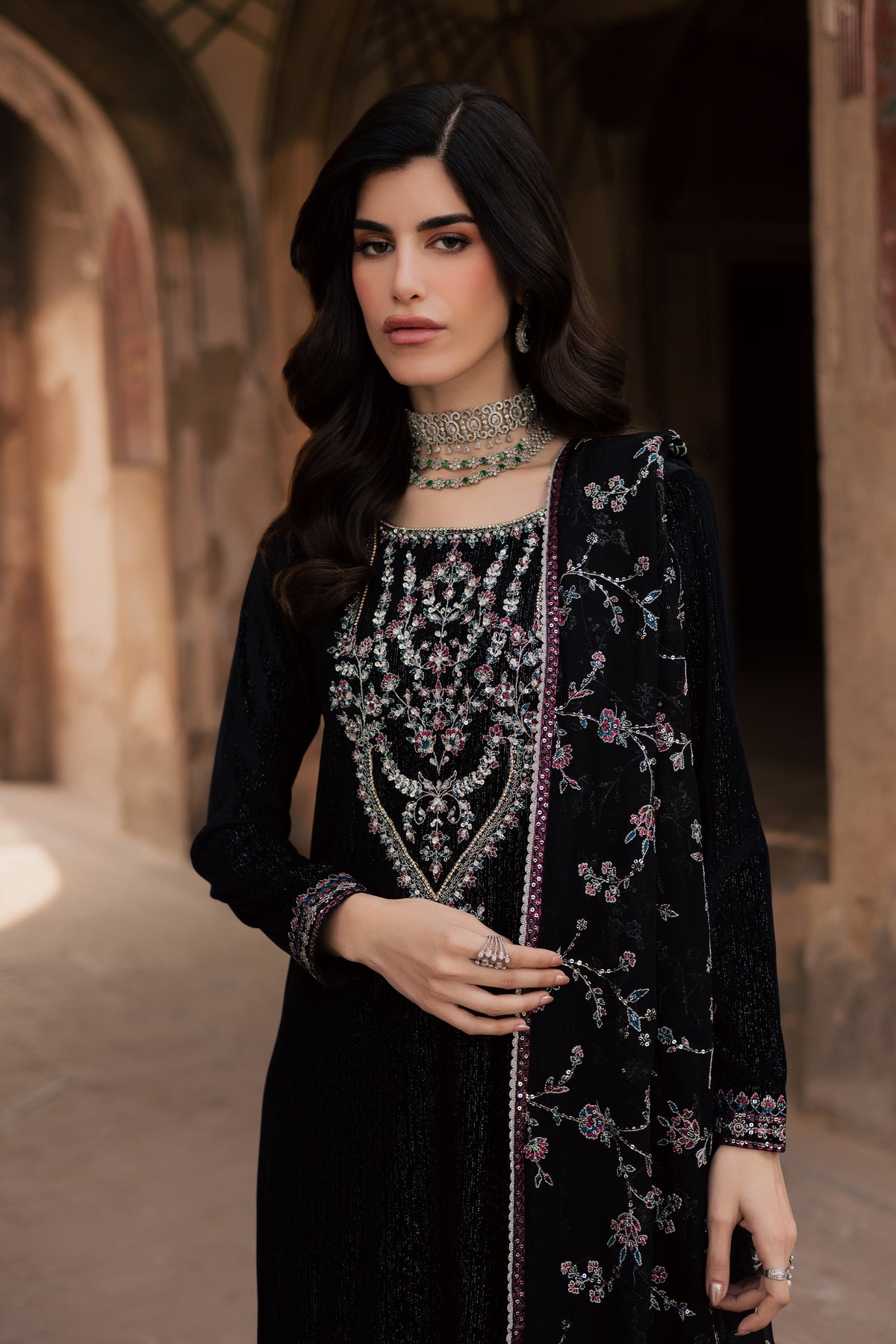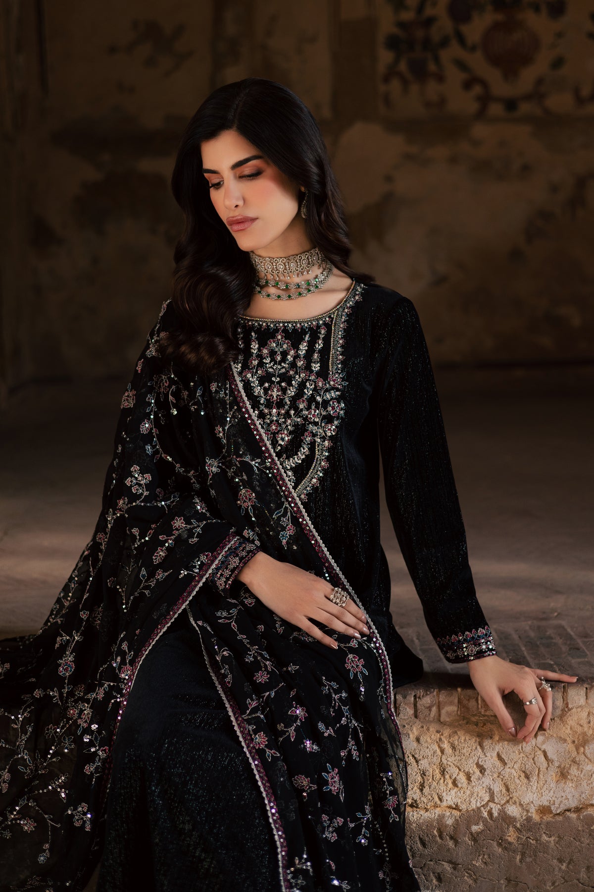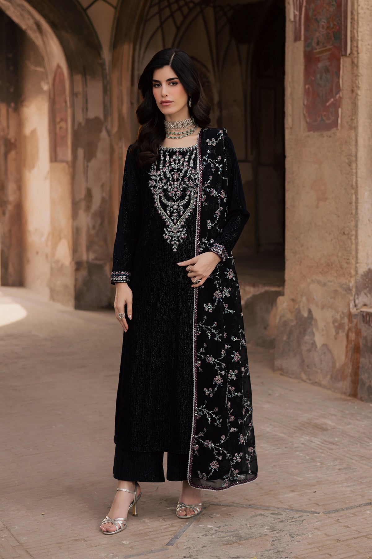This three piece black velvet set features a black textured velvet shirt with an embroidered neckline detailed with silver tilla and sequin work. The neckline is enhanced with adda work, while the sleeves are finished with embroidered borders and lace at the hem for a refined finish.