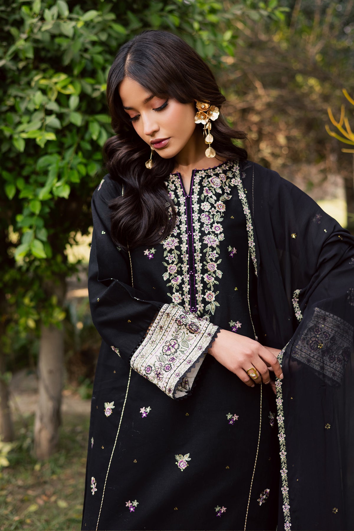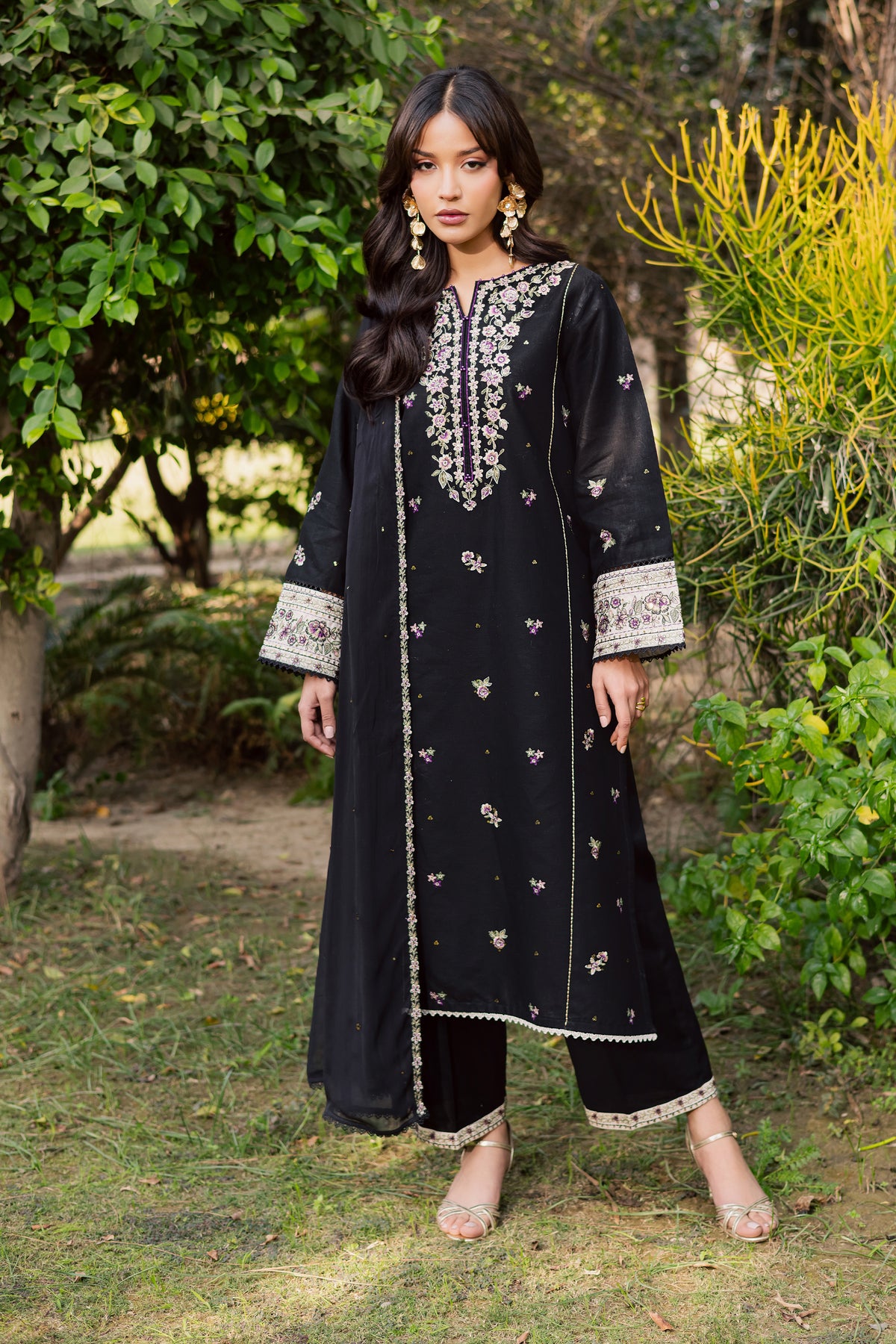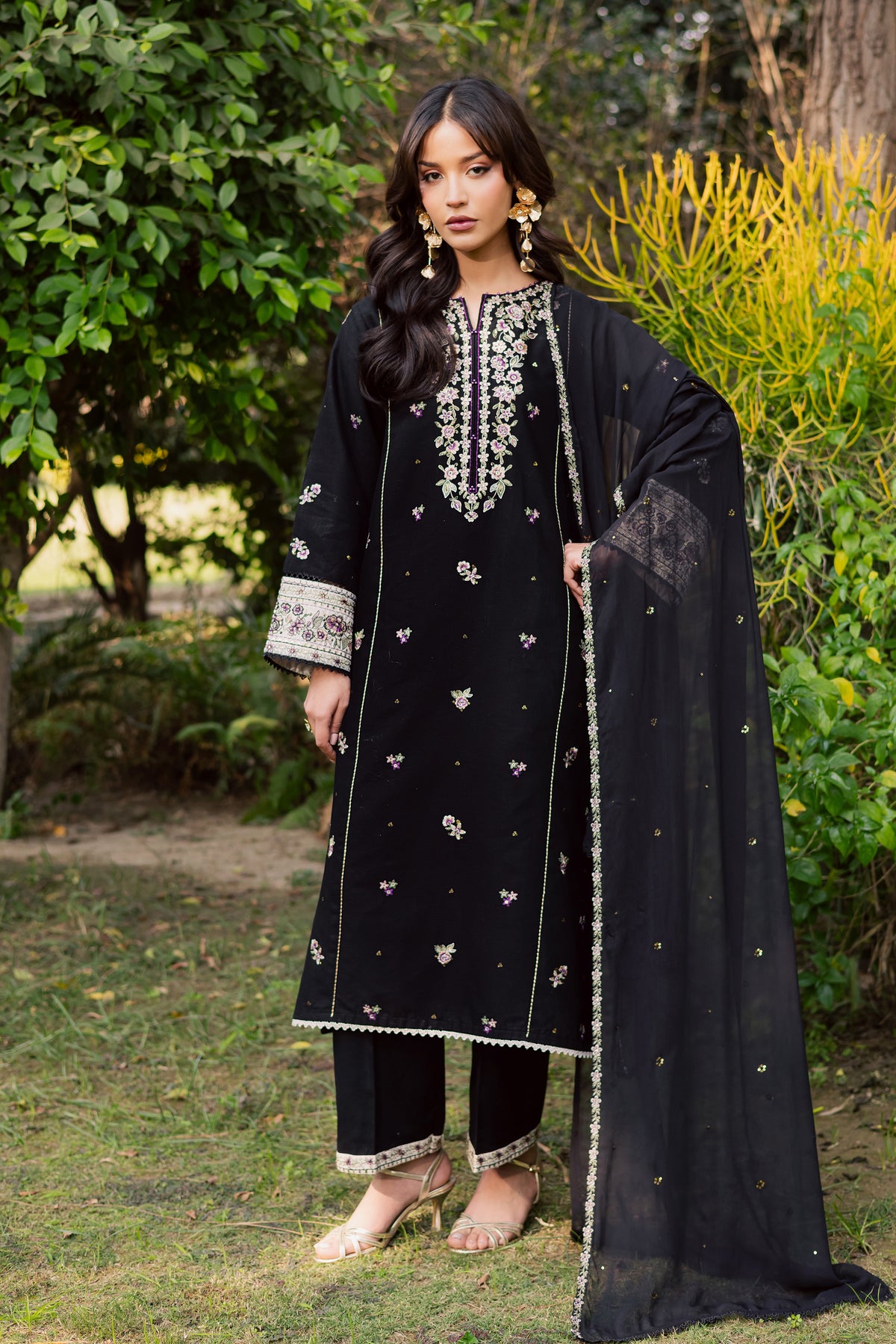 This three paneled long khaddar shirt features an embroidered neckline with a sequined spread and simple lace finishing. The wide sleeves showcase embroidery on contrast fabric at the hem, finished with delicate lace for a graceful touch.