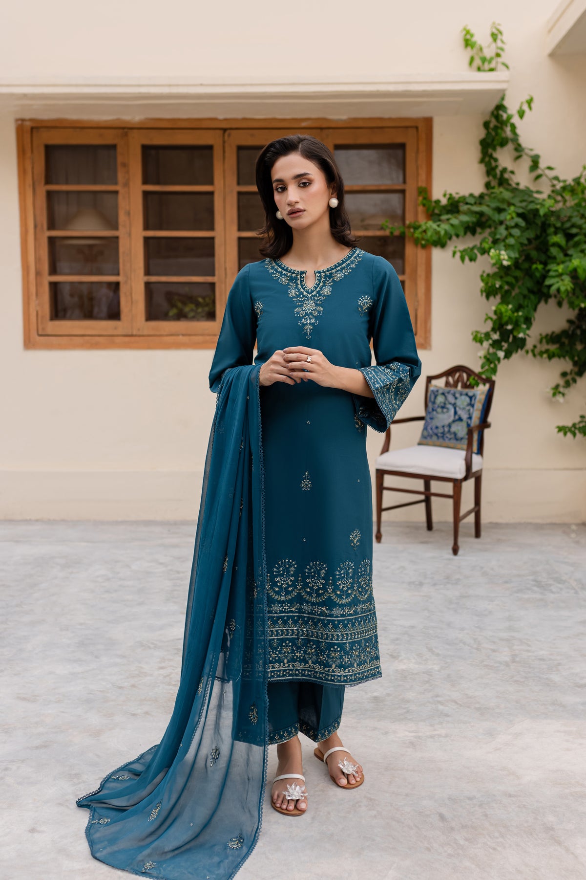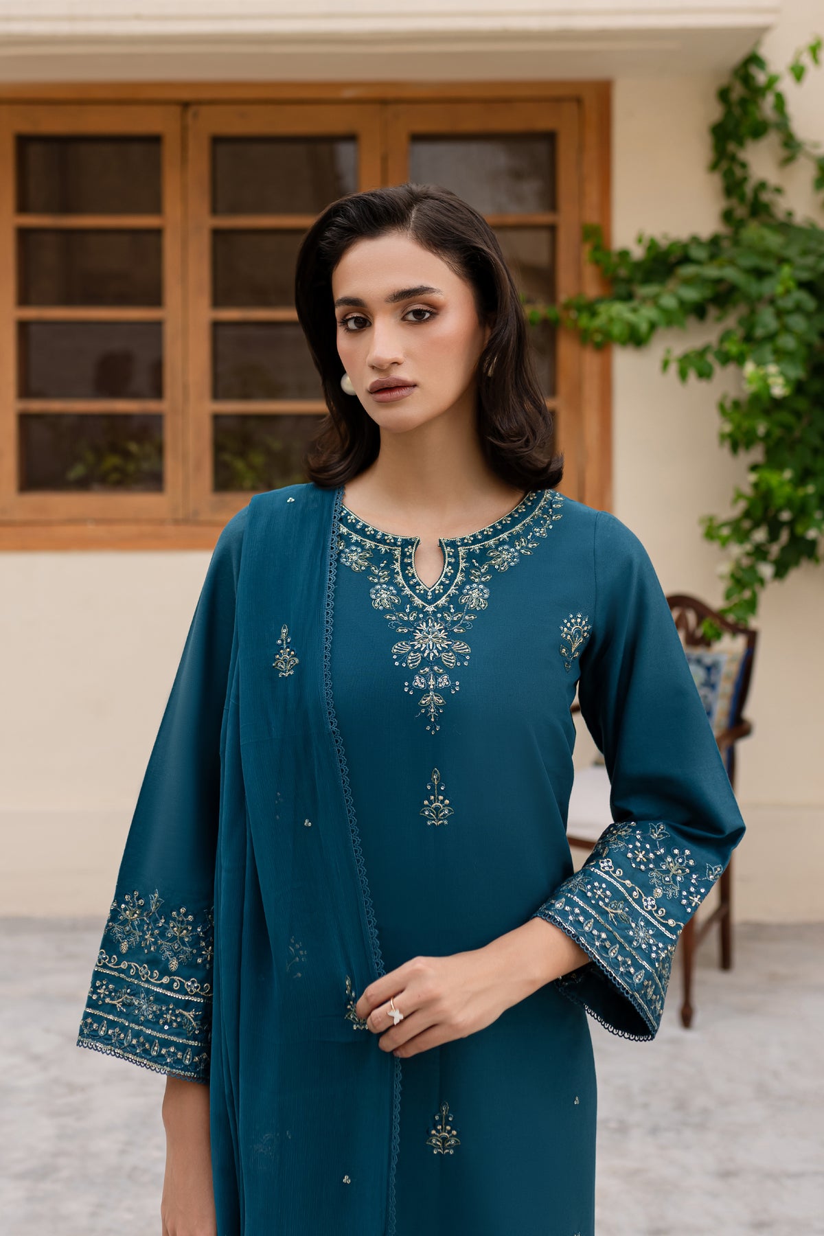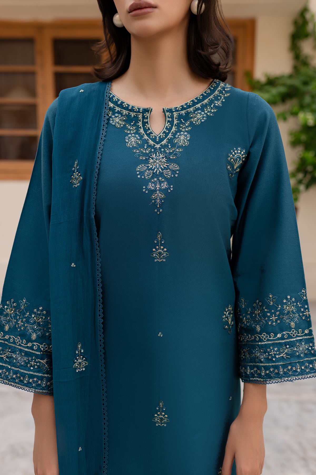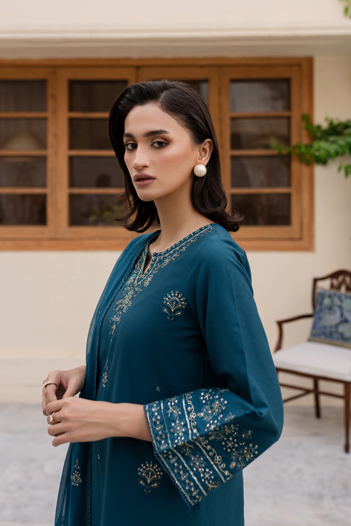 Embrace the charm of this prussian colored ensemble, featuring a fully embroidered khaddar shirt with intricate embroidery gracing the sleeves, neckline, and hemline for a polished finish.