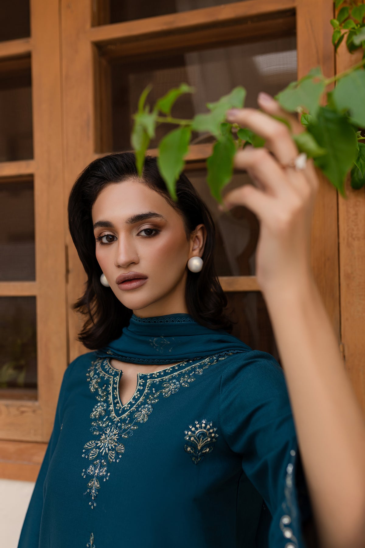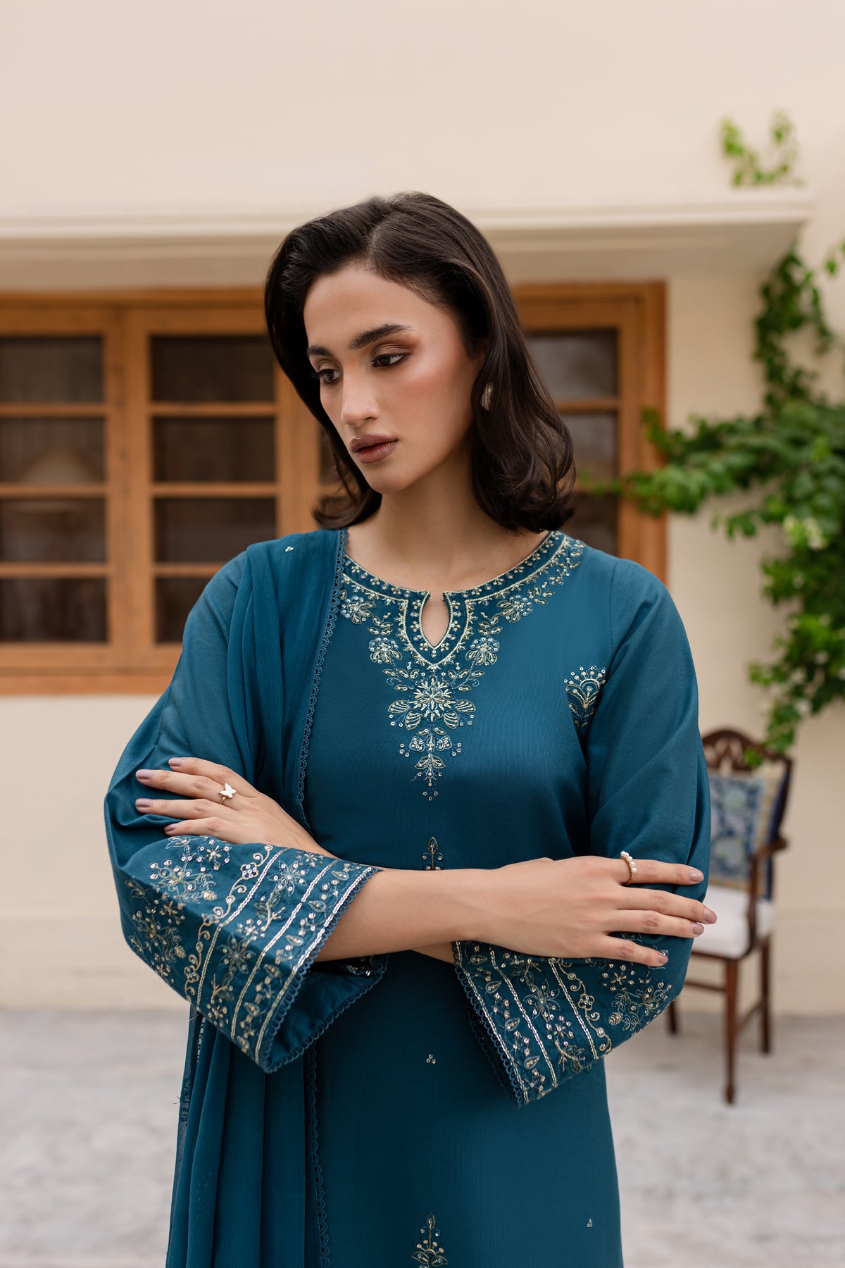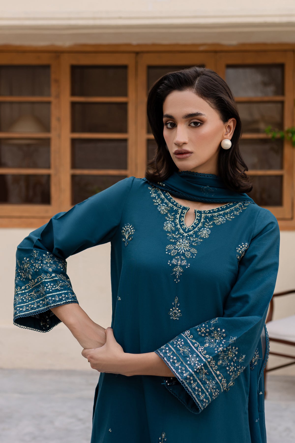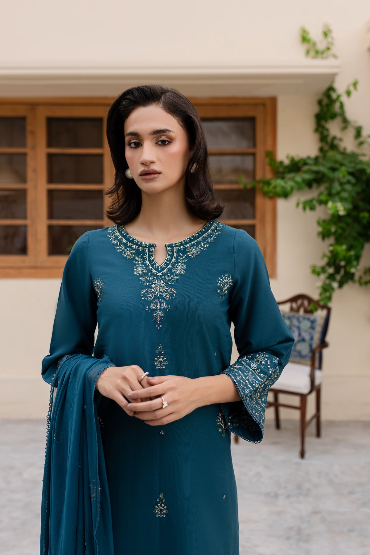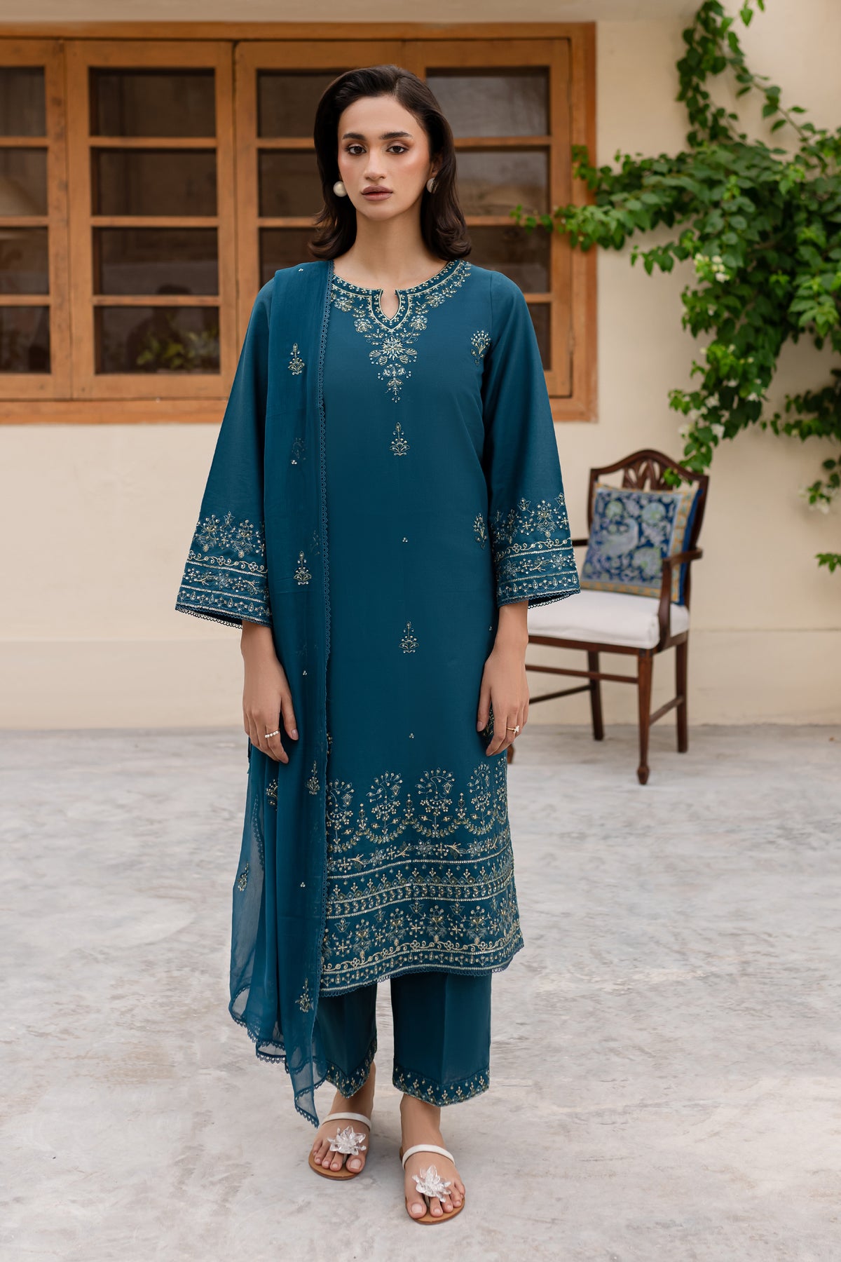 Embrace the charm of this prussian colored ensemble, featuring a fully embroidered khaddar shirt with intricate embroidery gracing the sleeves, neckline, and hemline for a polished finish.