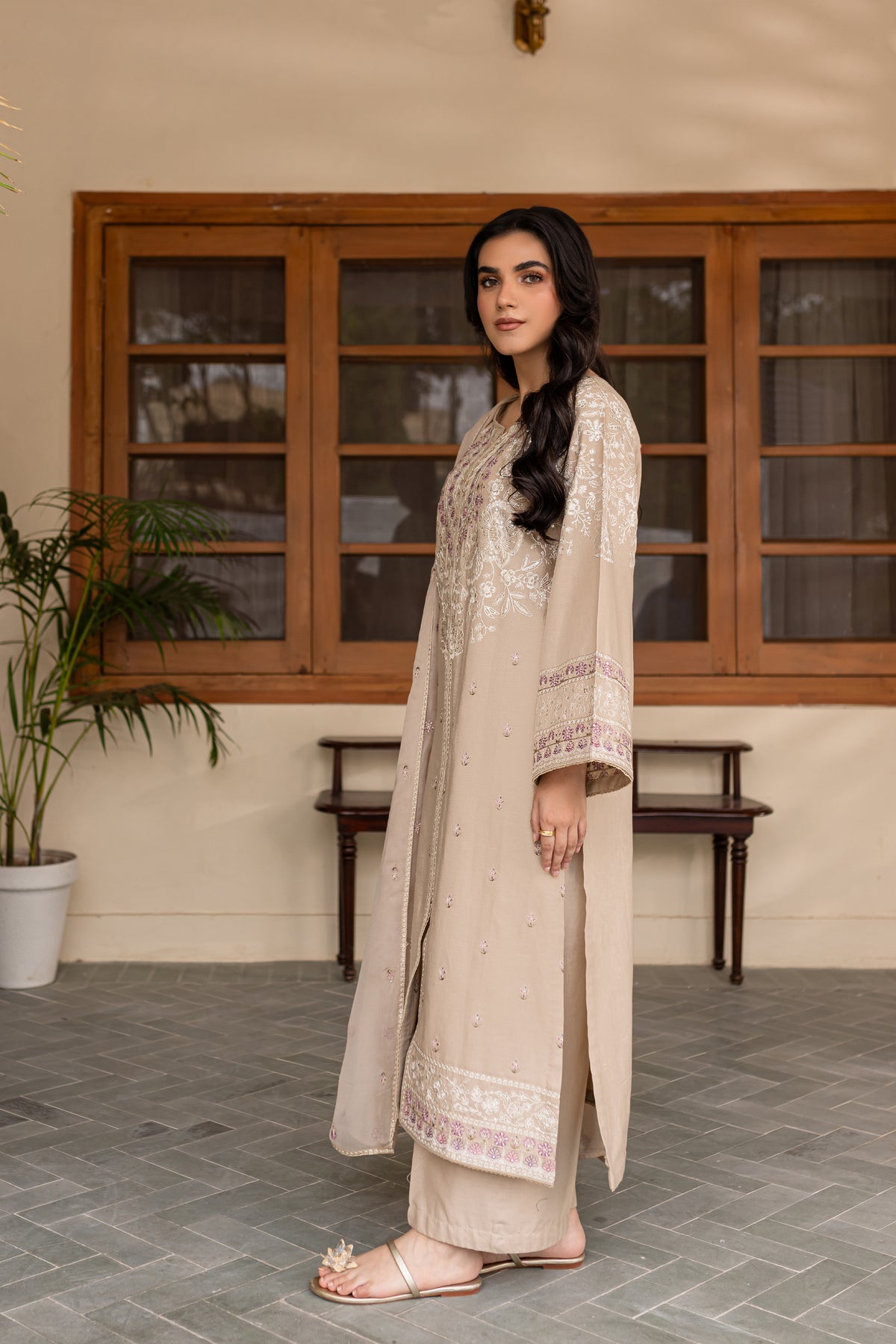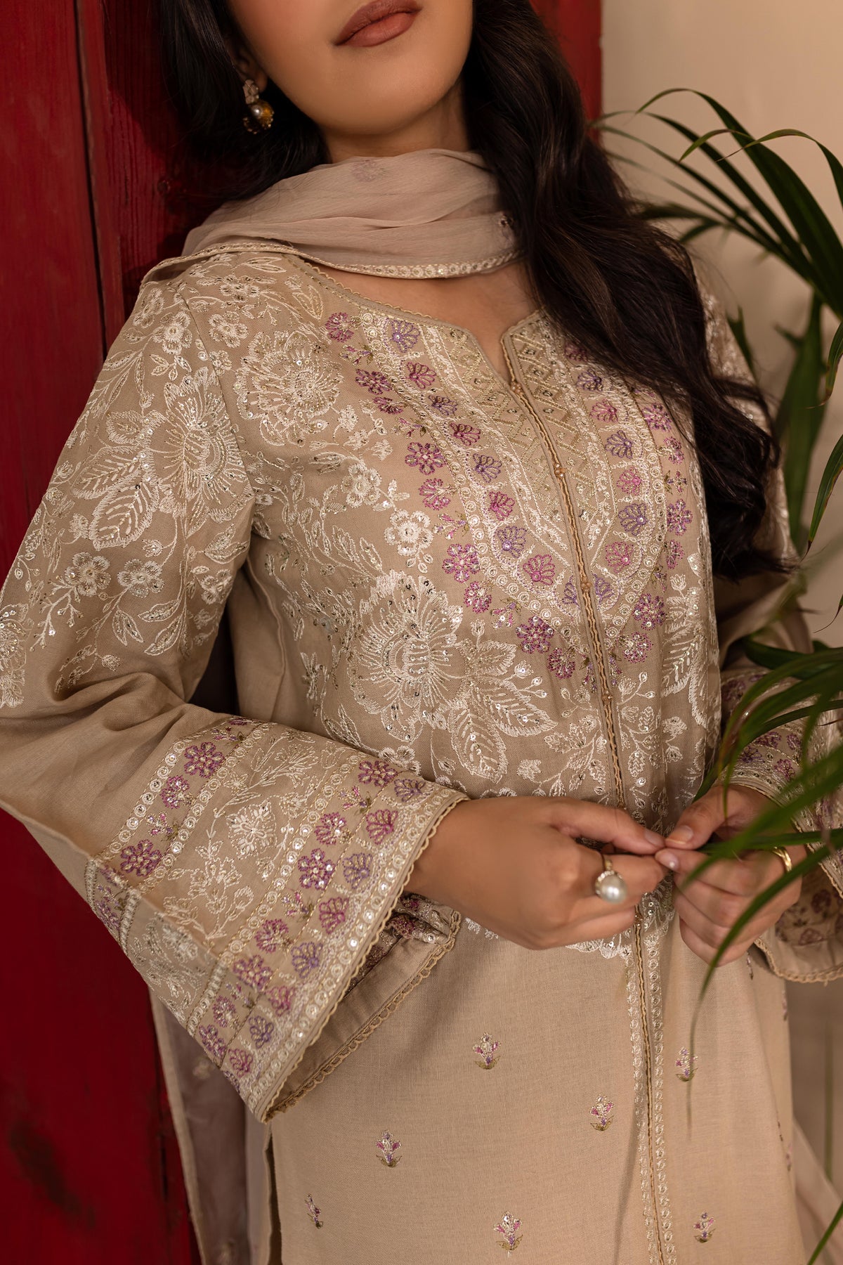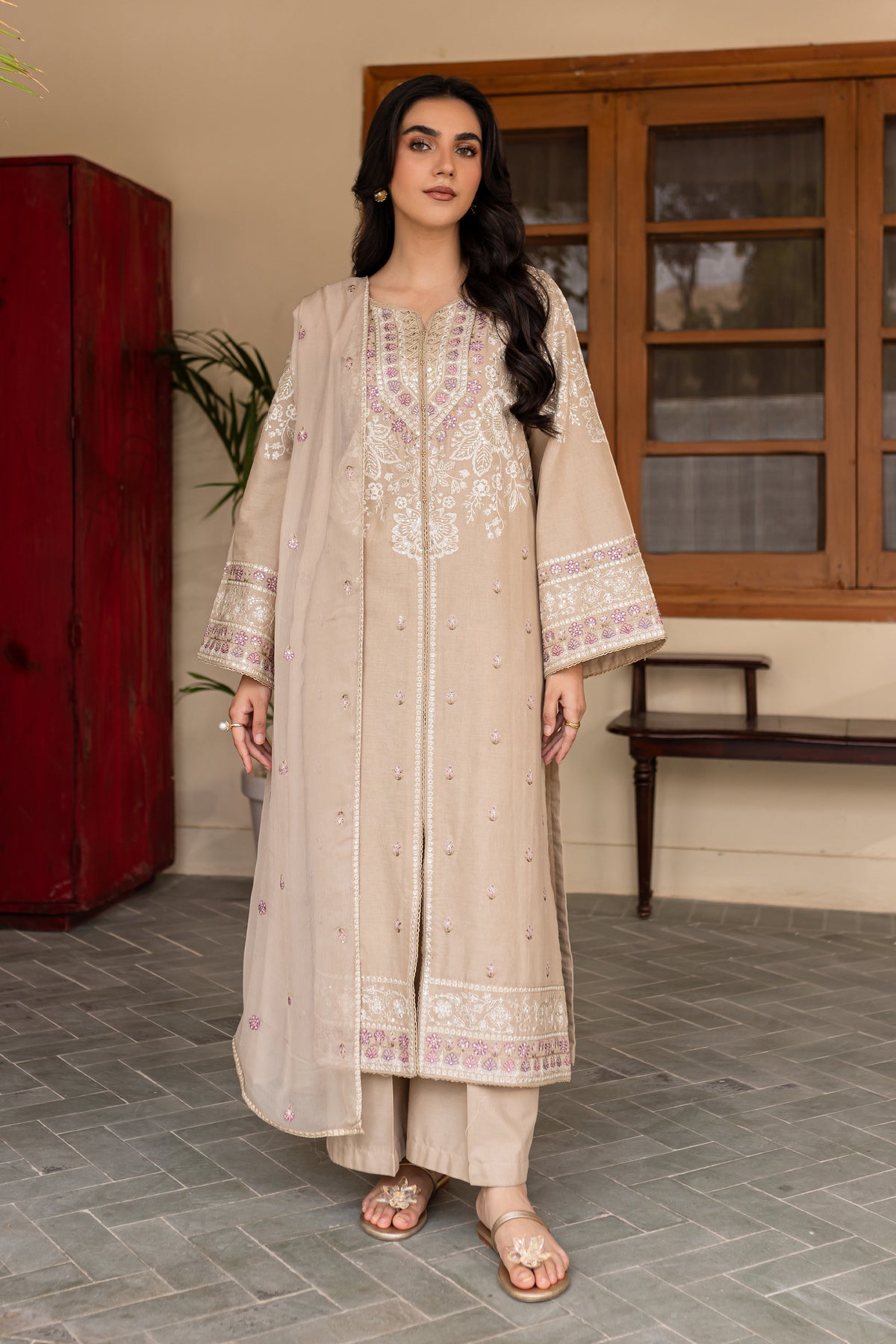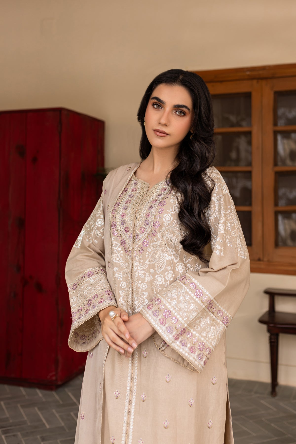 Add versatility to your winter wardrobe by getting your hands on this finest quality khaddar outfit in subtle beige hues. Artfully designed long length shirt features composed embroidered panels and a heavily embroidered neckline continuing on sleeves with embroidered borders at the hem. Finely finished with piping and lace.