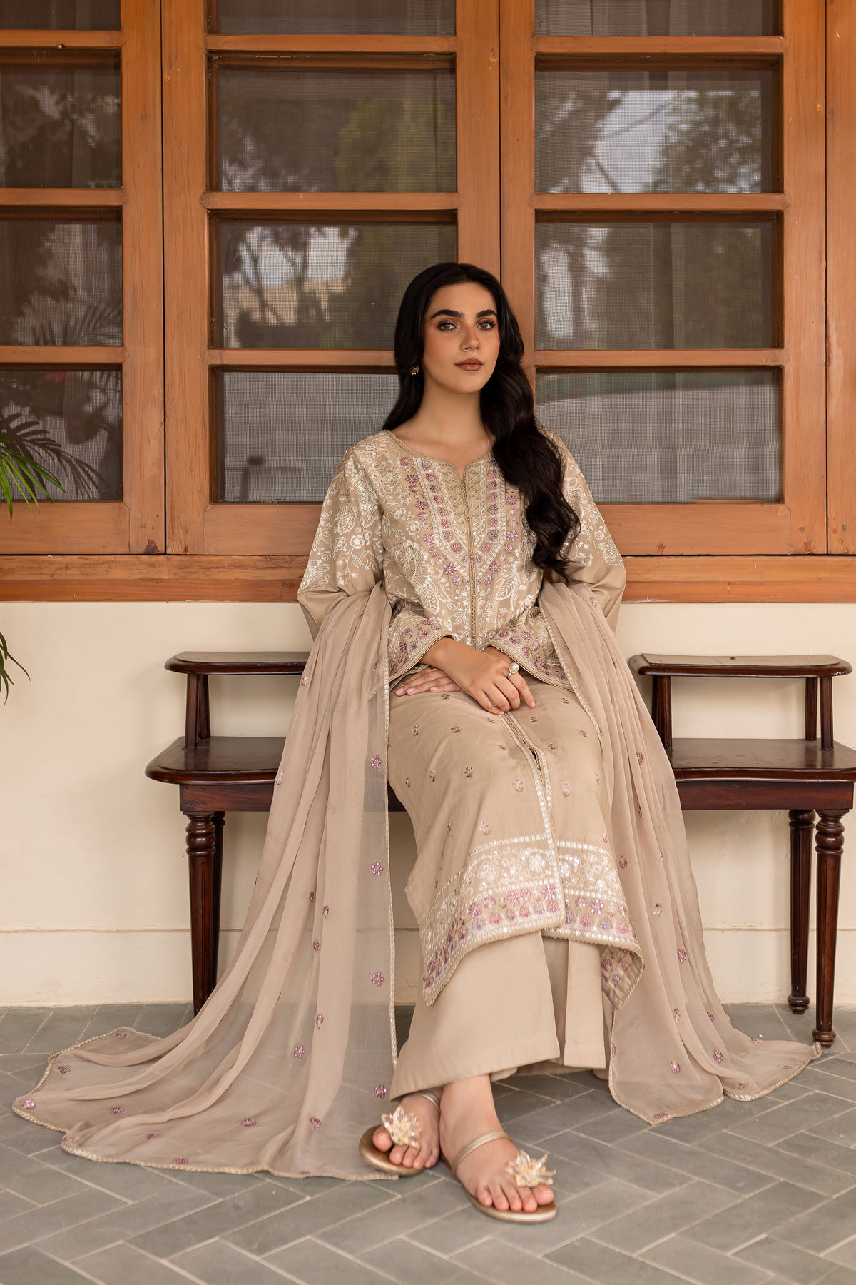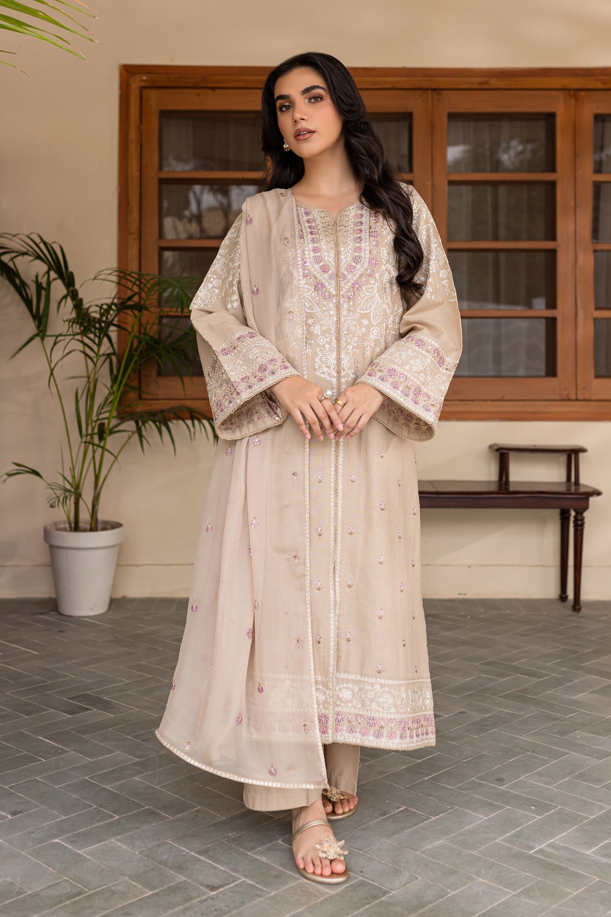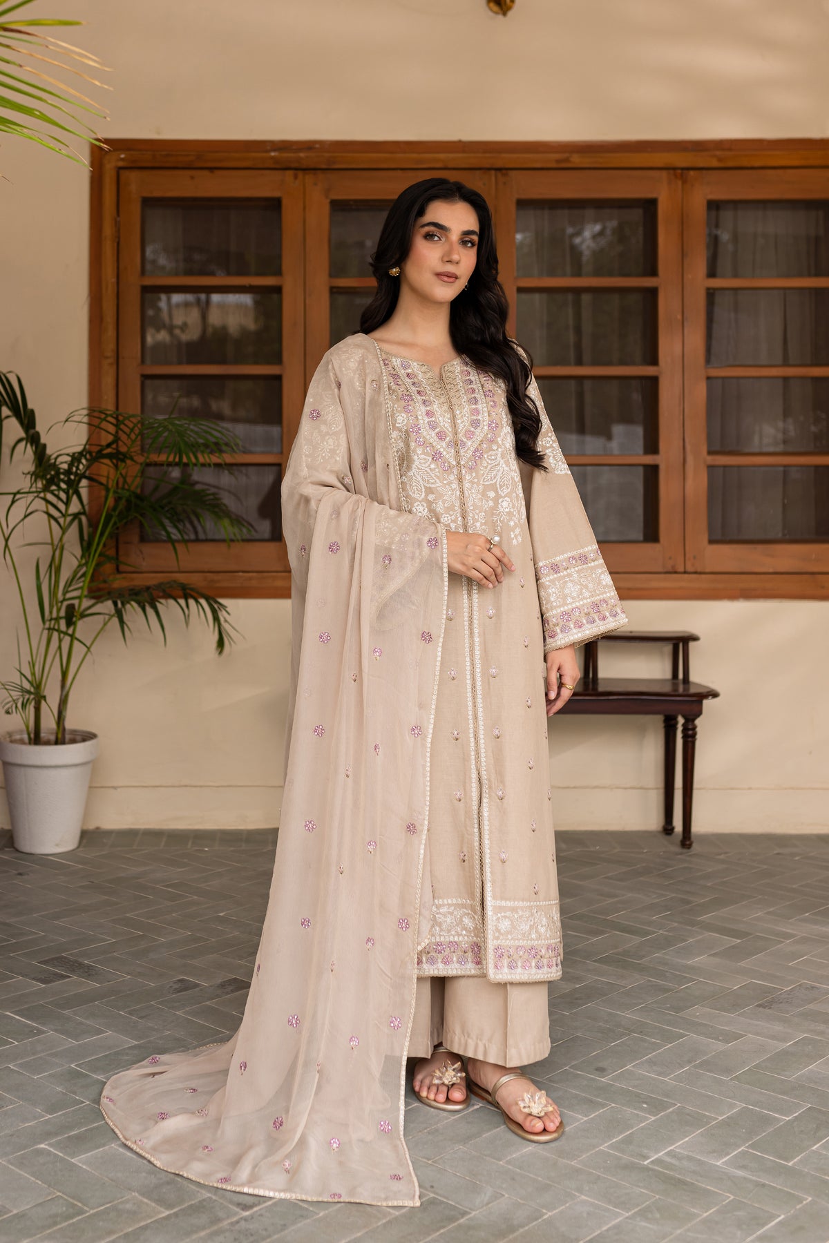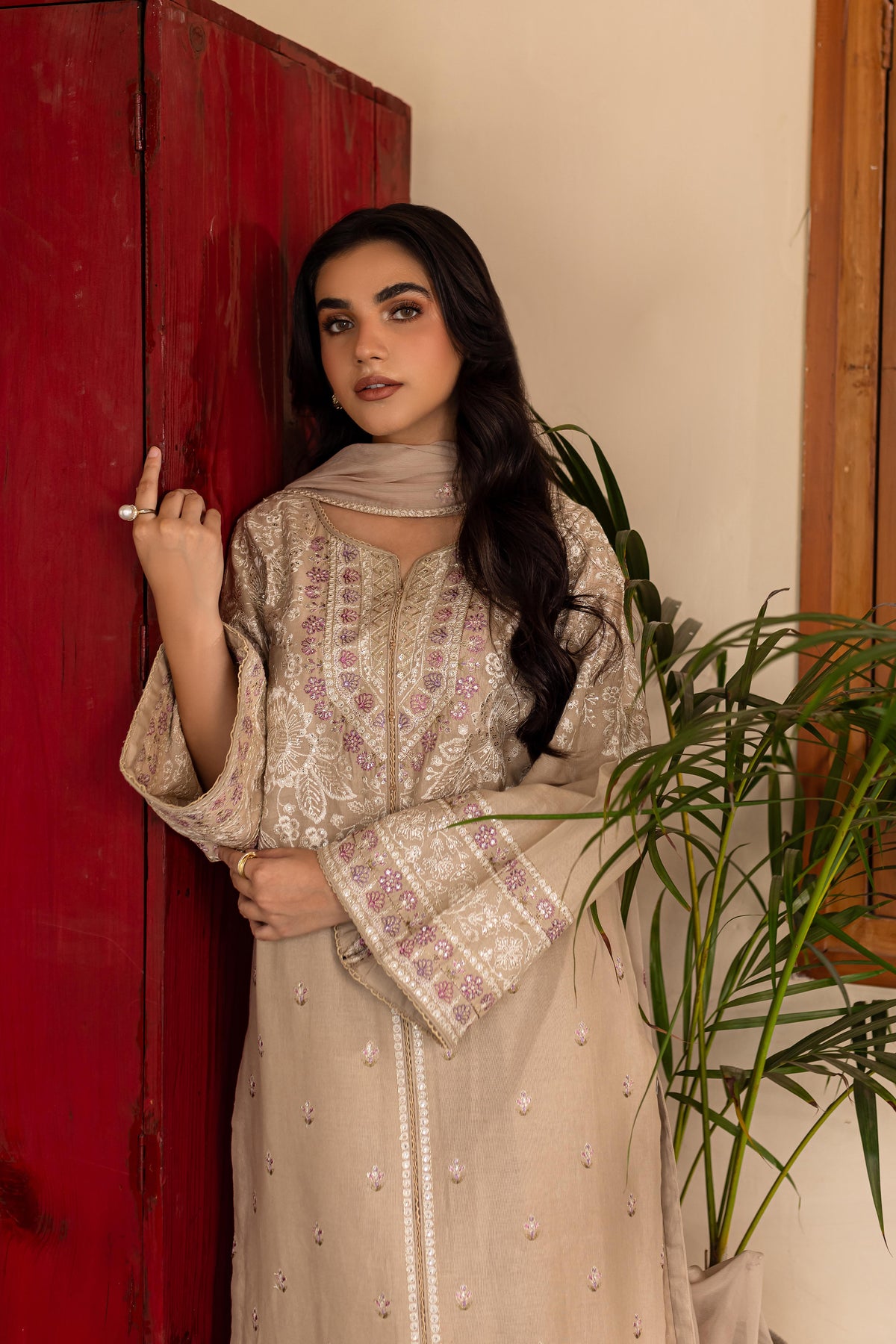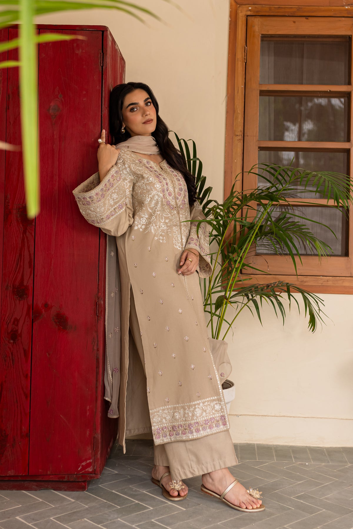 Add versatility to your winter wardrobe by getting your hands on this finest quality khaddar outfit in subtle beige hues. Artfully designed long length shirt features composed embroidered panels and a heavily embroidered neckline continuing on sleeves with embroidered borders at the hem. Finely finished with piping and lace.
