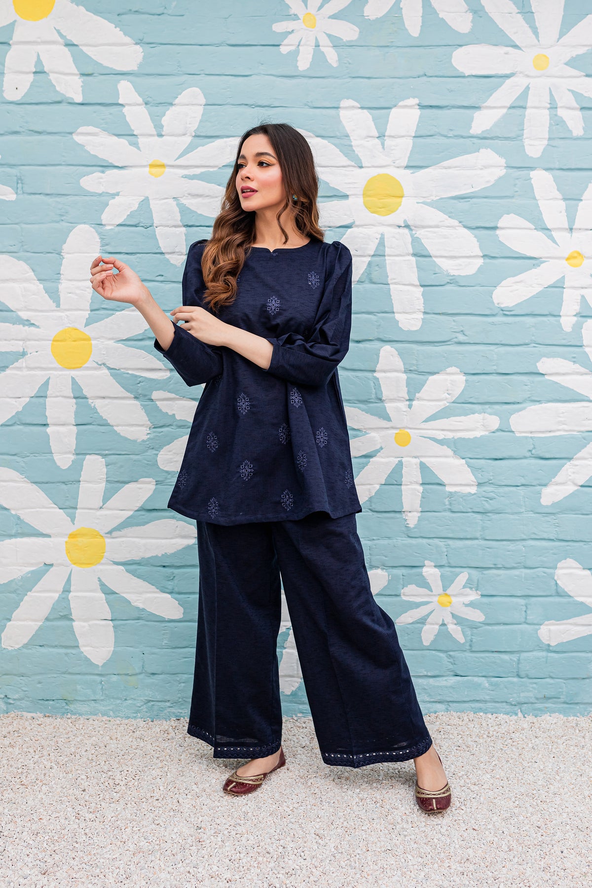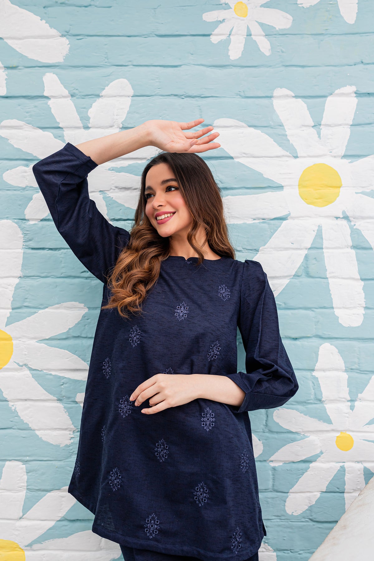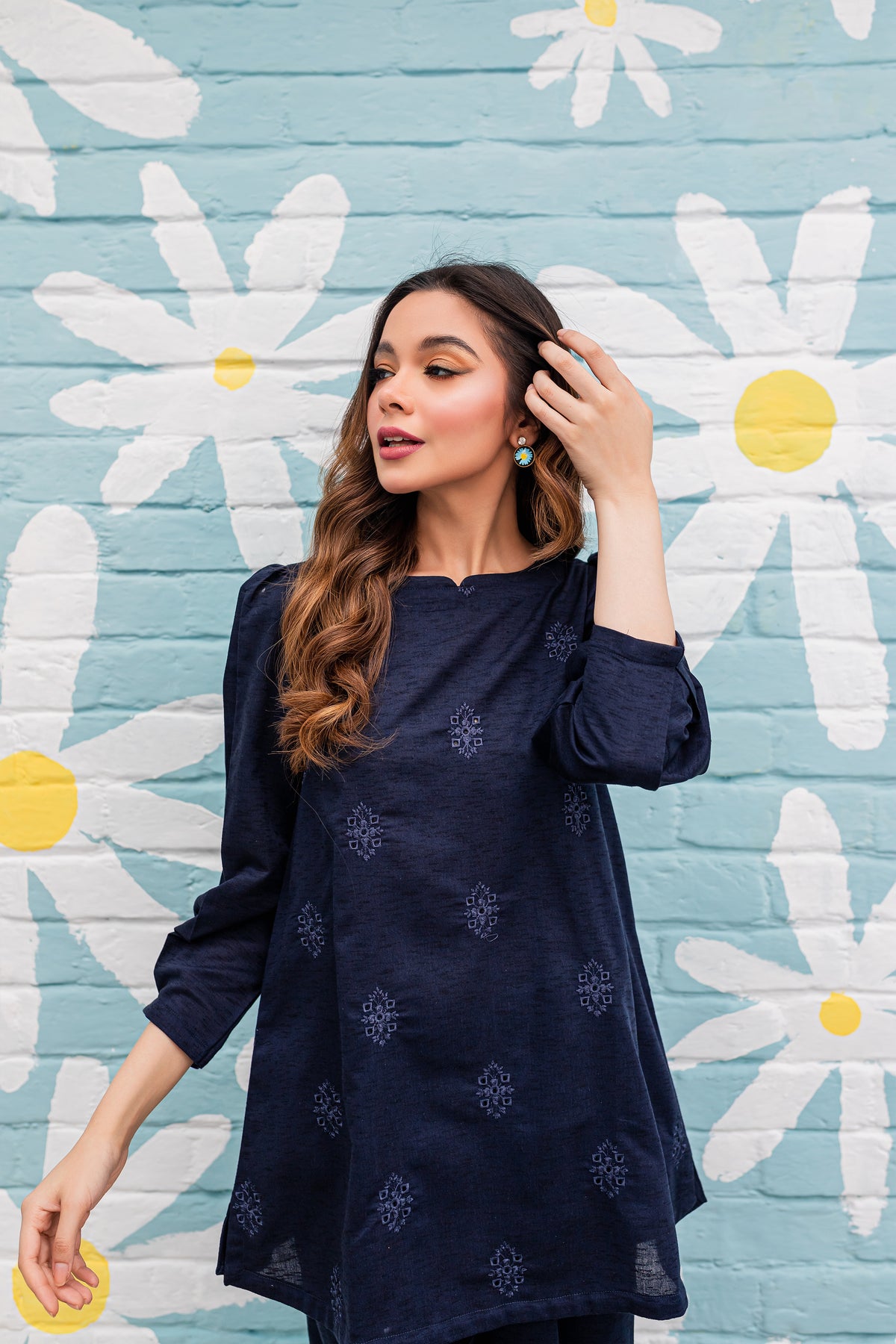Gorgeously crafted mid length tunic cut from the premium quality Karandi in the shades of classic blue. Embellishments feature ban neckline with embroidered front and details of puffer sleeves with cuff finishing