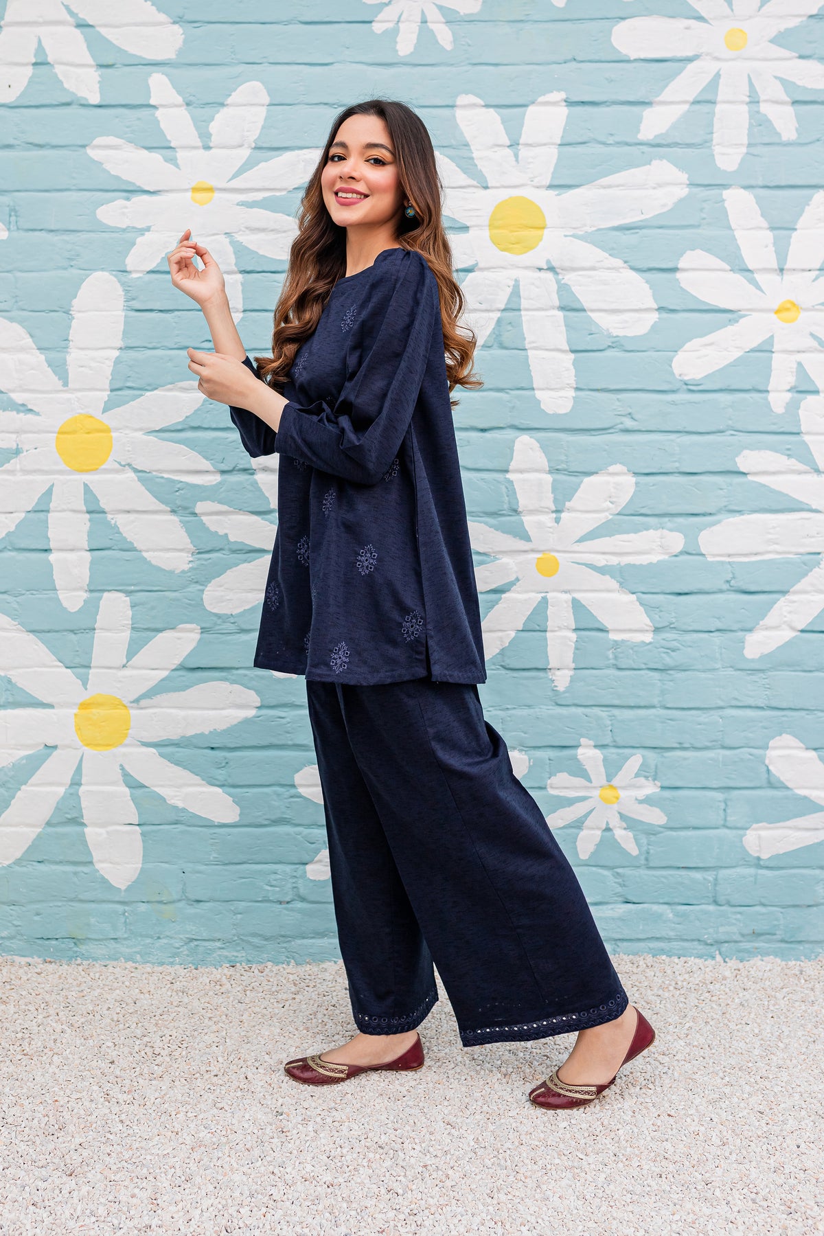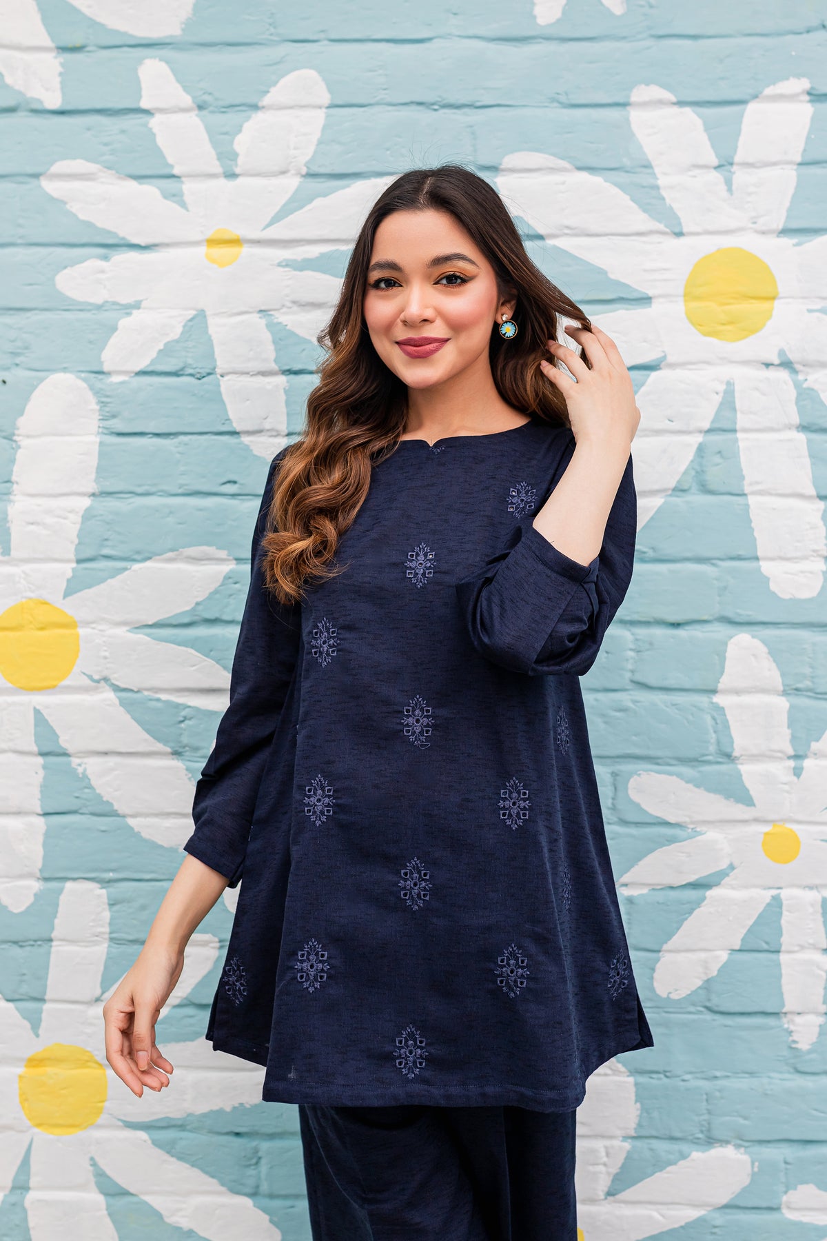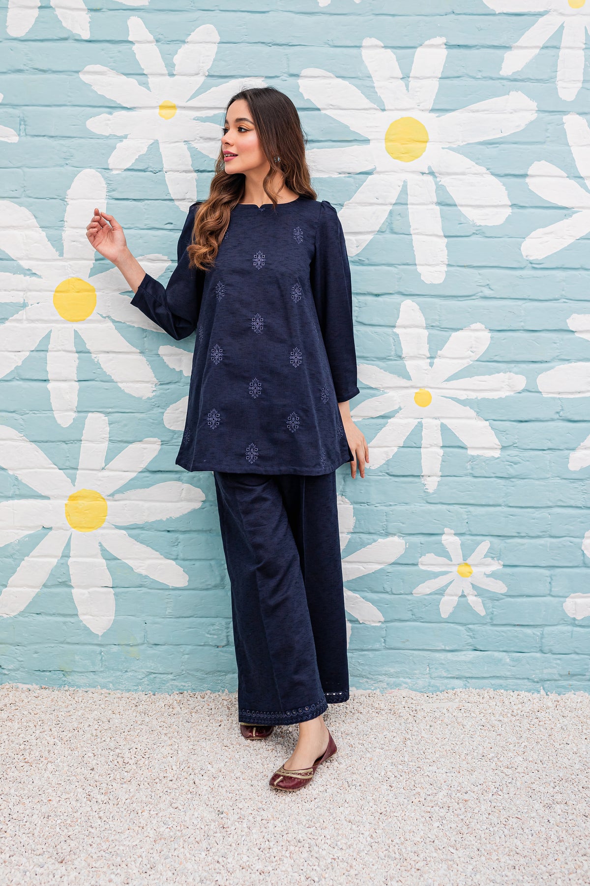 Gorgeously crafted mid length tunic cut from the premium quality Karandi in the shades of classic blue. Embellishments feature ban neckline with embroidered front and details of puffer sleeves with cuff finishing