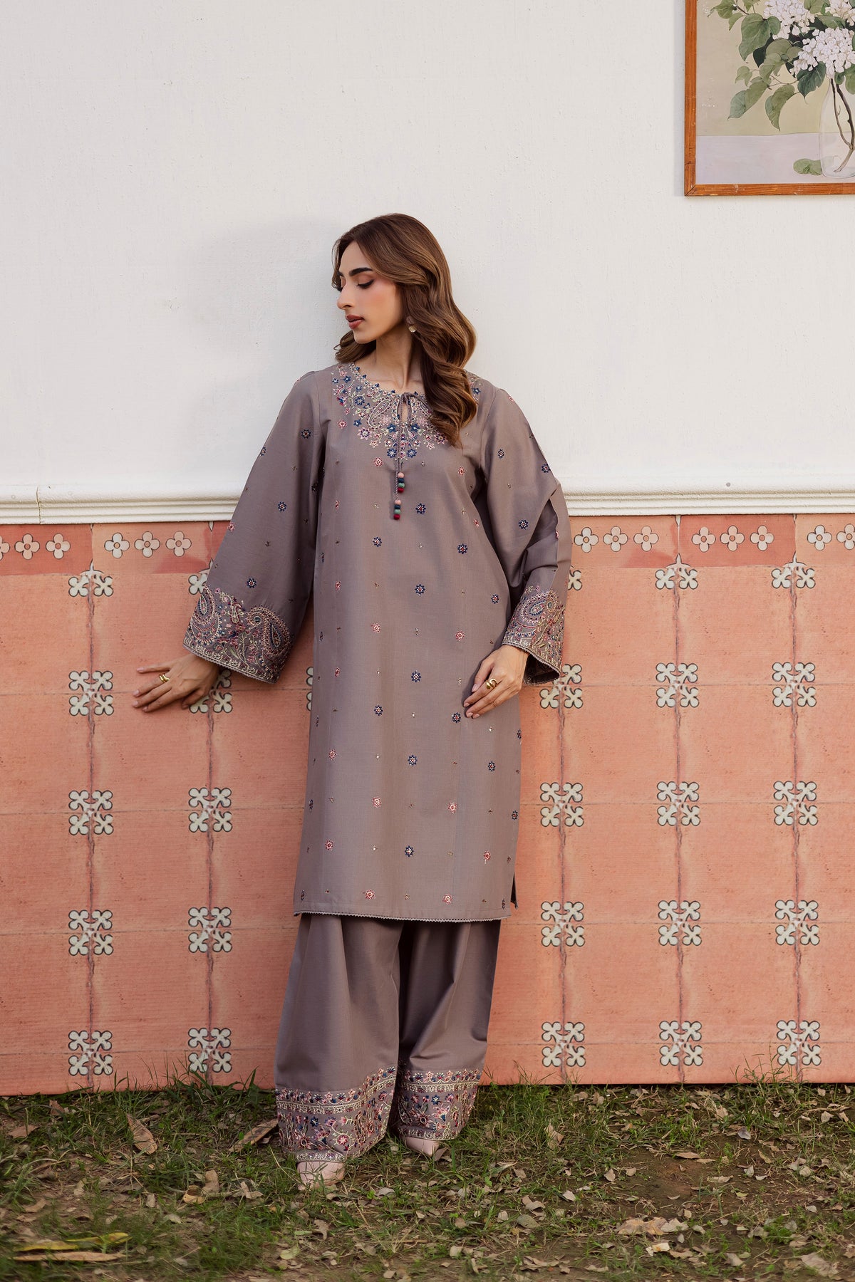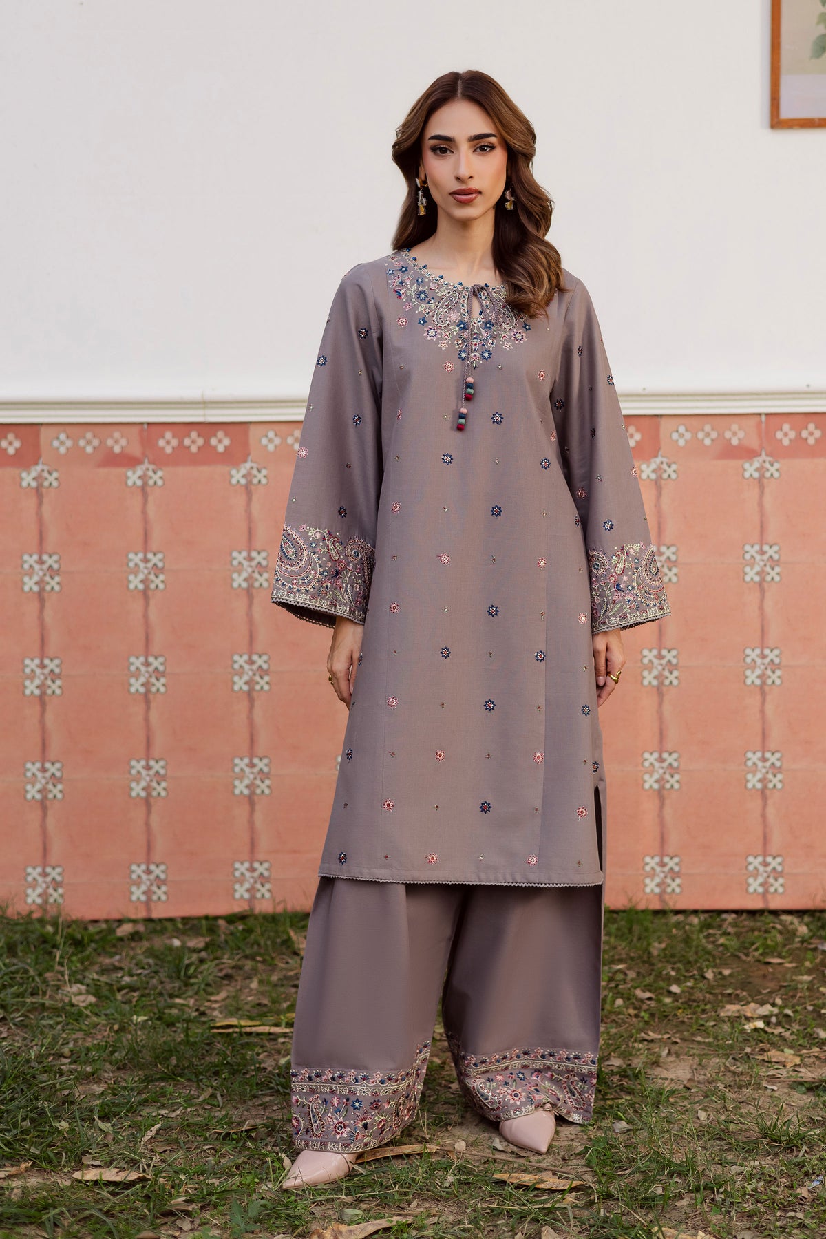 This 2-piece khaddar ensemble radiates elegance with its short paneled shirt, featuring a beautifully embroidered neckline and intricate spread details. The shirt is finished with a scalloped hem, accented by crystal hangings and delicate lace, while a keyhole neckline with tassel embellishments adds a refined, graceful touch. The sleeves are designed with a regular embroidered border, elegantly completed with lace for a polished finish.