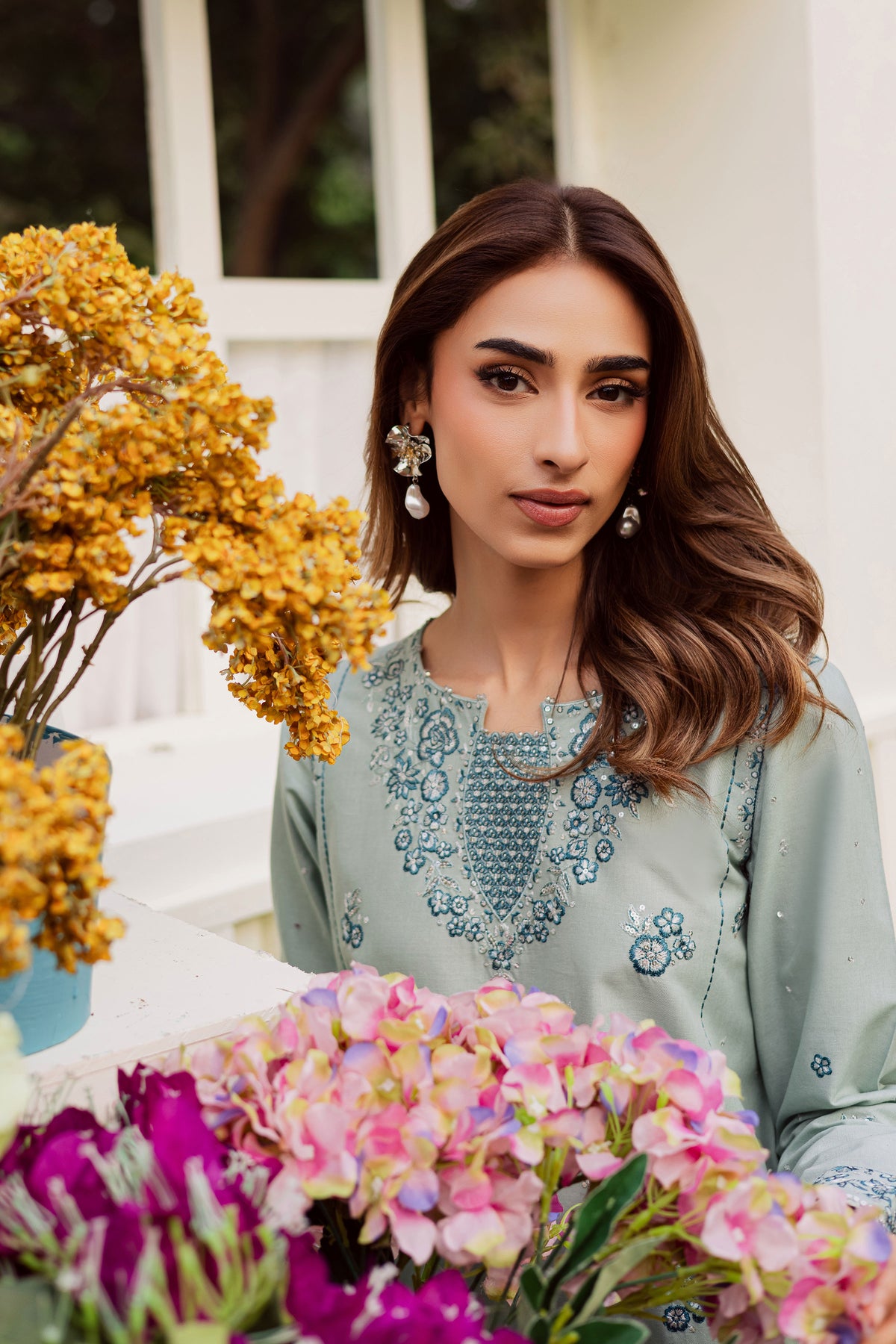 This 2-piece khaddar set is a perfect blend of elegance and detail. The long shirt features an intricately embroidered neckline adorned with subtle sequins, paired with an embroidered spread finished with delicate lace. The fitted sleeves are enhanced with embroidery and bordered with sequins, completed with lace detailing for a refined finish.