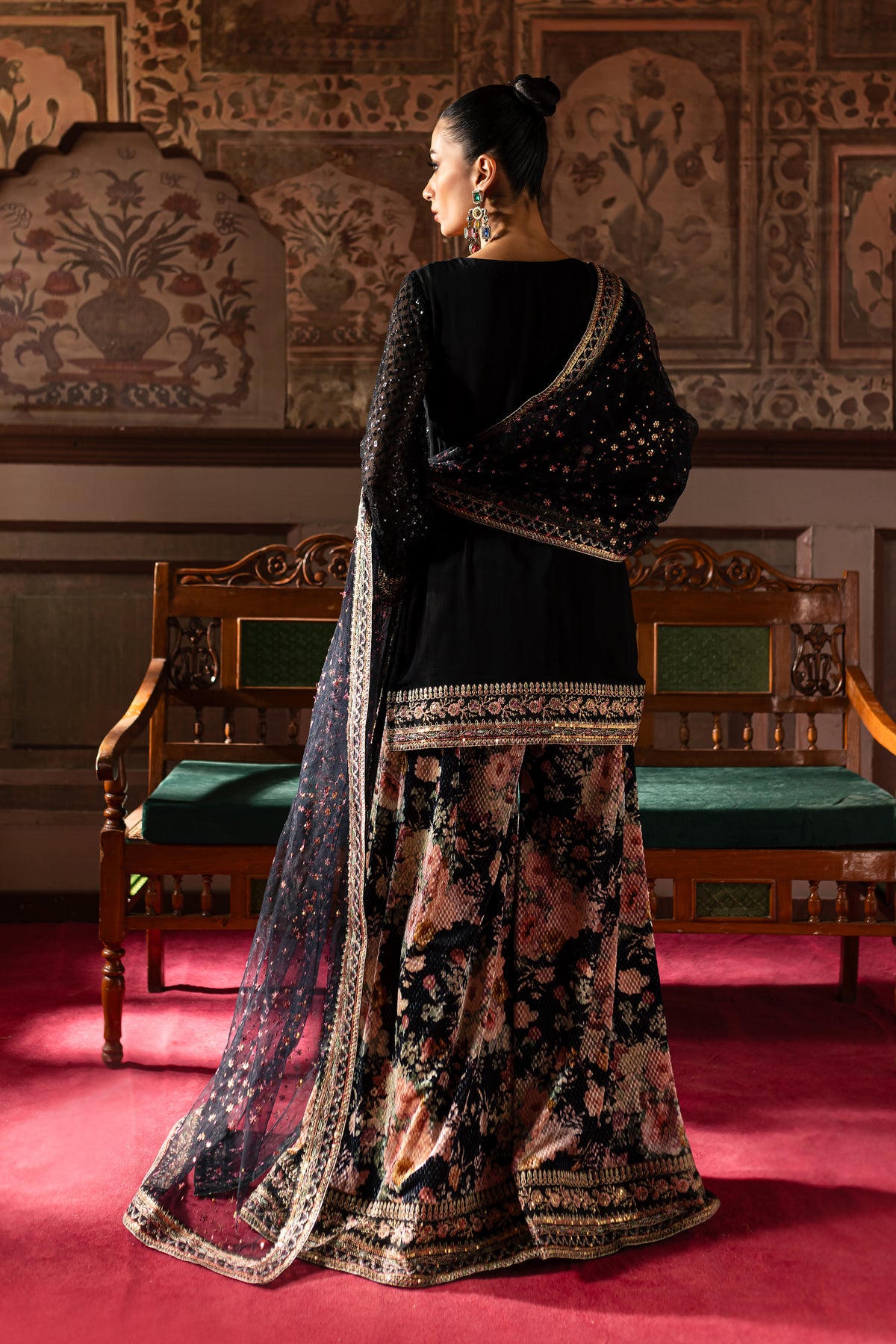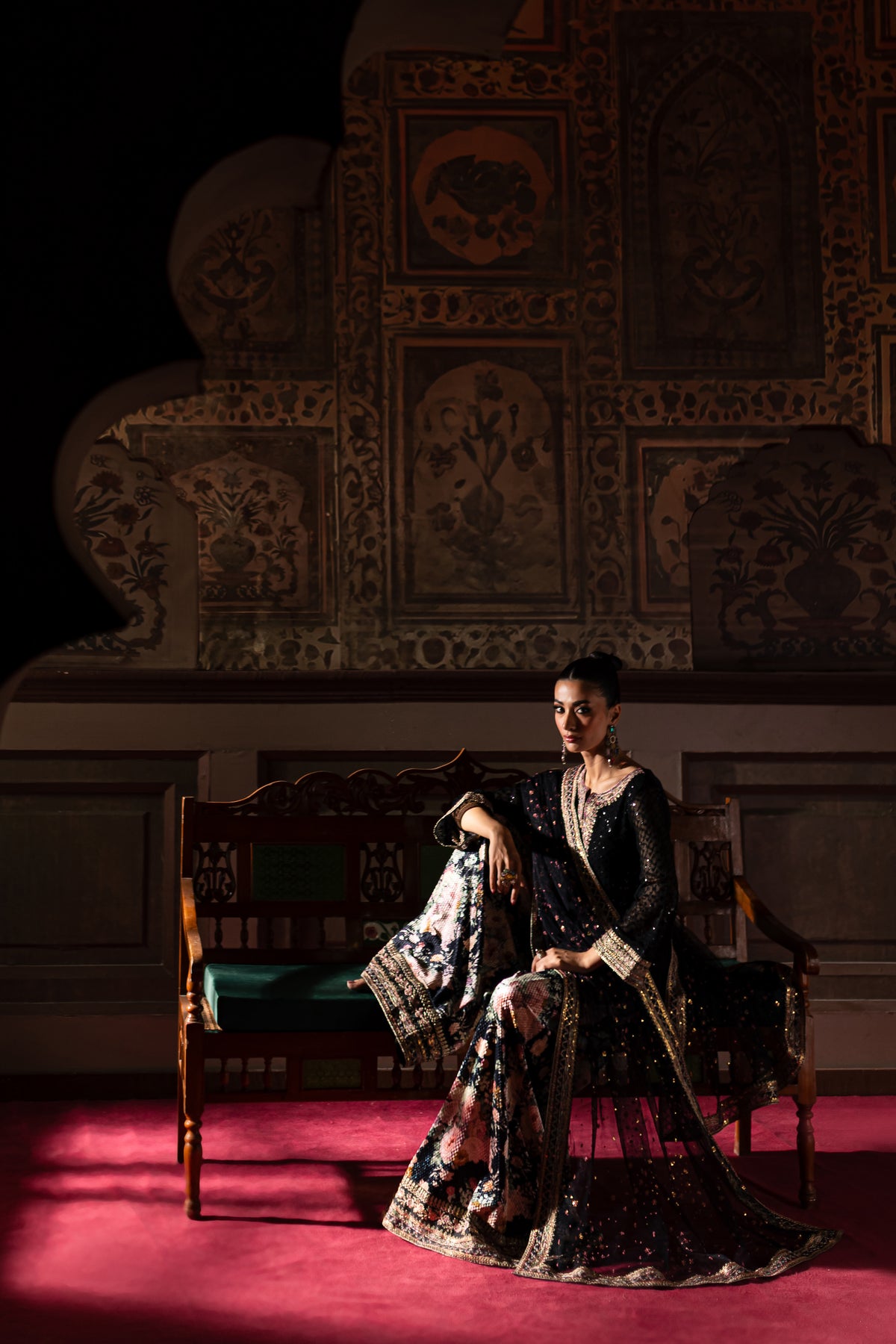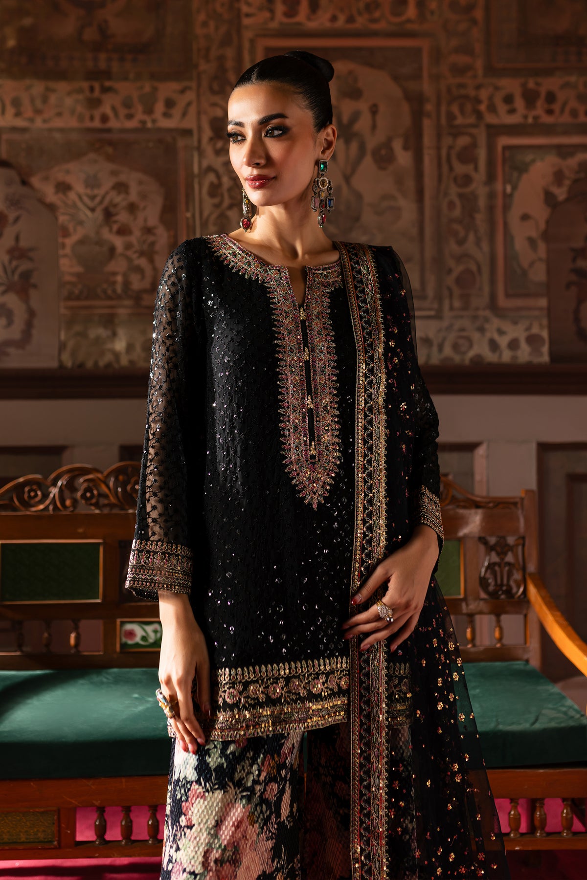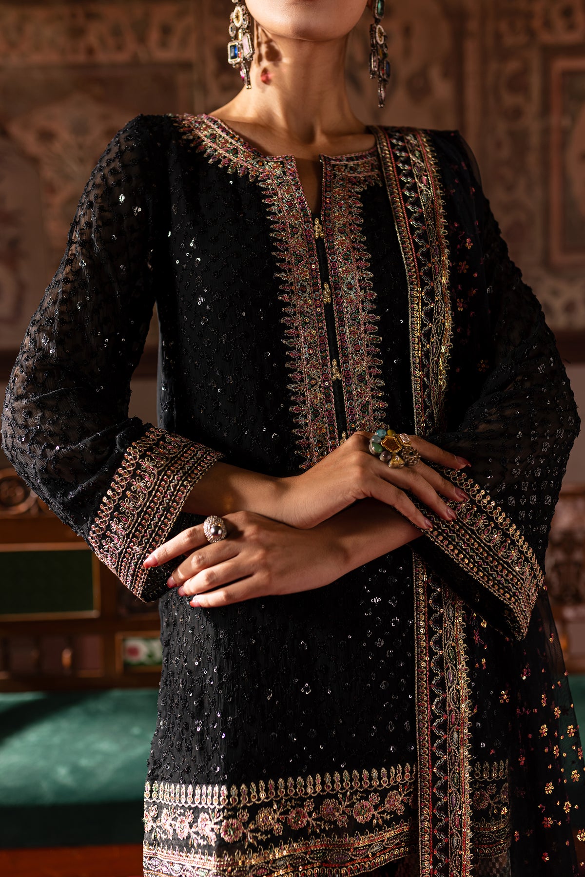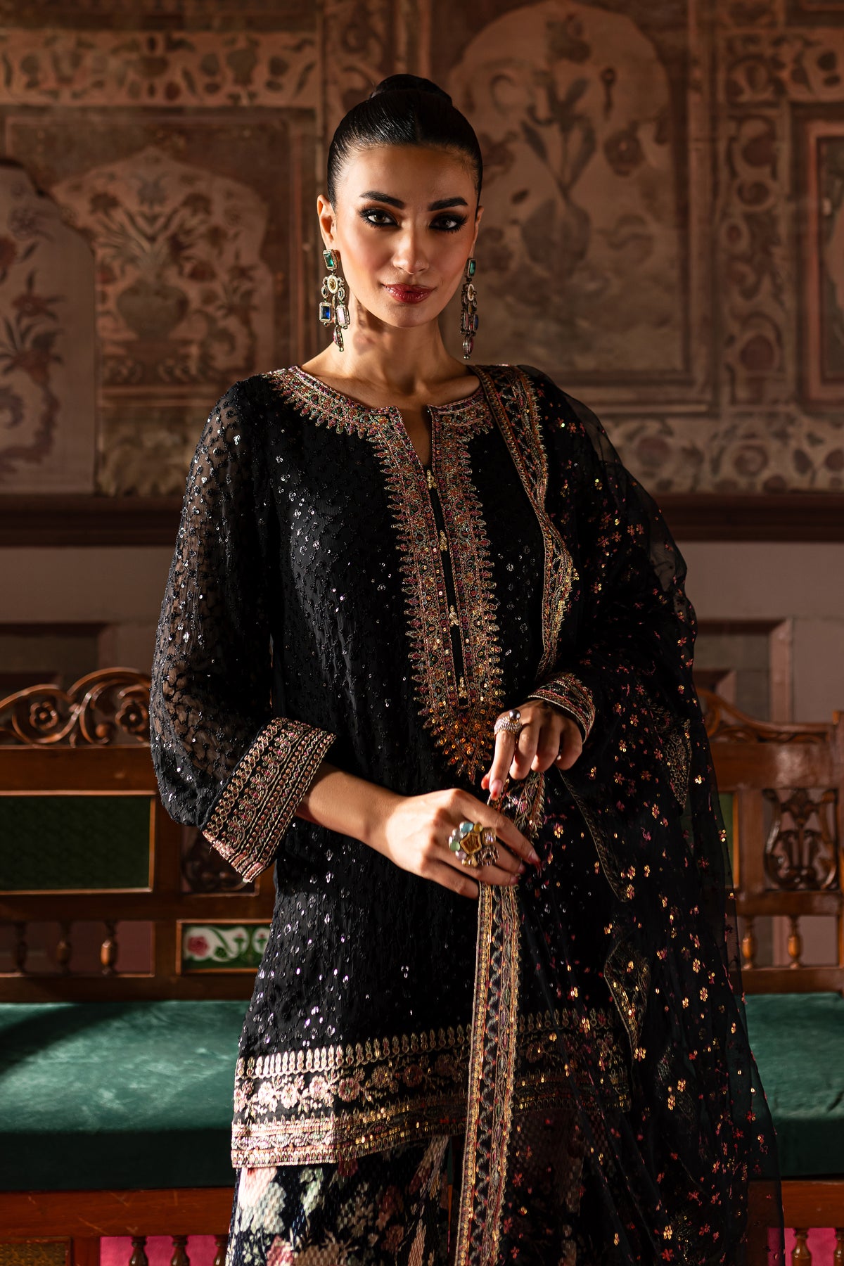 Presenting a stunning black chiffon shirt, crafted to captivate with its timeless elegance. The shirt is adorned with intricate sequin embroidery in a beautiful jaal pattern, which creates a rich, textured effect across the fabric. Complementing this design, the embroidered neckline, hem, and sleeve borders add a refined touch of detail.