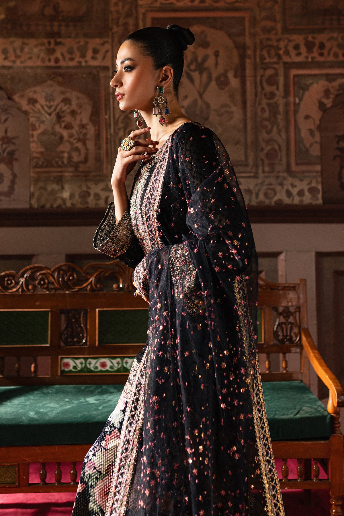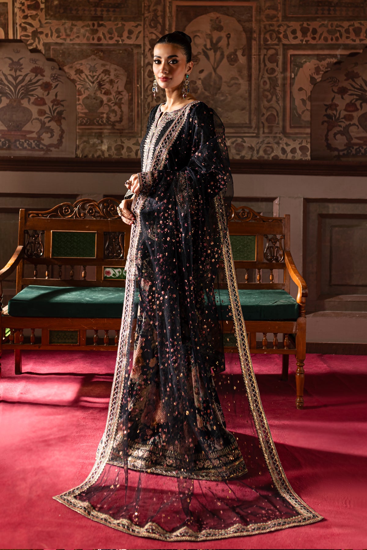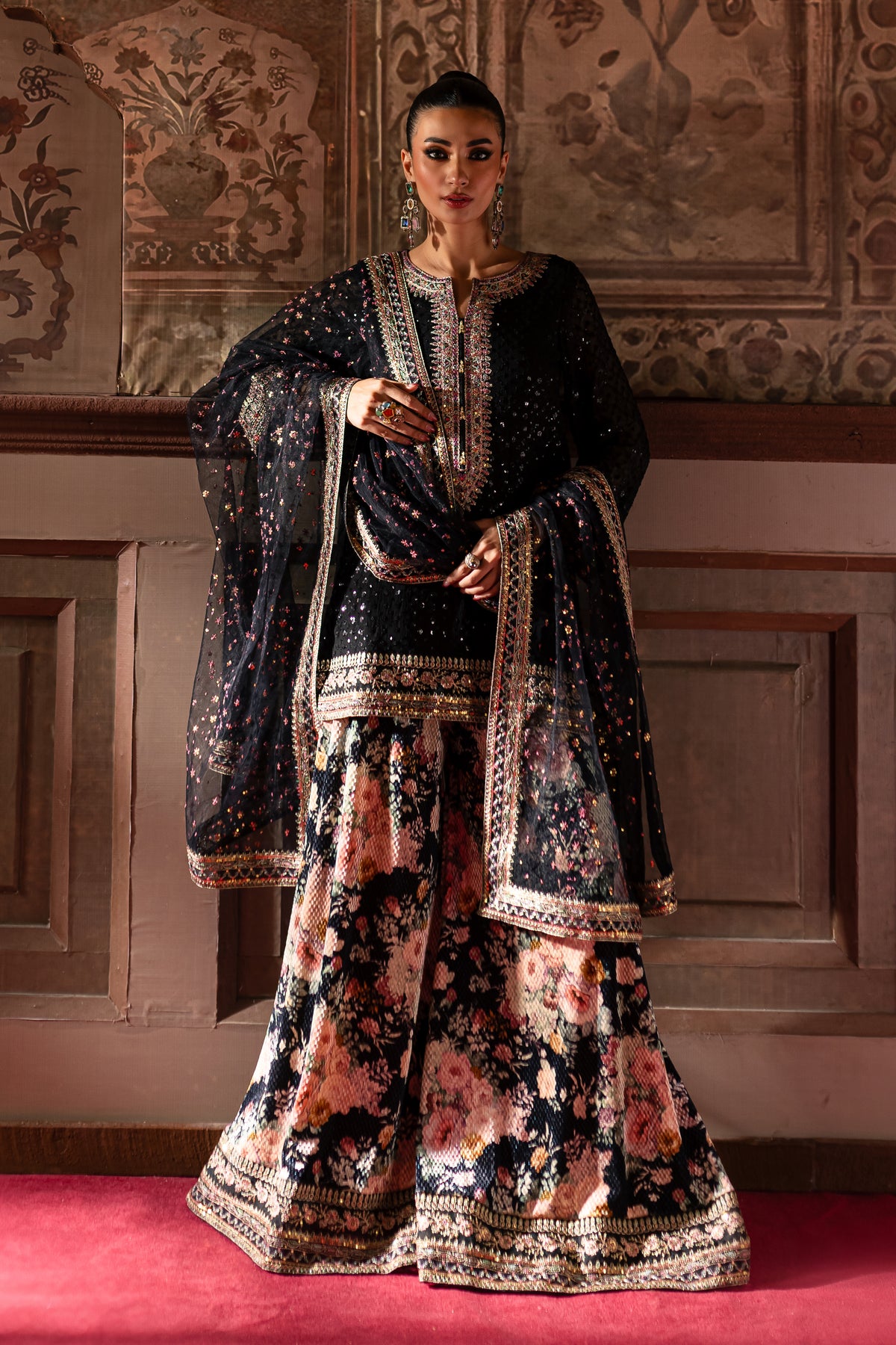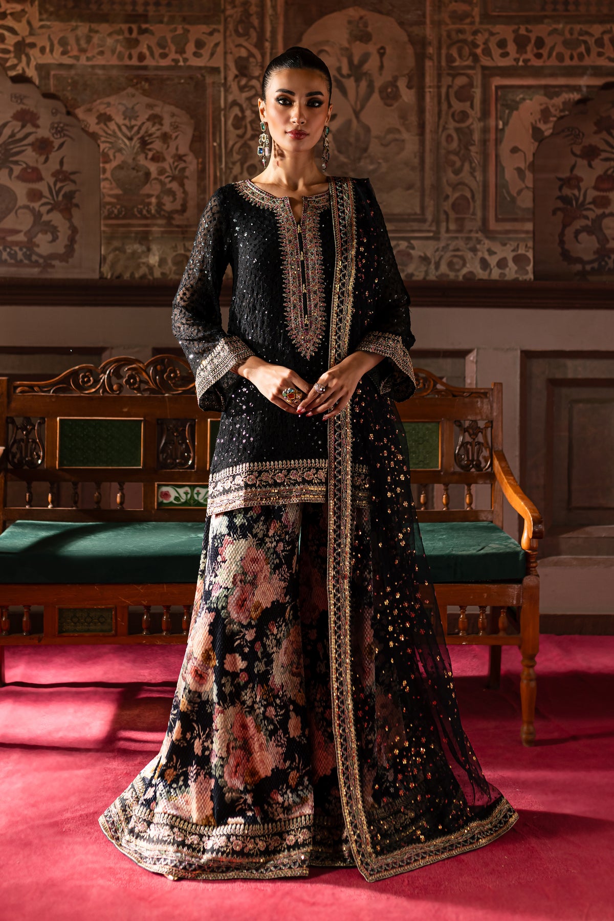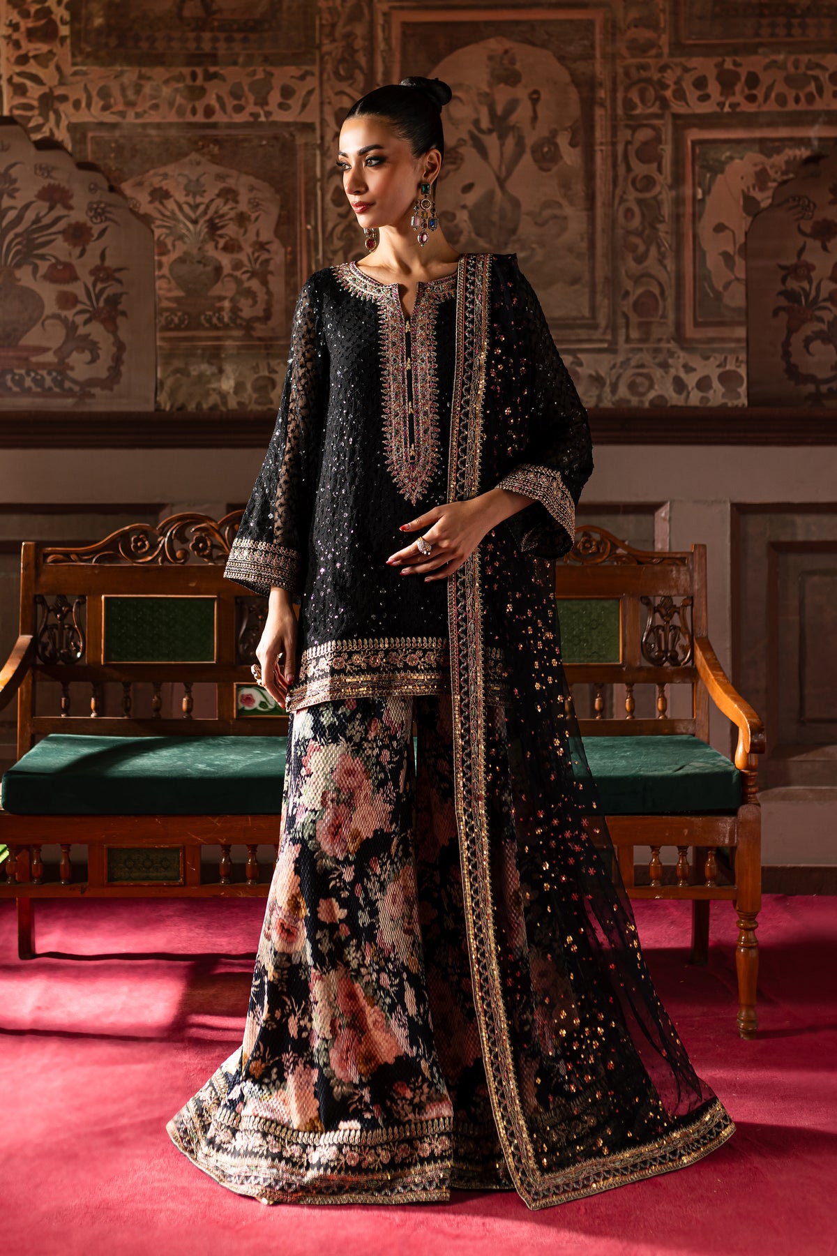 Presenting a stunning black chiffon shirt, crafted to captivate with its timeless elegance. The shirt is adorned with intricate sequin embroidery in a beautiful jaal pattern, which creates a rich, textured effect across the fabric. Complementing this design, the embroidered neckline, hem, and sleeve borders add a refined touch of detail.