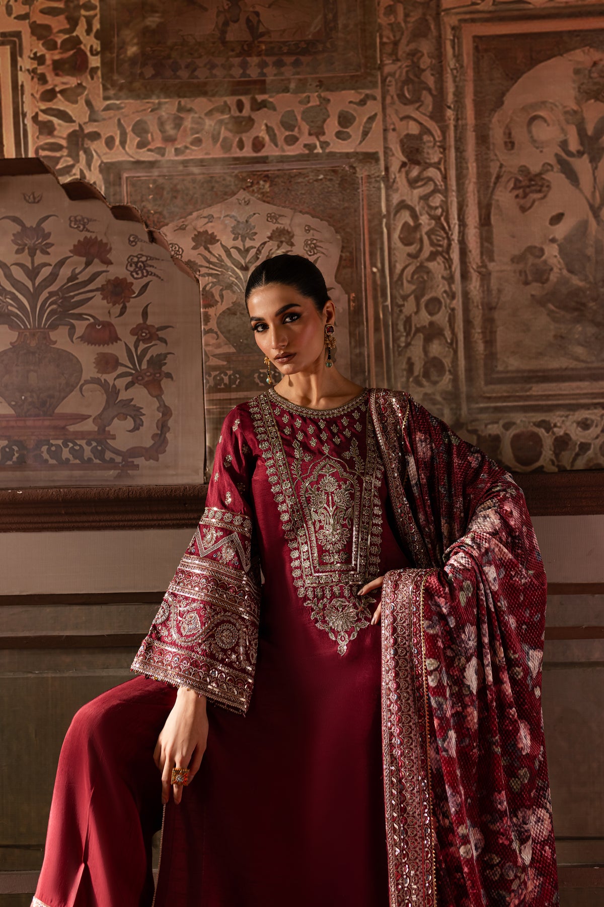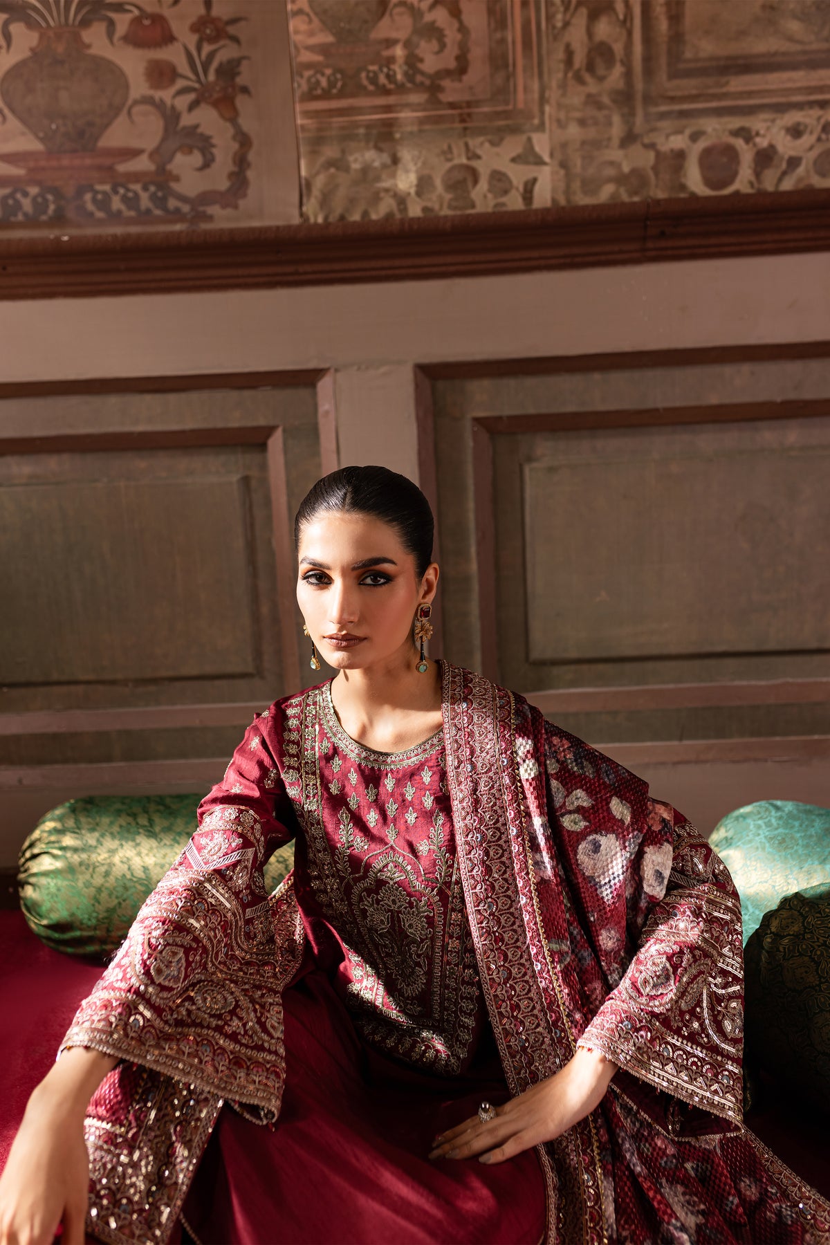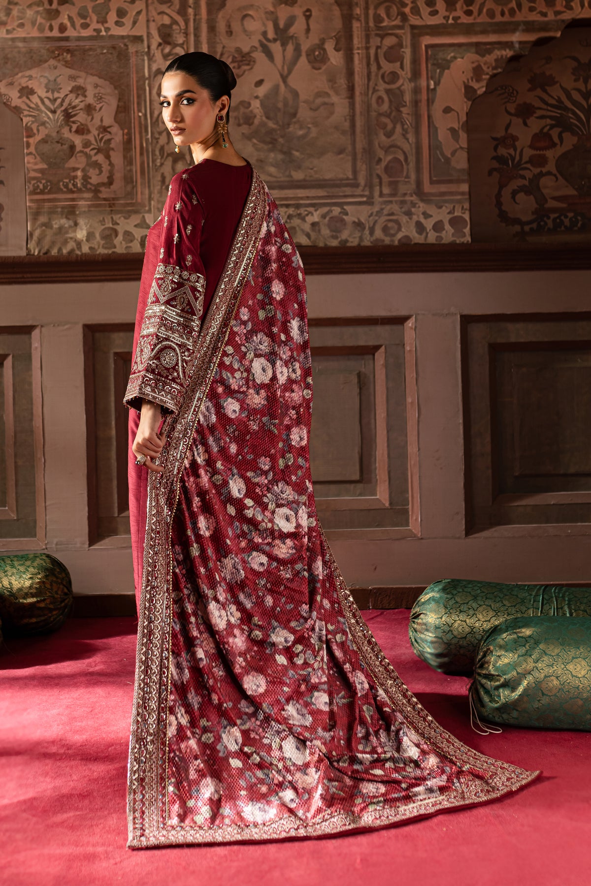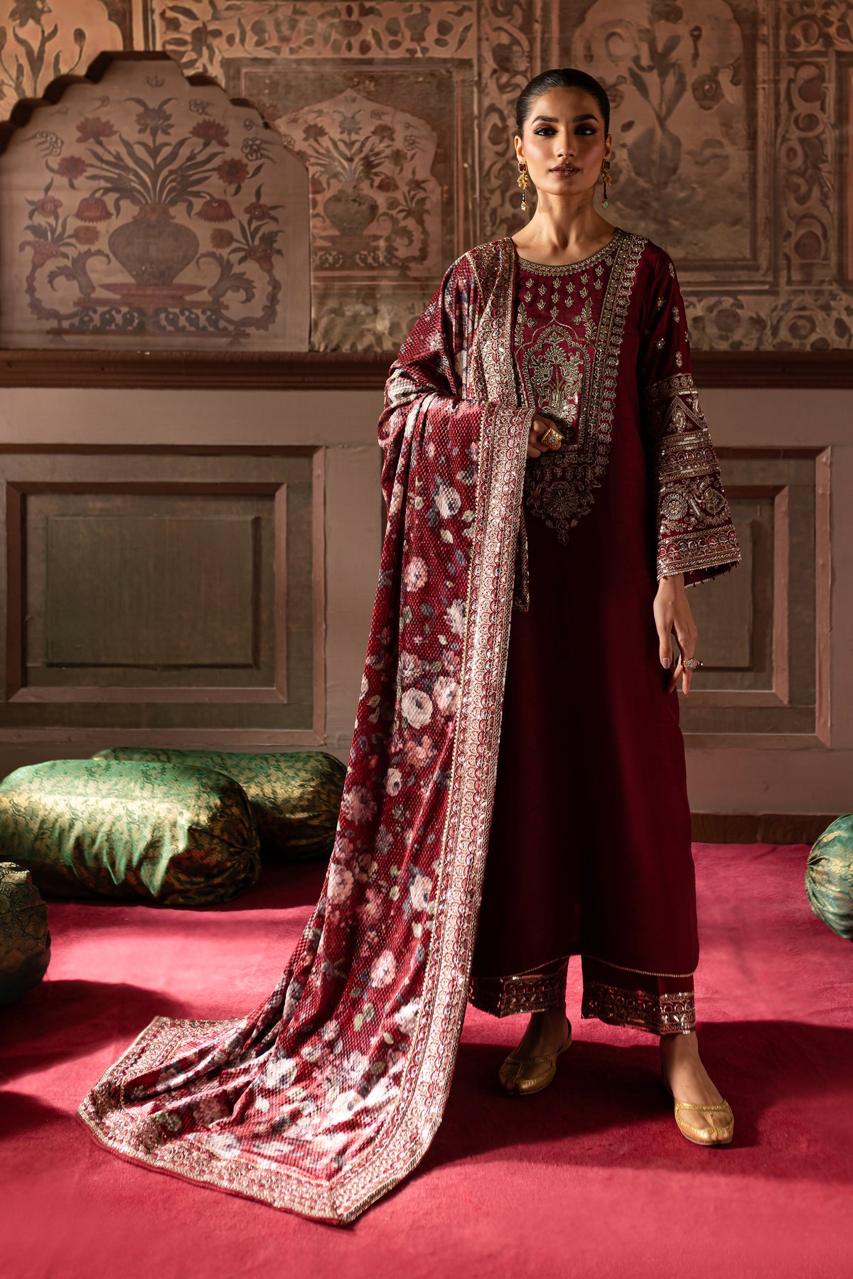 To complete this elegant outfit, a maroon printed velvet shawl featuring intricate embroidery on all borders.