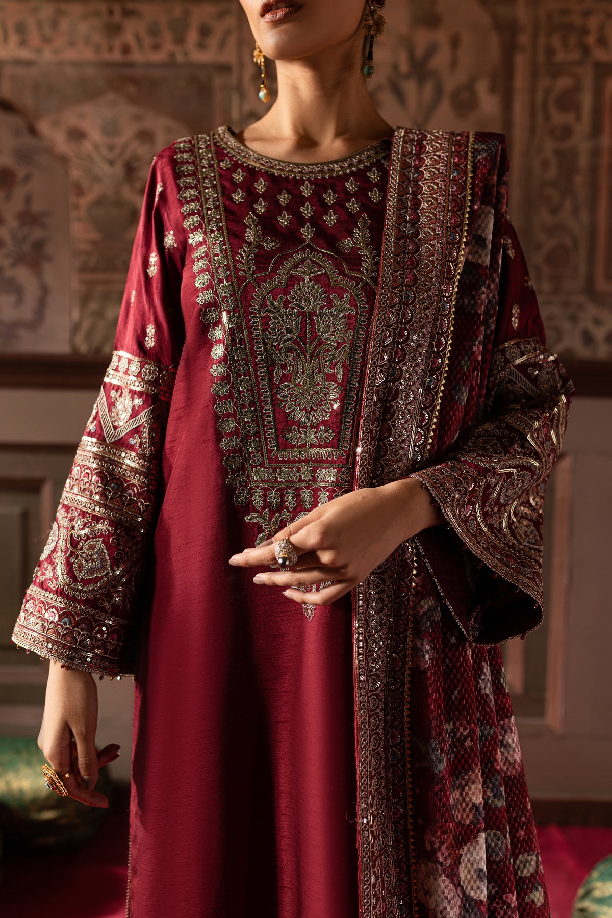 This luxurious maroon raw silk shirt, is adorned with exquisite embroidery. The shirt showcases a beautifully embroidered neckline, while the heavily embroidered sleeves create a striking and eye-grabbing look.