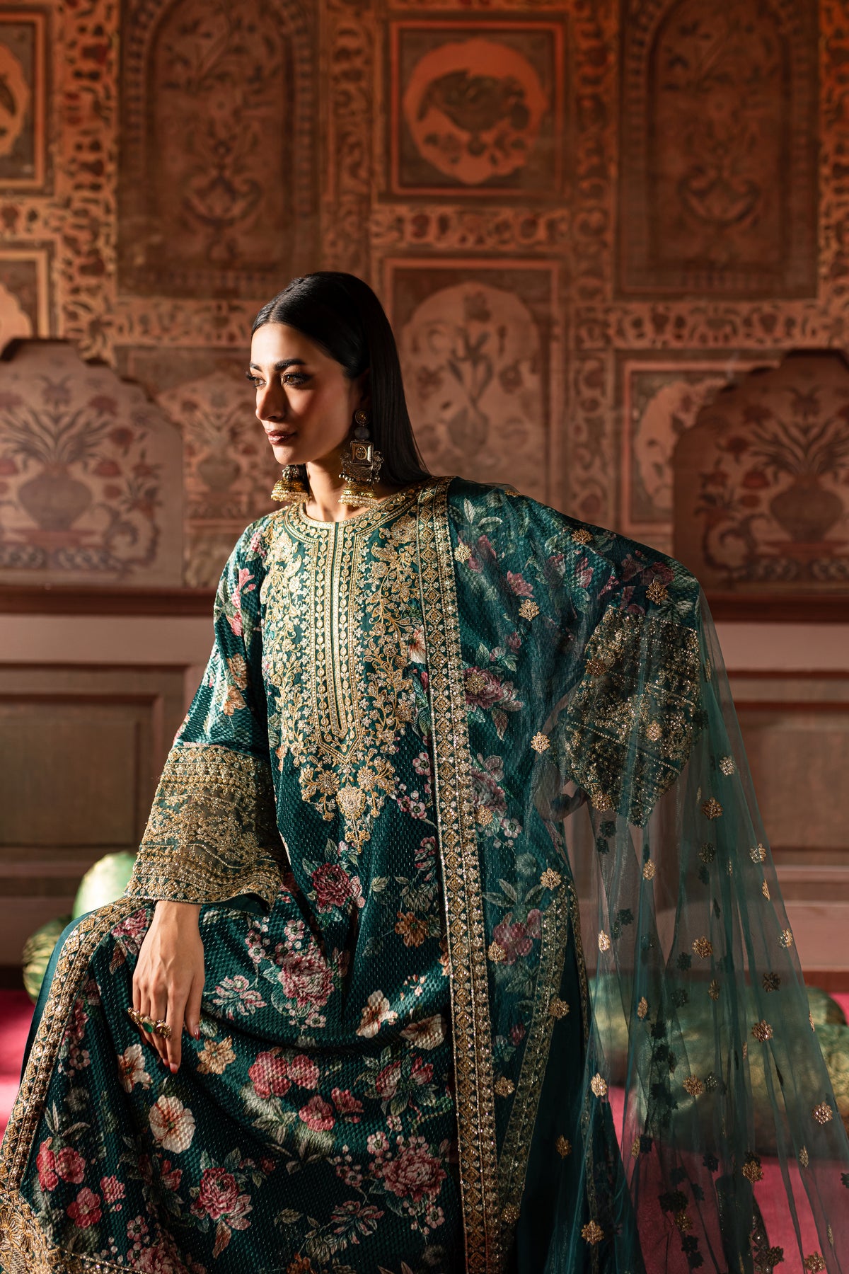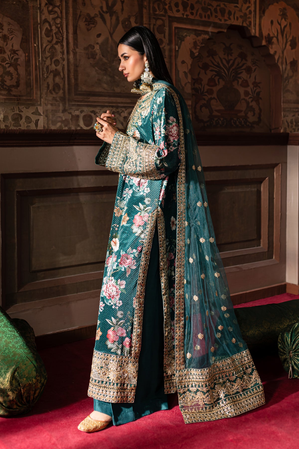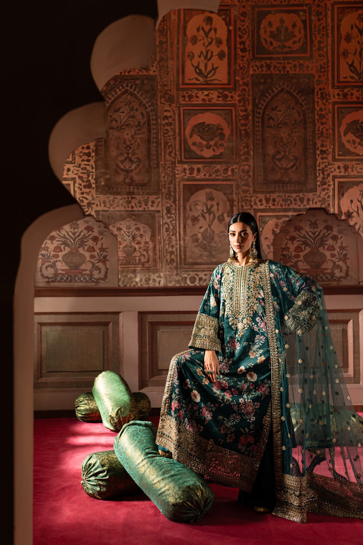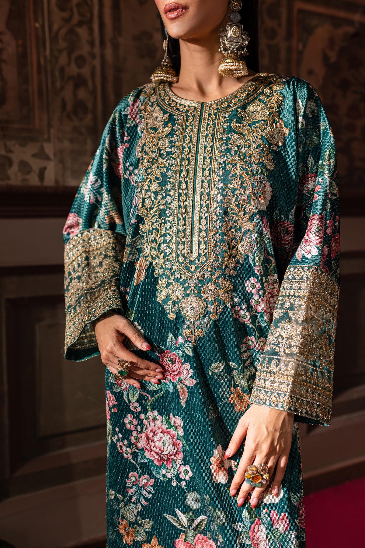 This printed green long kameeno-cut velvet shirt exudes elegance with its embroidered neckline, side slits, and intricately detailed hem and sleeve borders.
