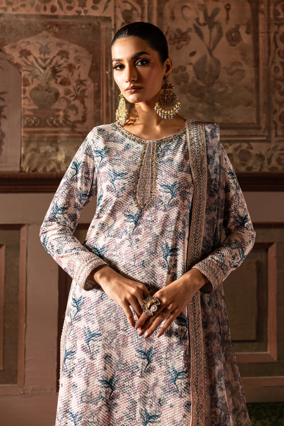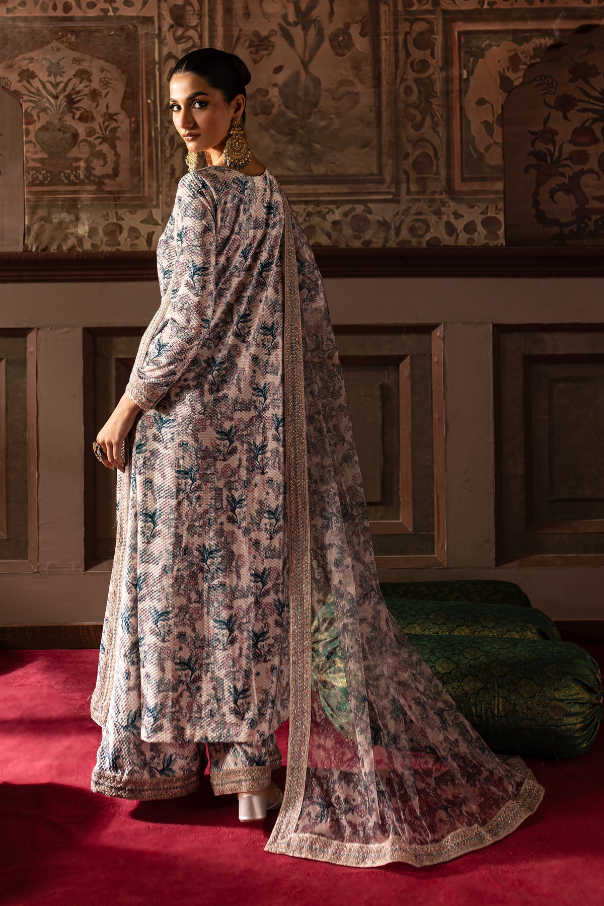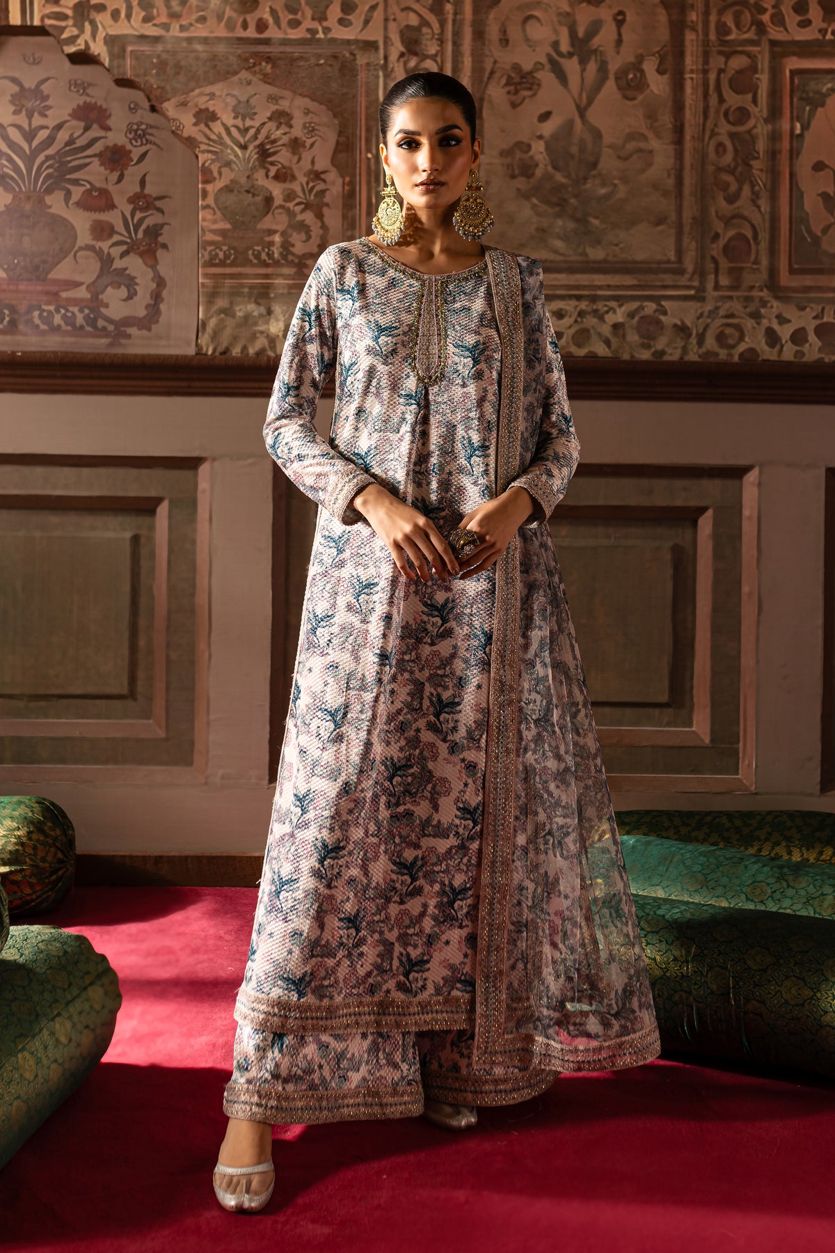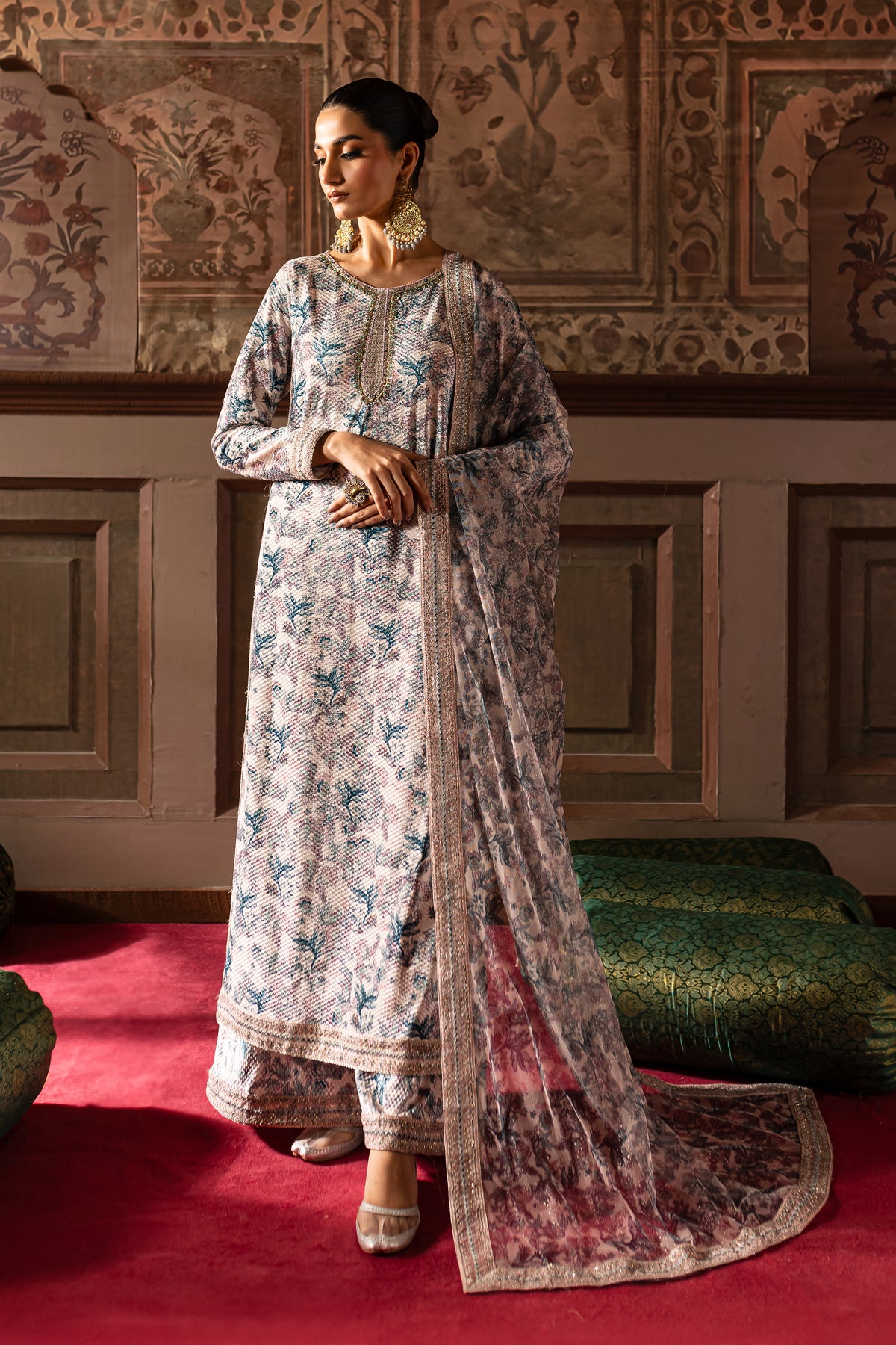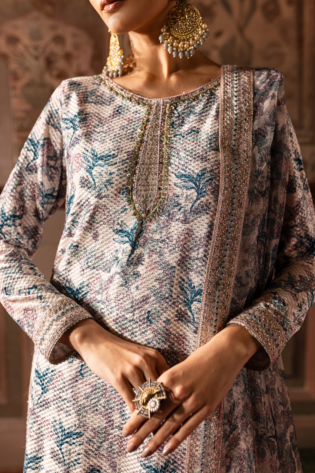 To complete the ensemble, the shirt is paired with a printed, shimmery net dupatta, adorned with embroidered borders on all four sides.