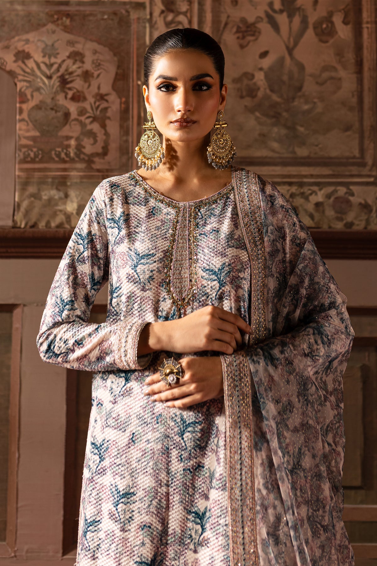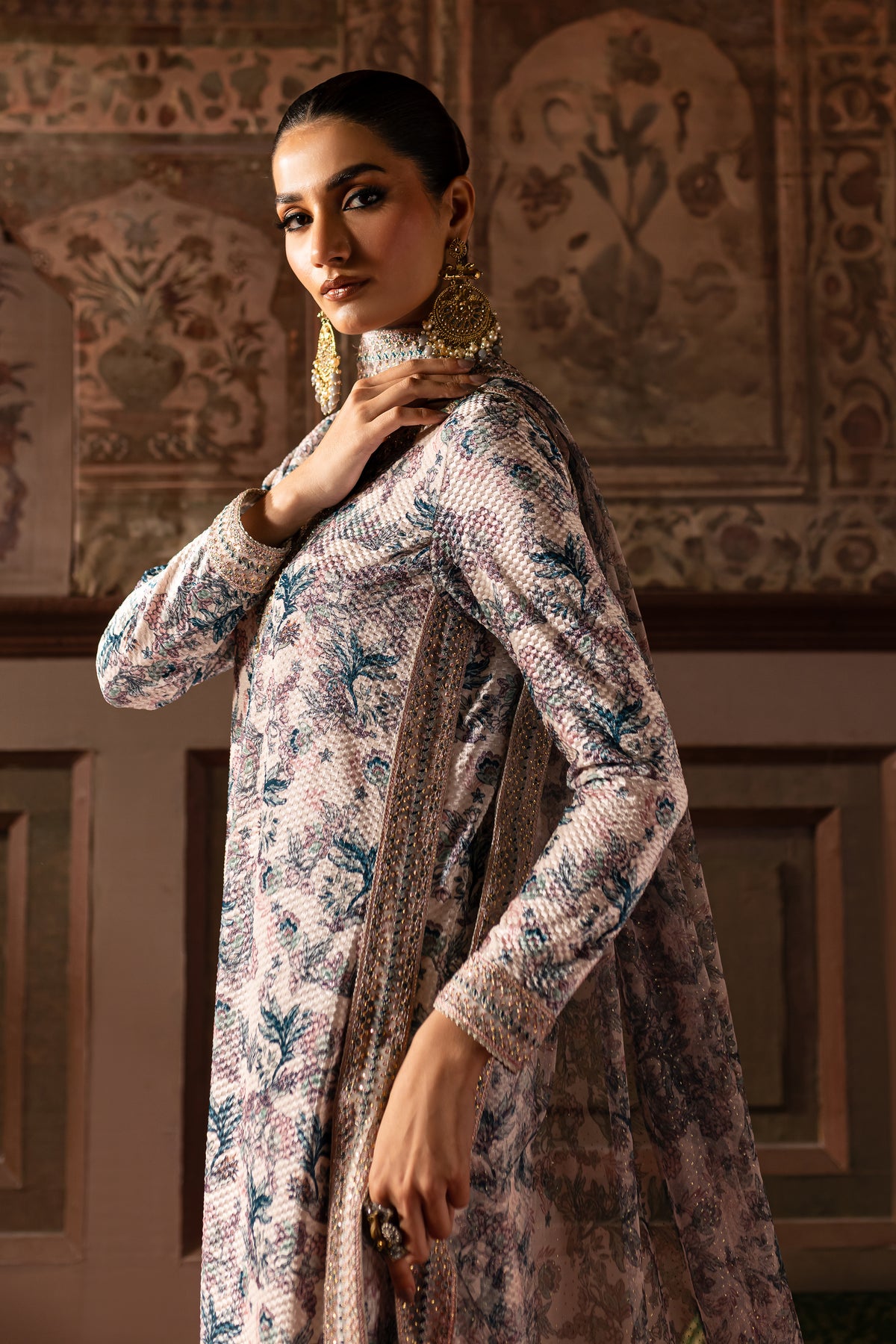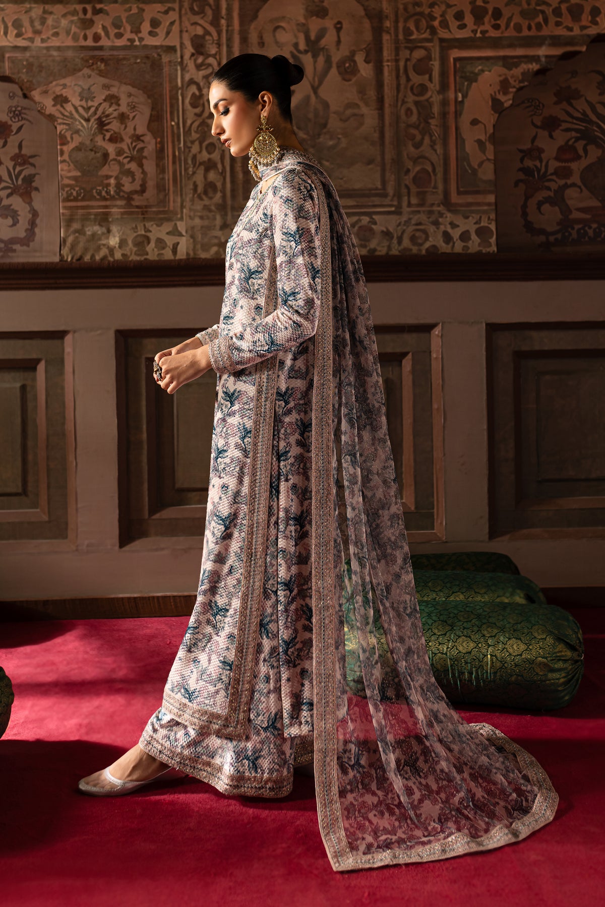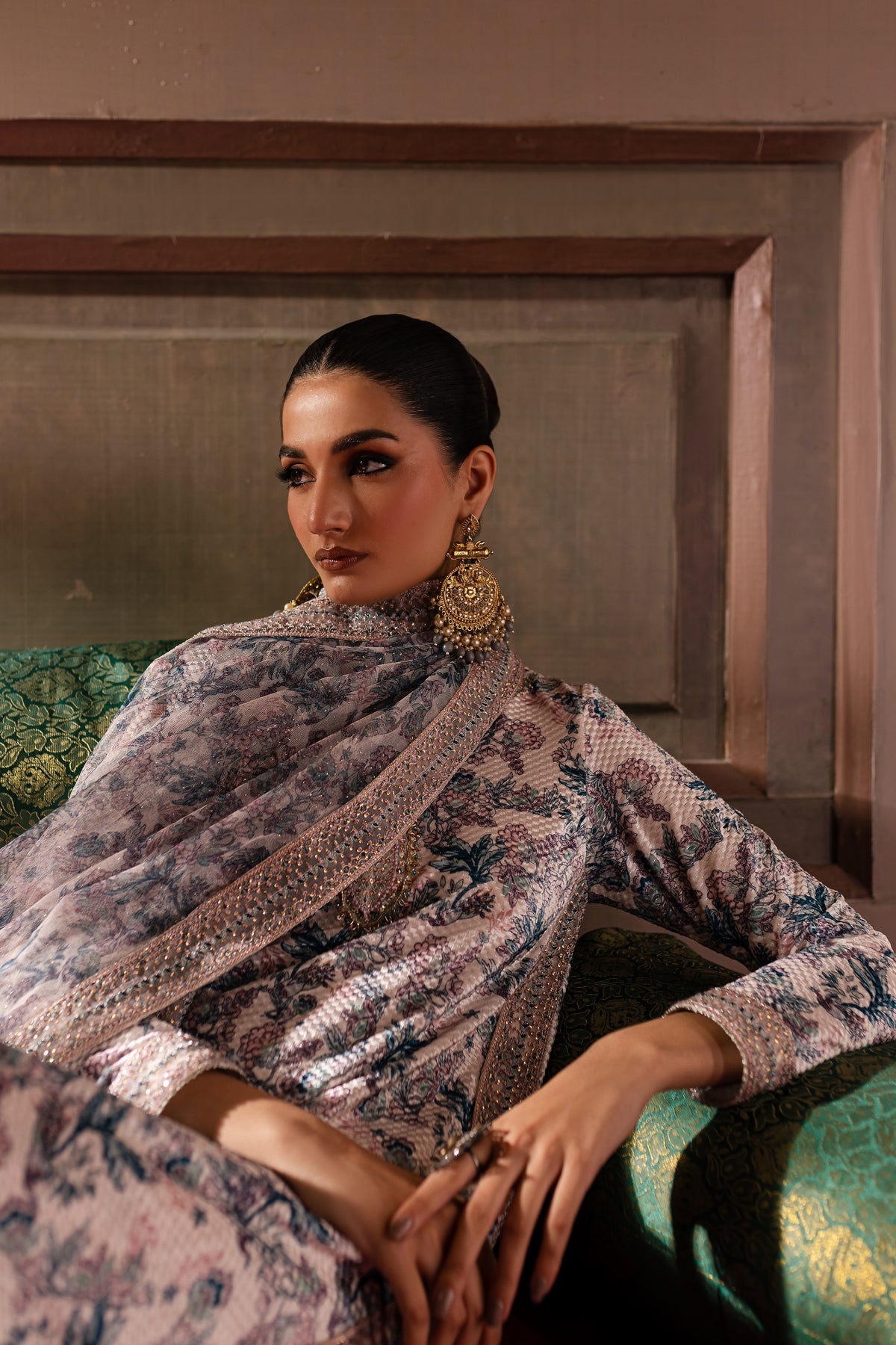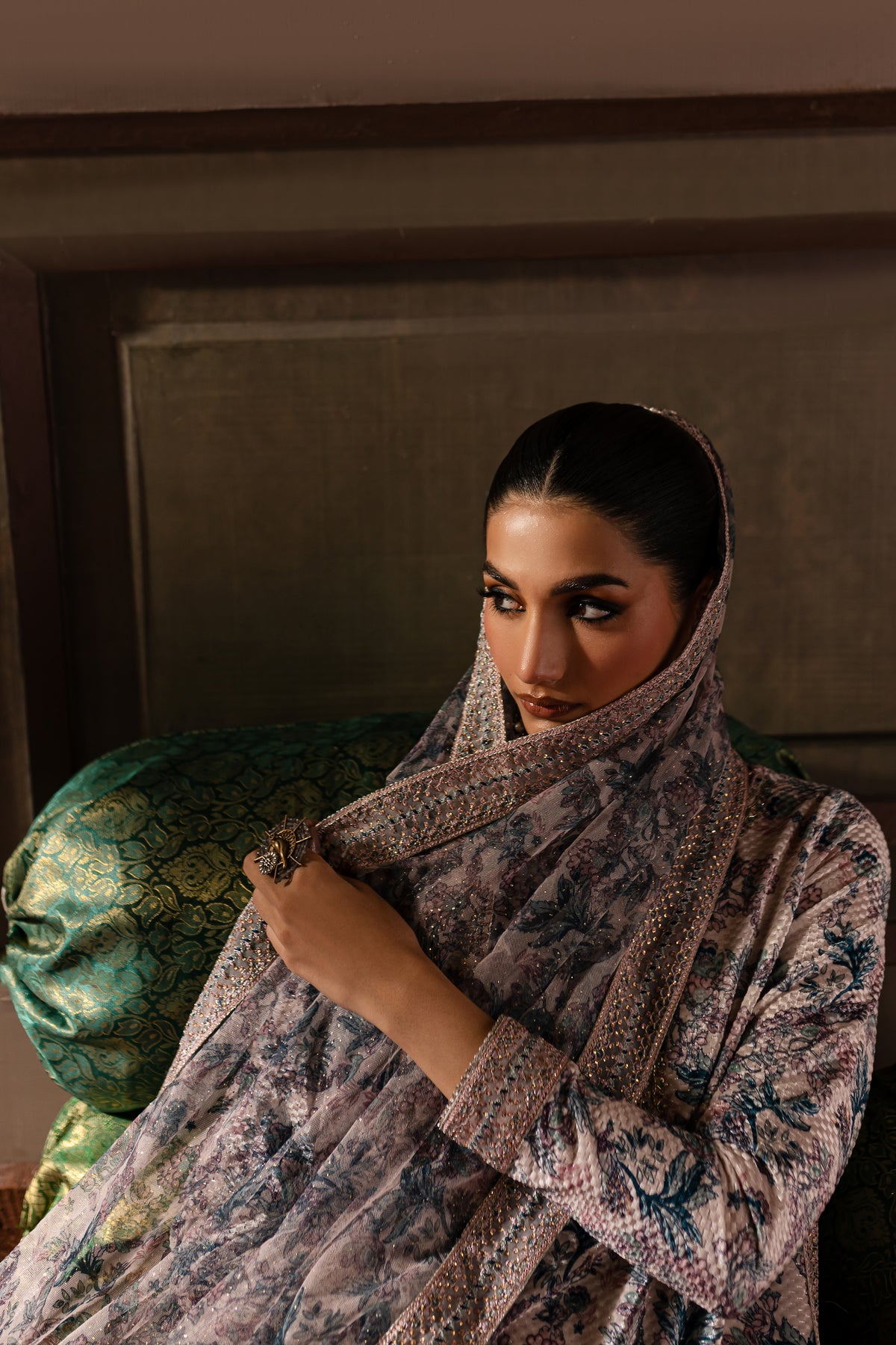To complete the ensemble, the shirt is paired with a printed, shimmery net dupatta, adorned with embroidered borders on all four sides.