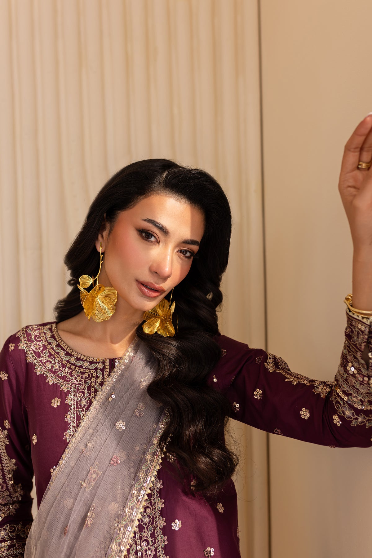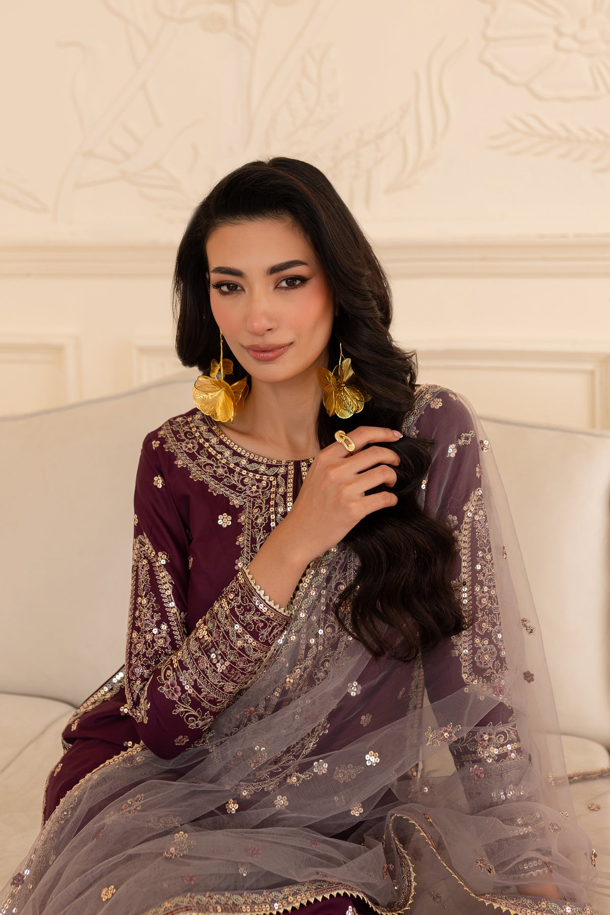 The rich purple shaded 3-piece dress features an embroidered pima lawn long shirt with an intricately composed heavy neckline, sleeves, borders, and side chaaks, all adorned with a sequin spread and white embroidery that adds a subtle shimmer throughout, elevating the design to a truly elegant piece.