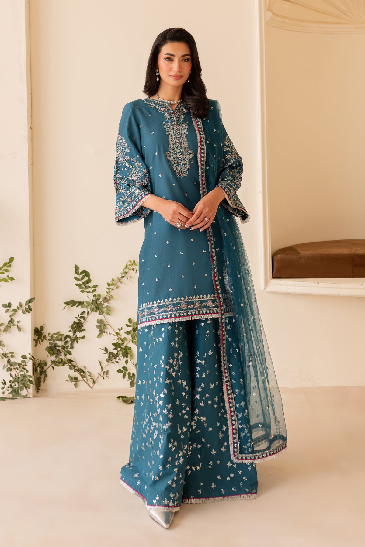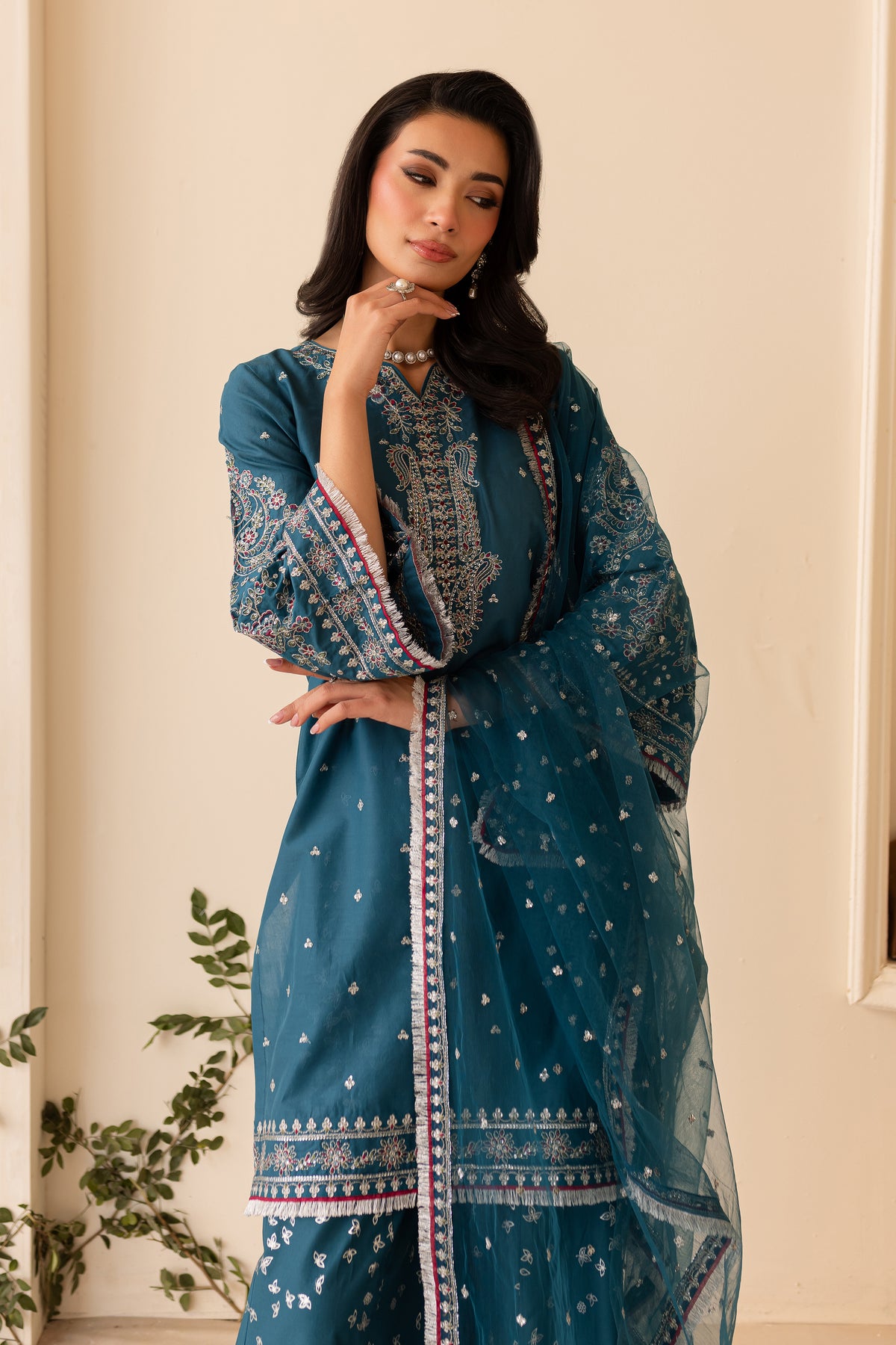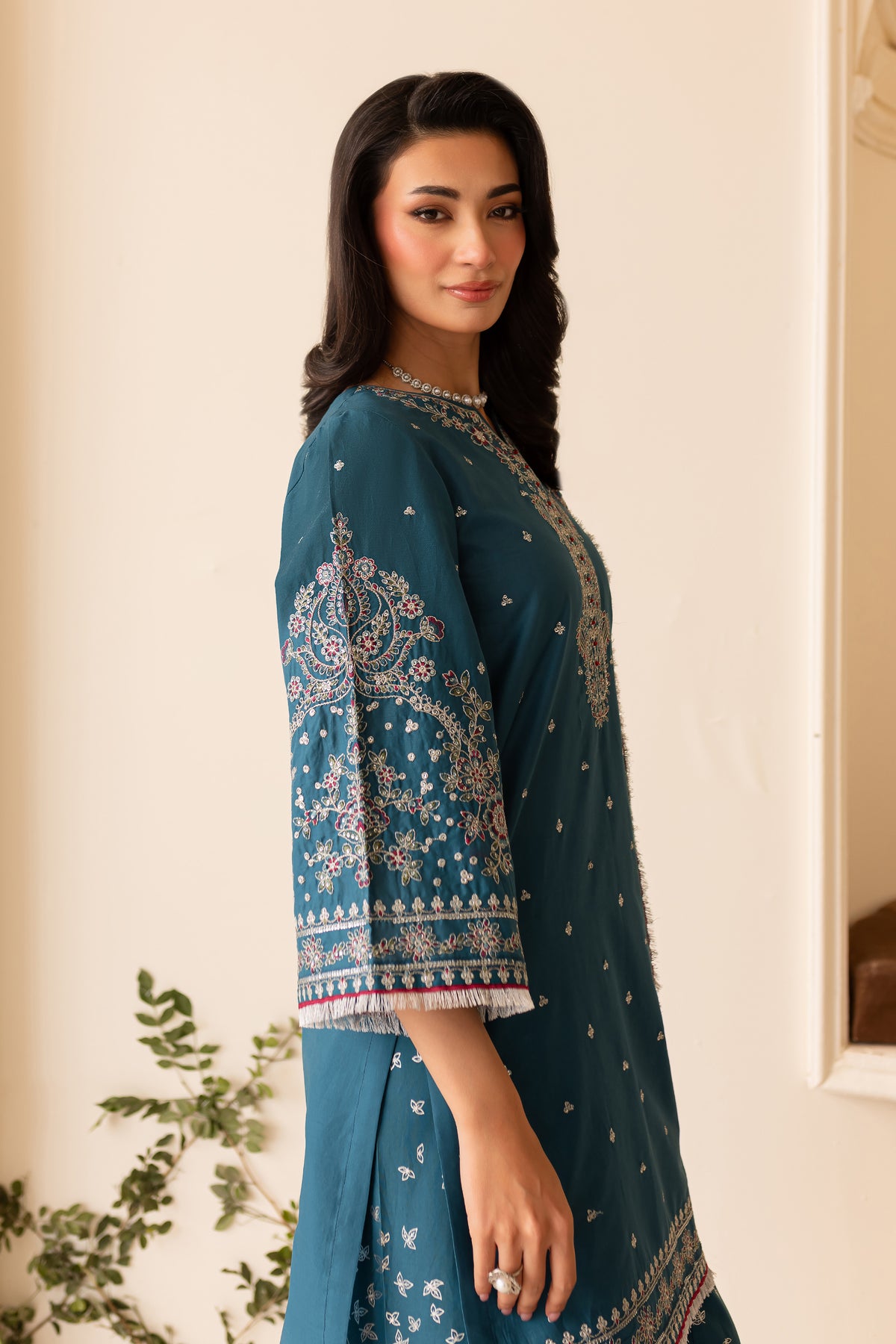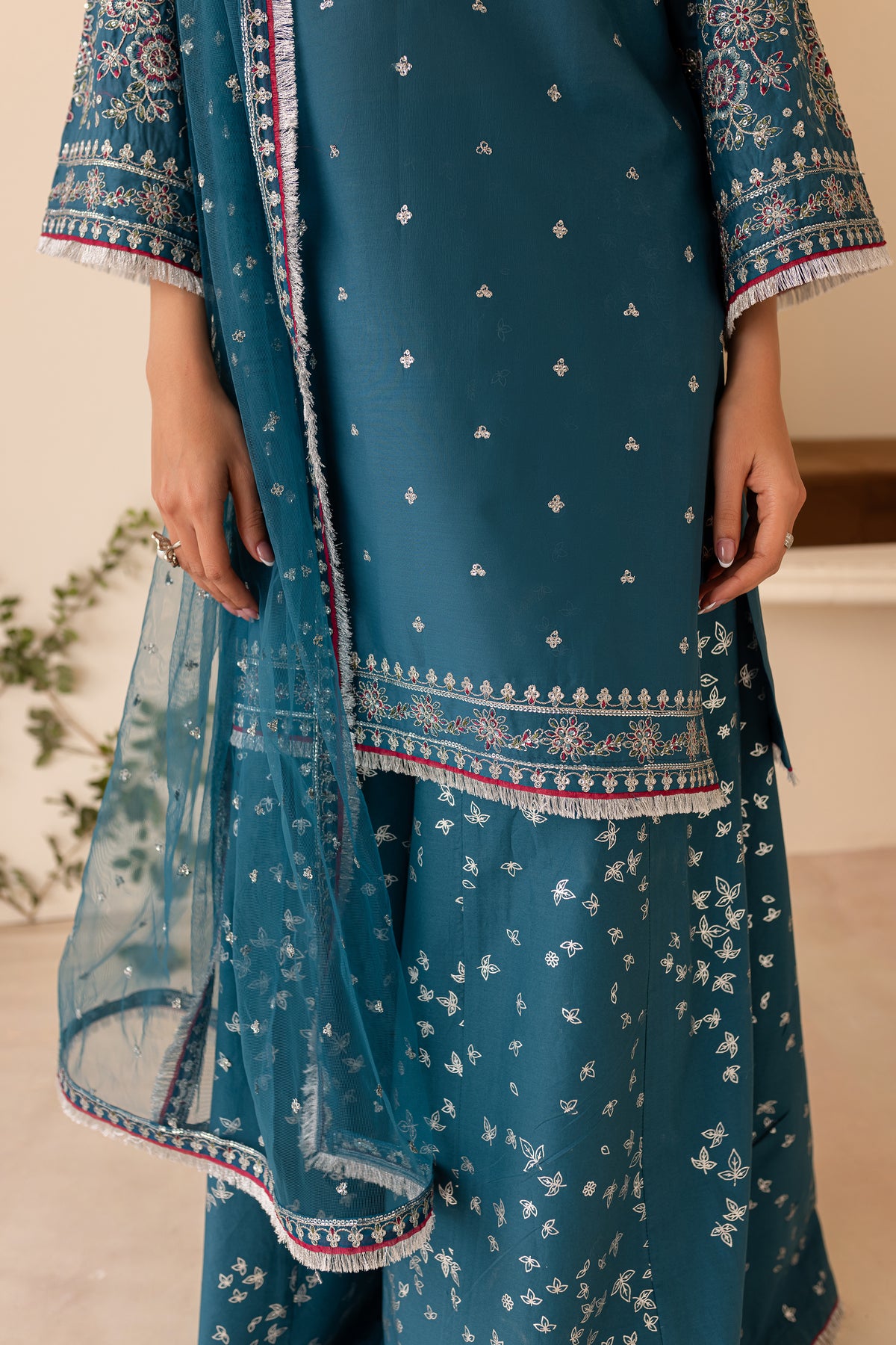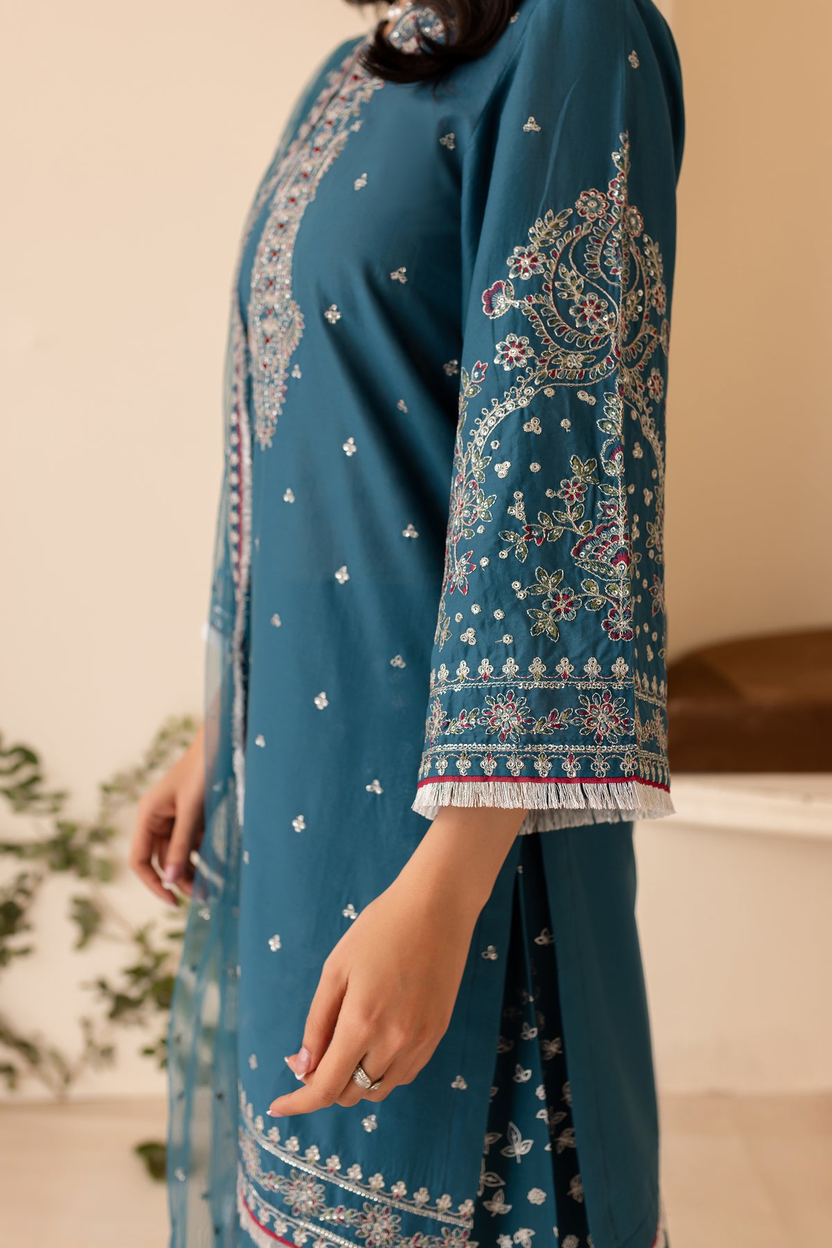 The blue coral pima lawn dress features a boat neck with a V-slit, elegantly finished with self-piping for a sleek, refined look. The composed neckline is beautifully embroidered, while a subtle sequin spread adds a touch of shimmer and sophistication throughout. The hem of the shirt is adorned with embroidered borders, bringing a refined finish to the design. The sleeves are flared 3-quarter length, intricately embroidered, and the sleeve and shirt hems are finished with contrast pink piping and silver kiran lace, offering a graceful, traditional touch.