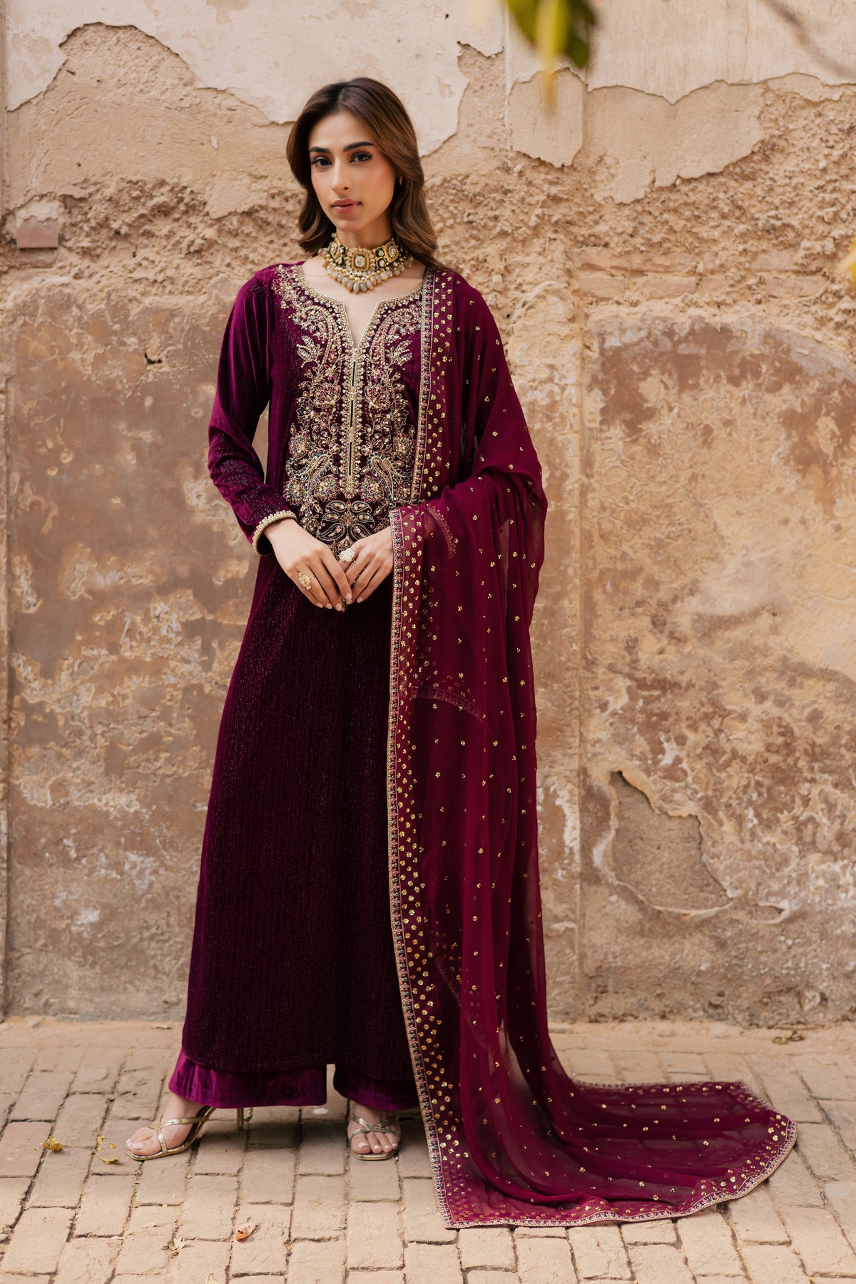 This three piece velvet set features a long fancy line shirt with a composed embroidered neckline enhanced with adda work detailing. The full fitted sleeves are finished with adda work at the cuffs, adding a refined and structured touch to the design.