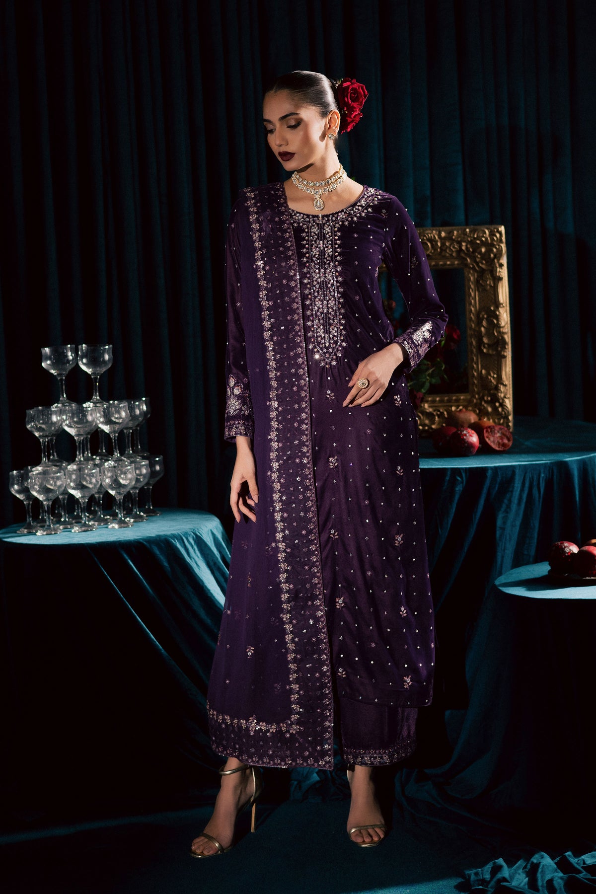 A crinkle dupatta completes the ensemble, adorned with a heavy sitara and embroidery spread. The dupatta is finished with an organza embroidered border on all four sides, adding lightness and shimmer to the rich velvet base. This design is a graceful choice for winter events and evening celebrations.