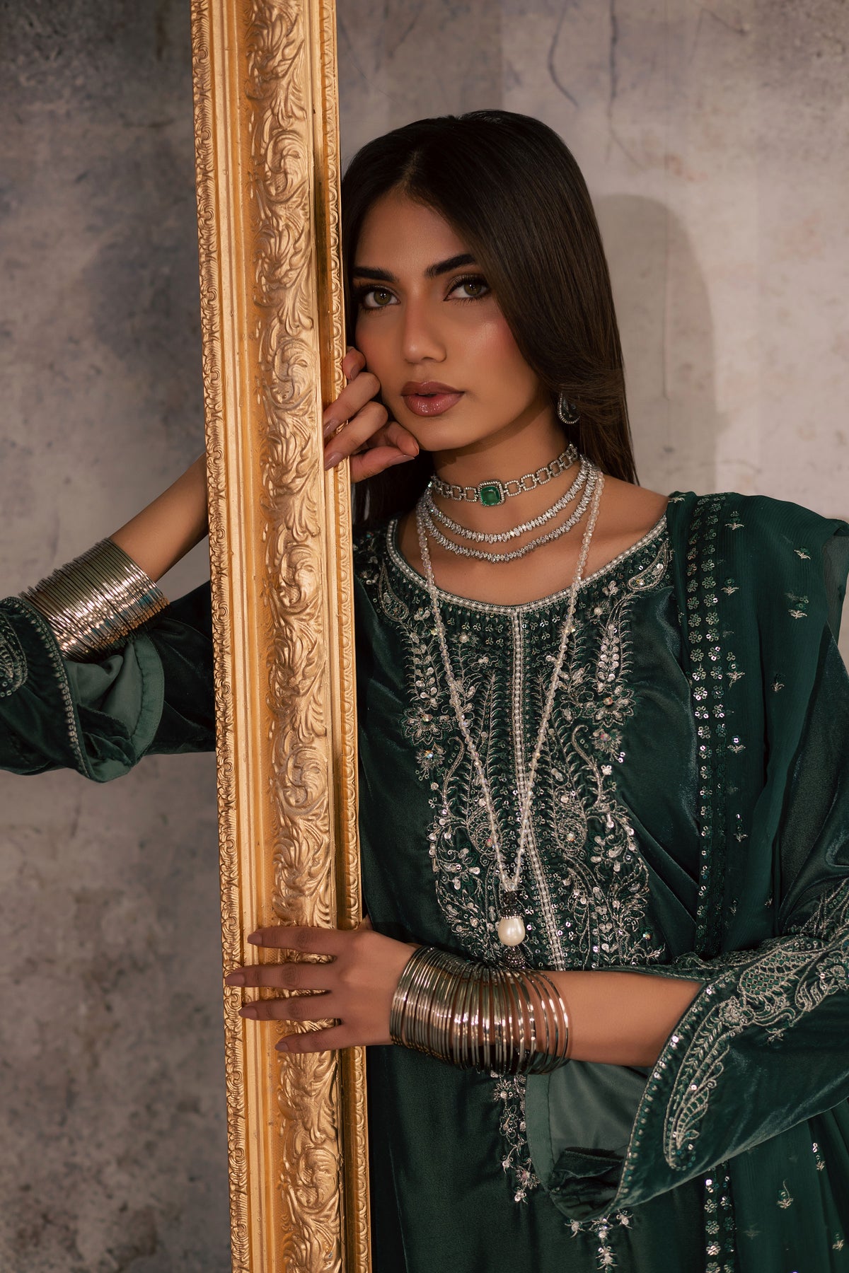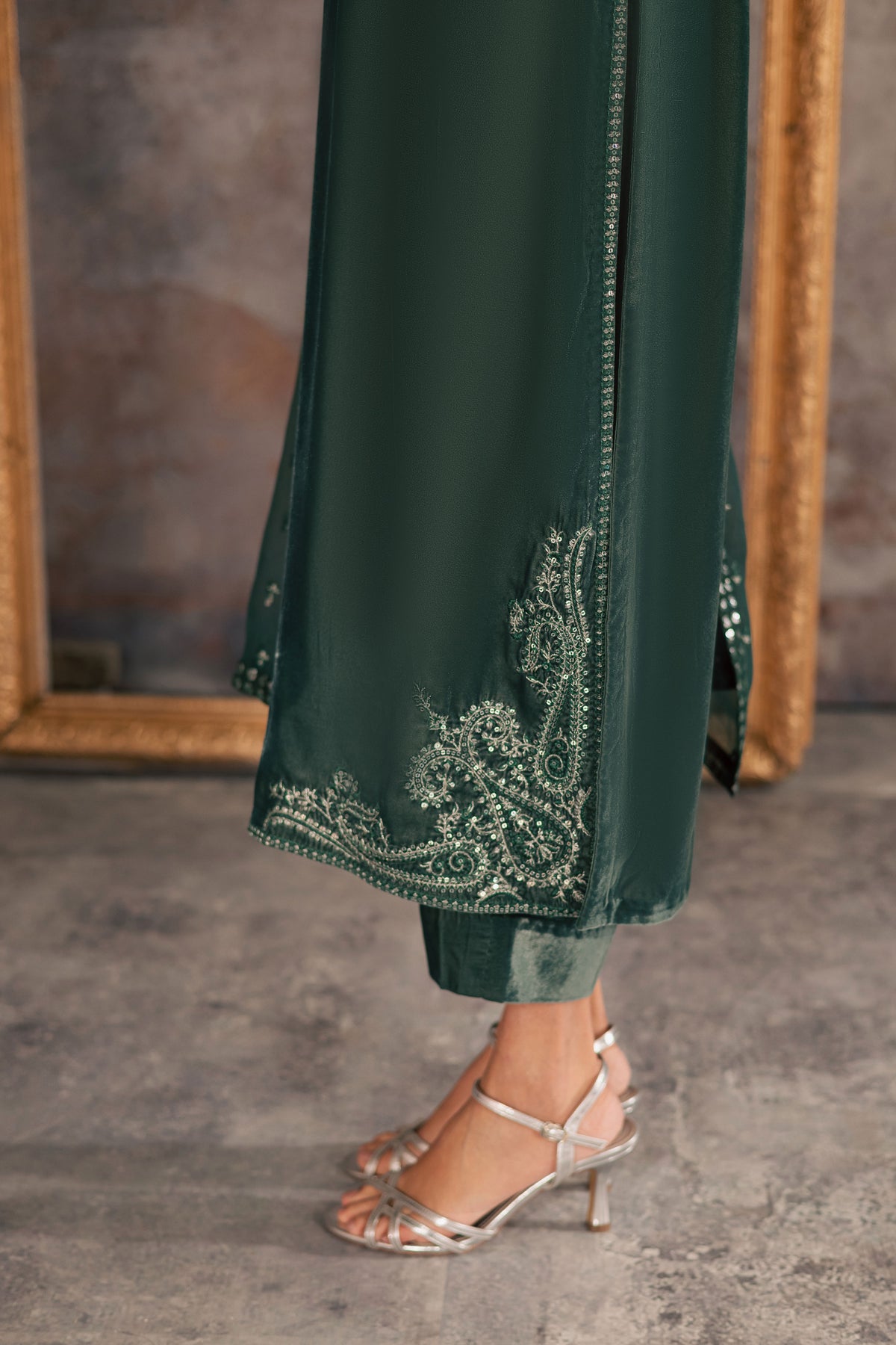 This elegant ash grey ensemble features a long velvet shirt with a composed embroidered neckline and hem, enhanced with delicate hand work and silver palette detailing. The subtle shimmer complements the soft depth of the velvet, creating a refined and graceful look. The mid length sleeves are finished with matching embroidery, adding balance and sophistication to the overall design.