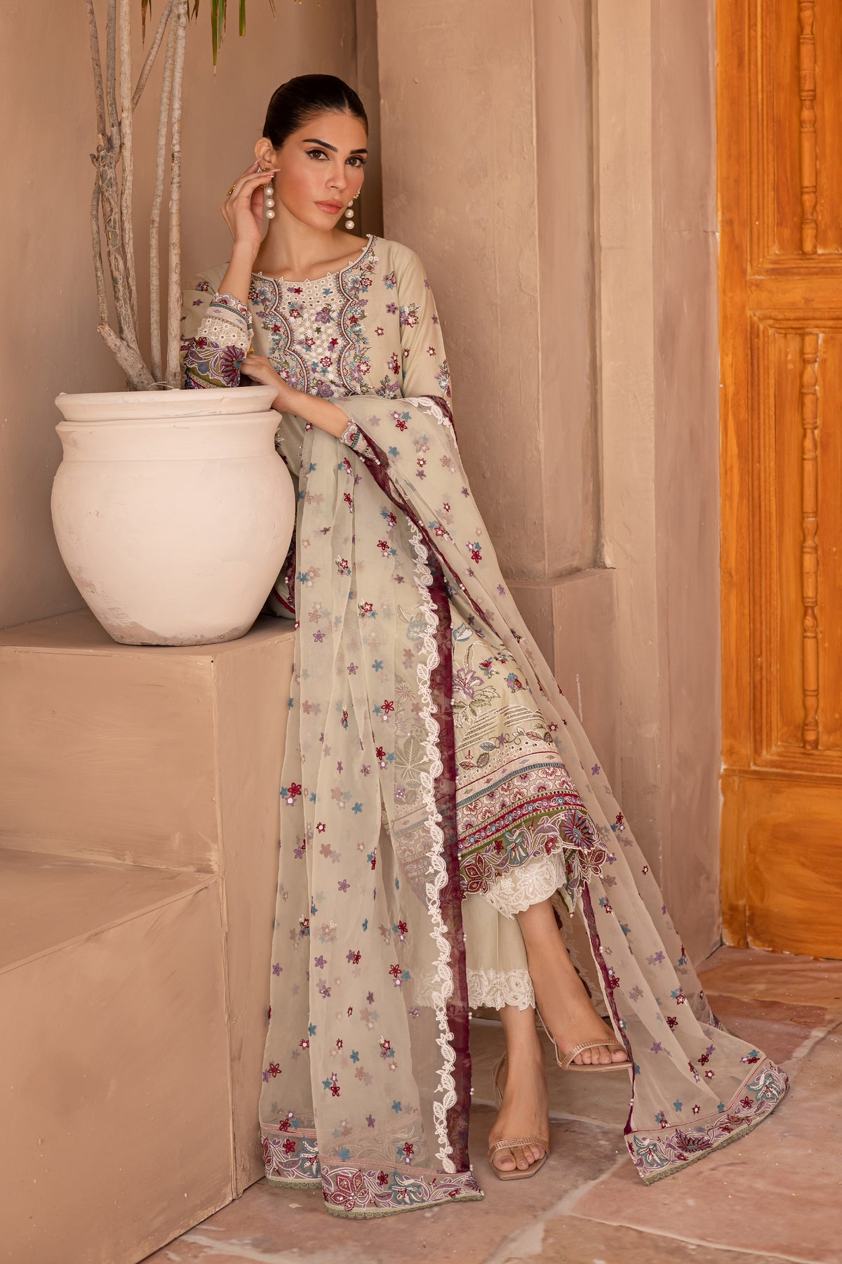 This beautifully embroidered pima lawn long shirt features intricate, heavily composed embroidery with elegant organza borders. The shirt is designed with fully composed embroidered fitted sleeves, adding a sophisticated, structured look.