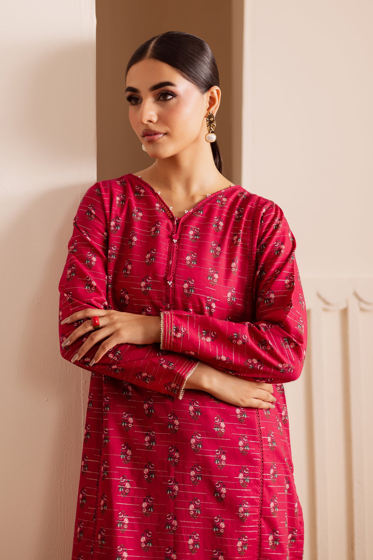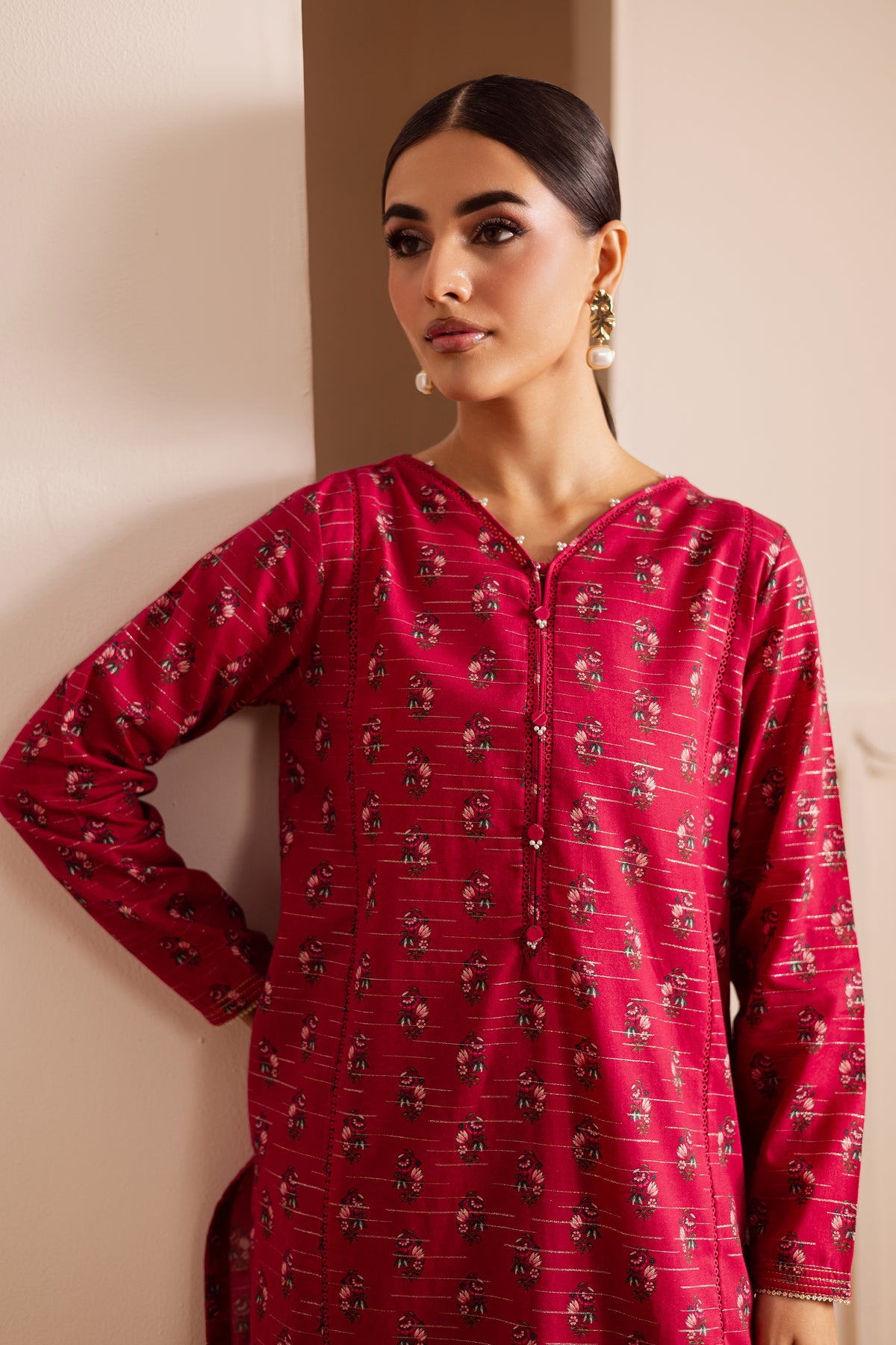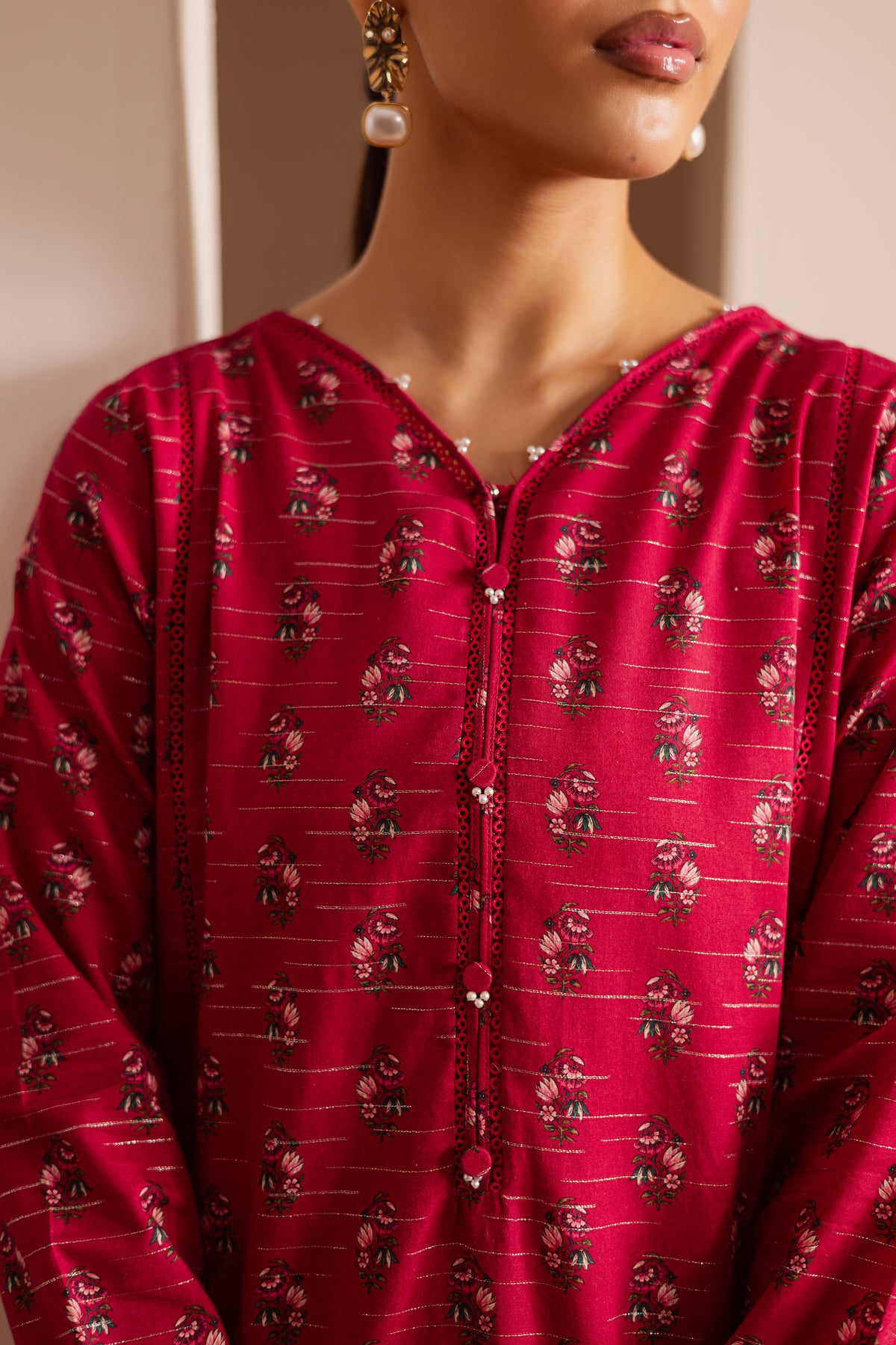 A digitally printed pink lawn zari jacquard short shirt on rich jacquard fabric, featuring a subtle play of texture and pattern. The design is accented with small embellishments on the neckline and sleeves, adding a hint of sparkle to its refined look.