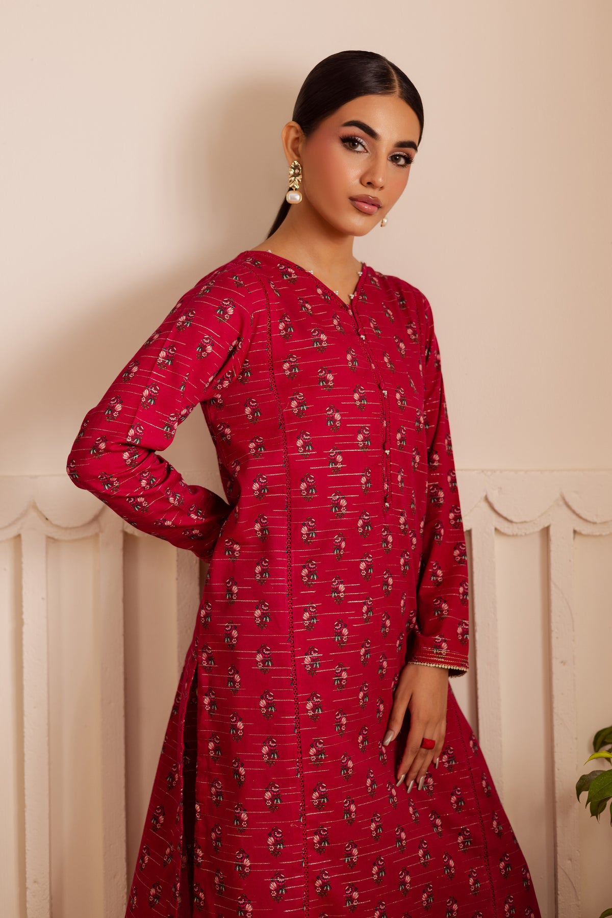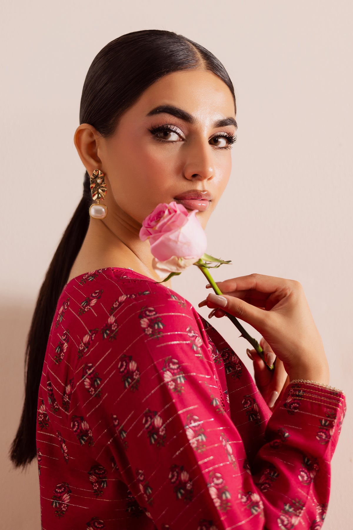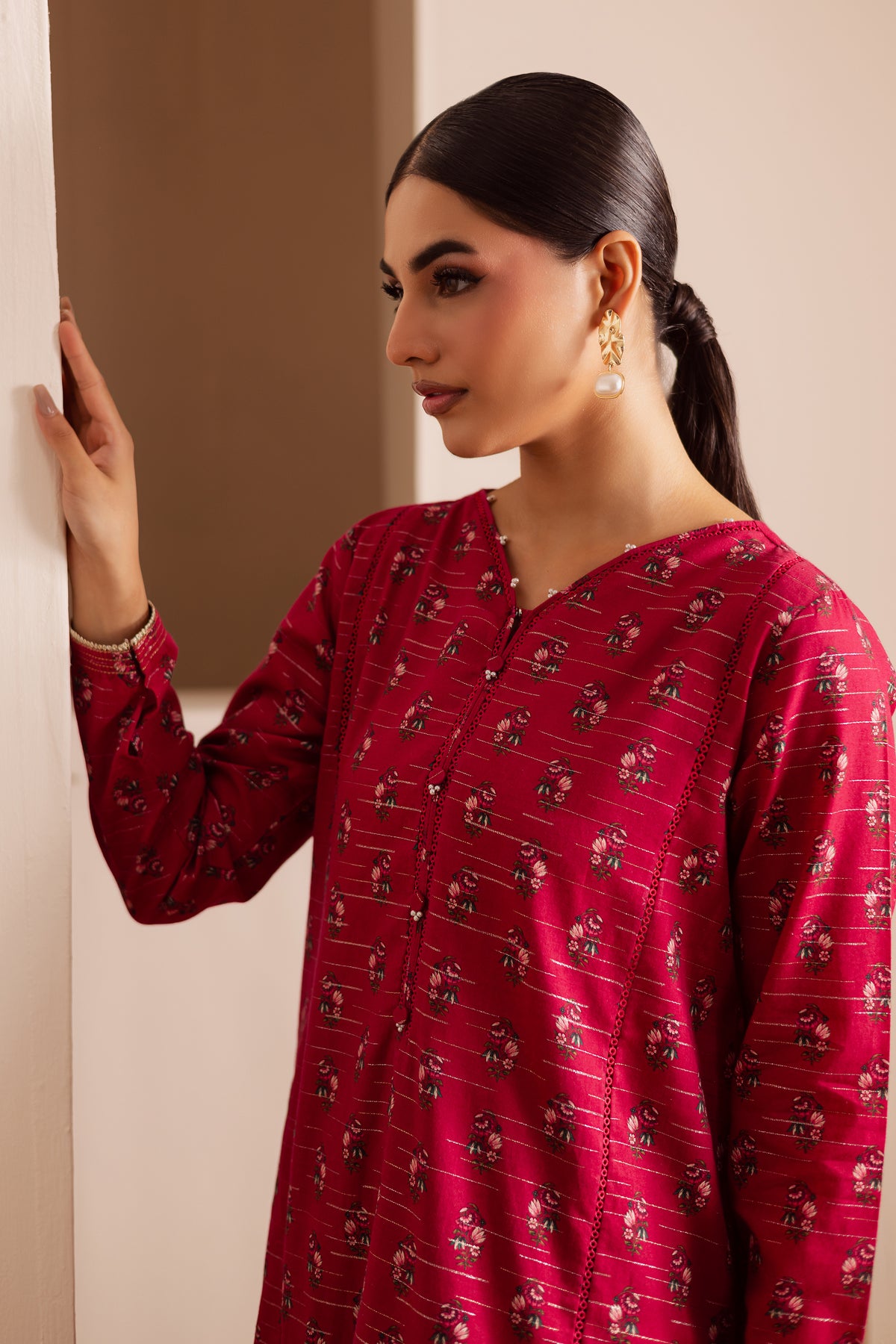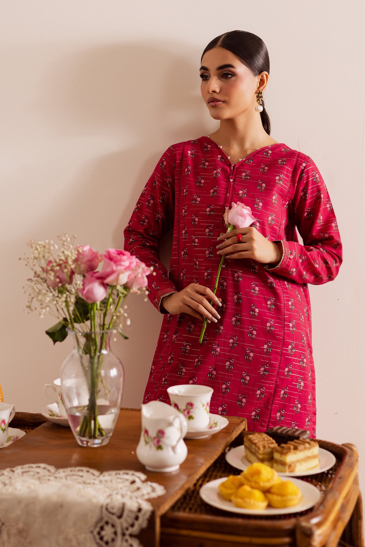 A digitally printed pink lawn zari jacquard short shirt on rich jacquard fabric, featuring a subtle play of texture and pattern. The design is accented with small embellishments on the neckline and sleeves, adding a hint of sparkle to its refined look.