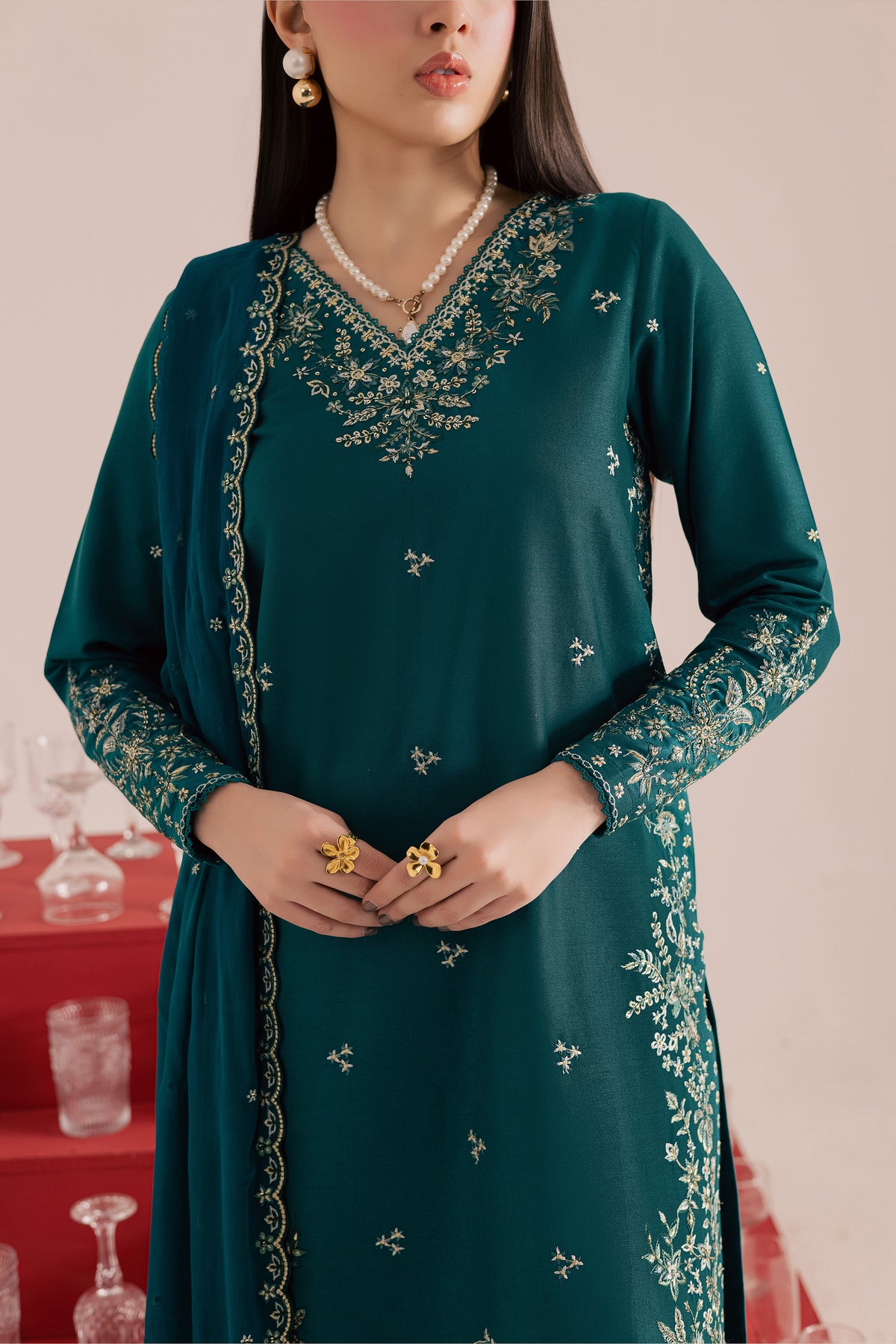This three piece shaded spruce khaddar set features a long shirt with a composed embroidered front and a graceful V neckline. The fitted sleeves carry matching composed embroidery, while the shirt is finished with lace at the neckline and hem for a refined finish.