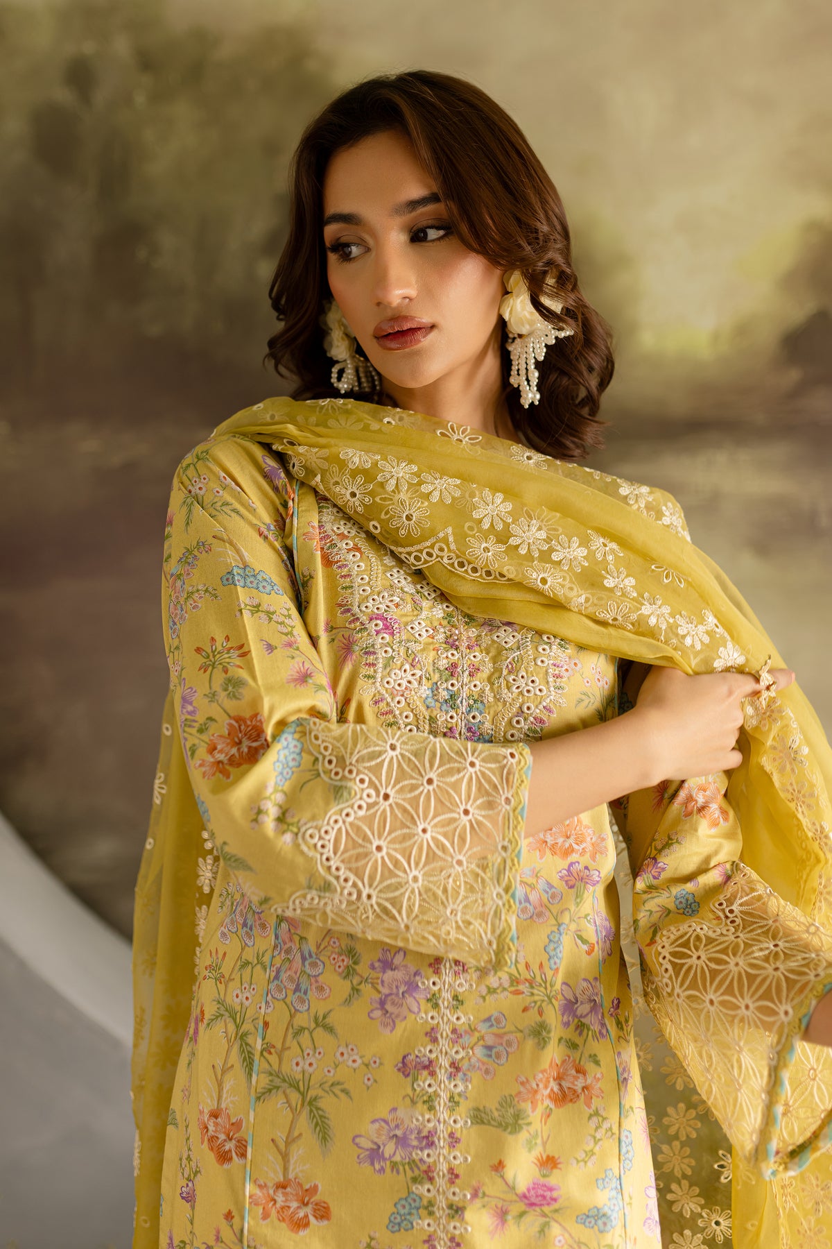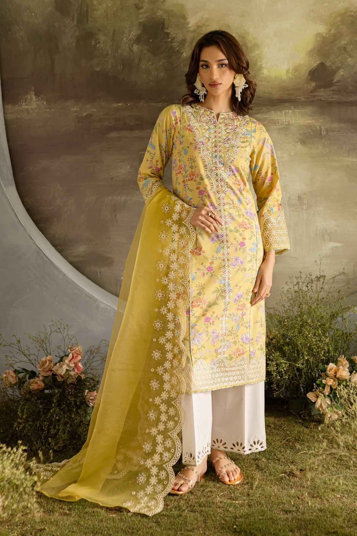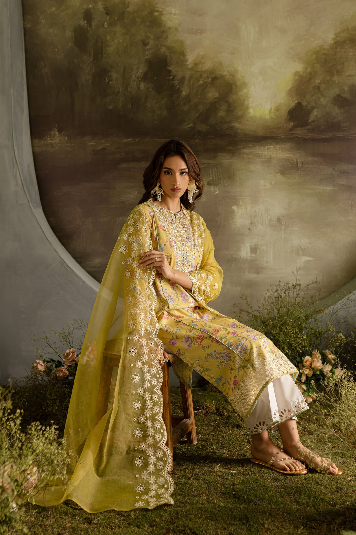 The yellow lawn shirt boasts a fully embroidered front, with a bold, heavy neckline that commands attention and adds a touch of regal elegance. The organza patch at the scalloped hem of the shirt introduces a delicate, layered texture, enhancing the overall design with intricate detail.