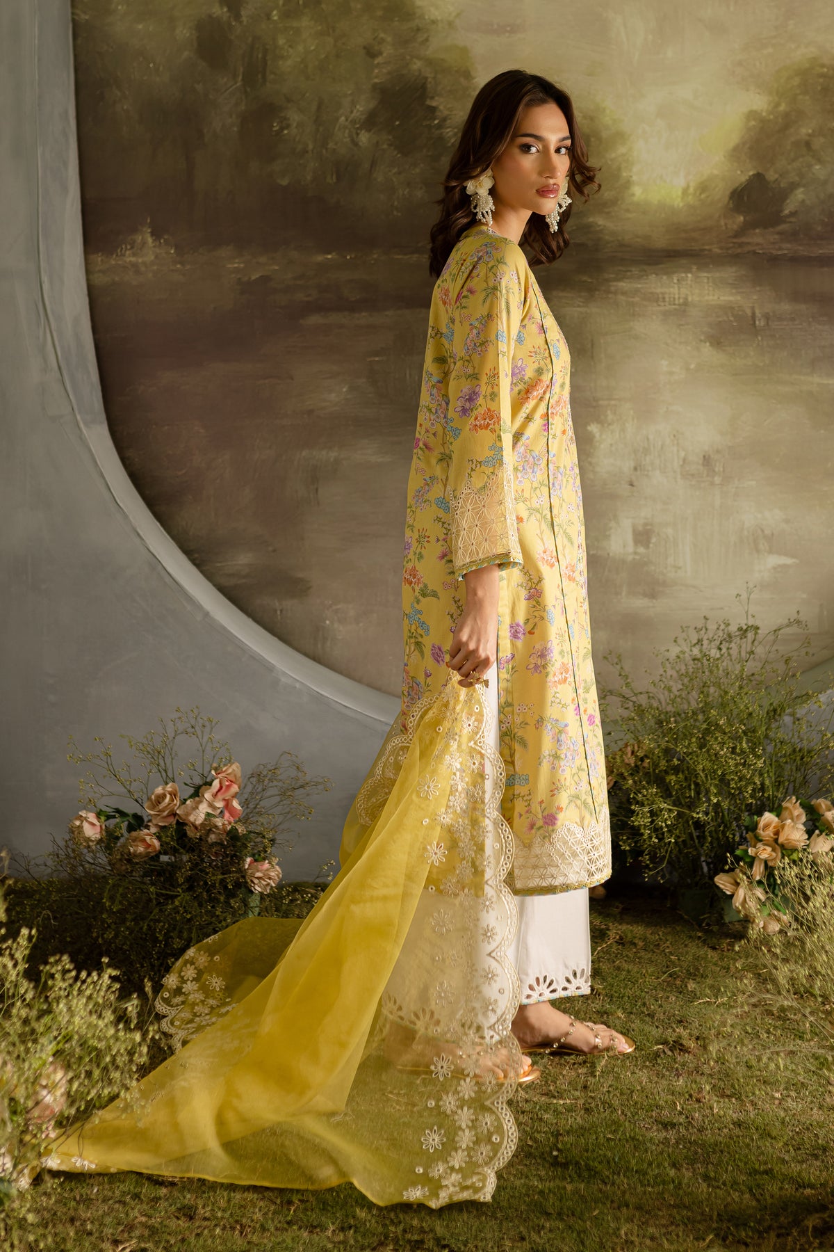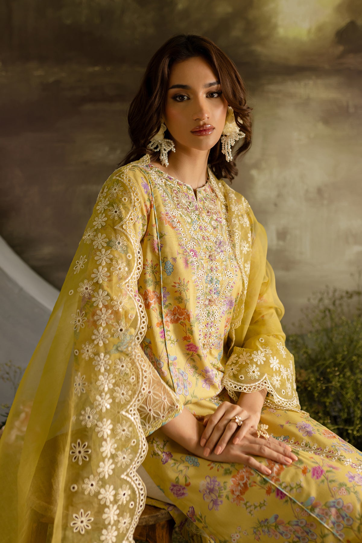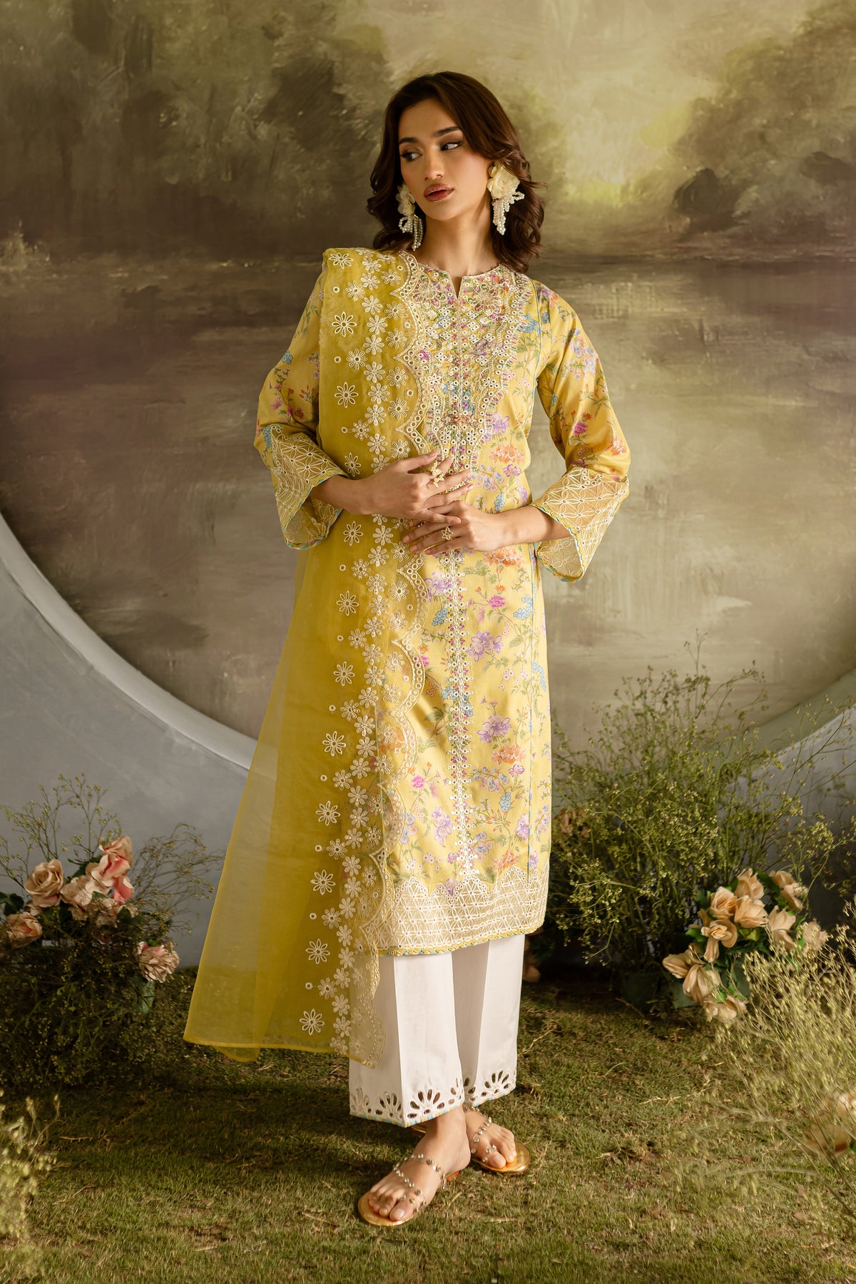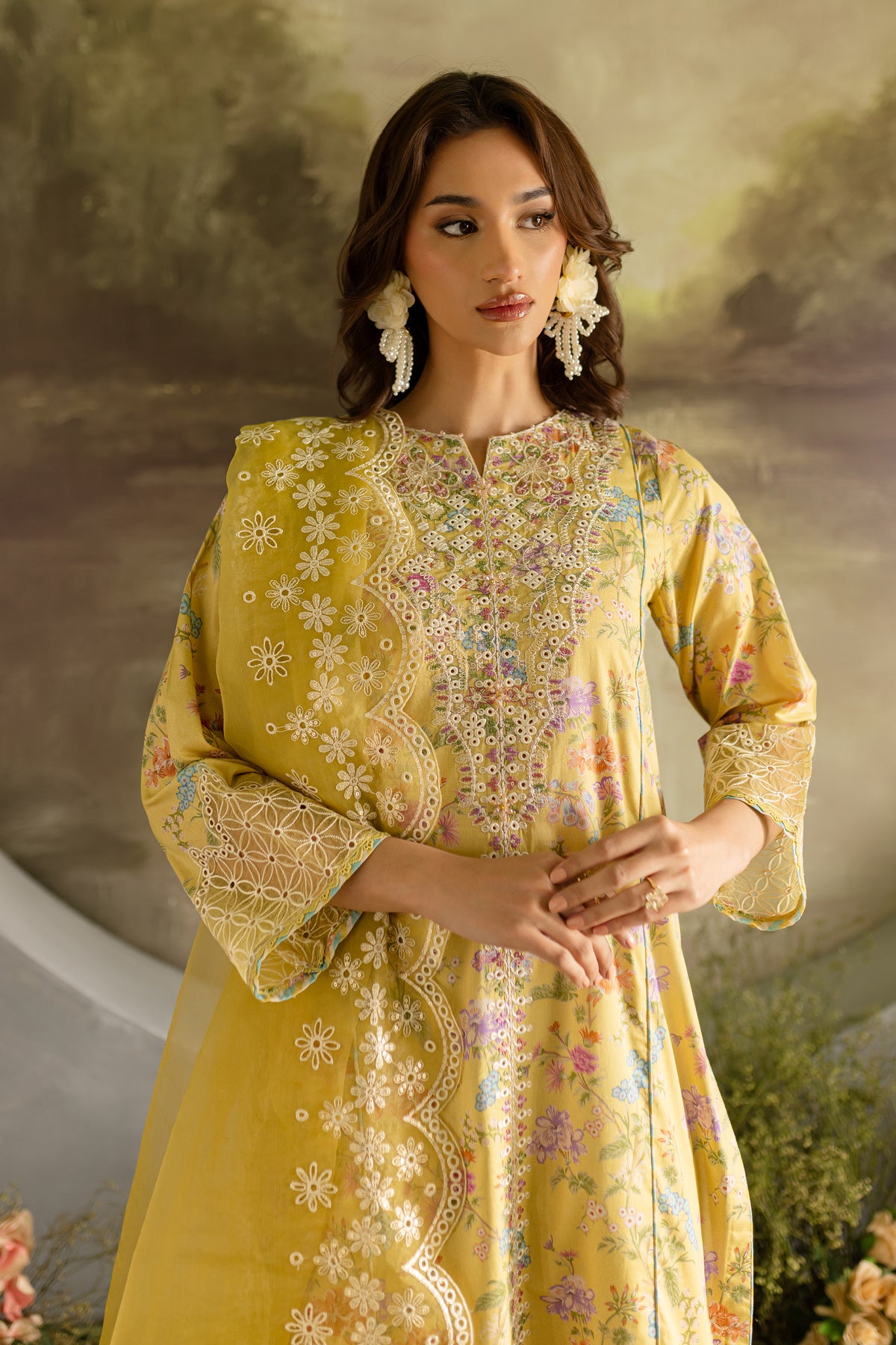 The yellow lawn shirt boasts a fully embroidered front, with a bold, heavy neckline that commands attention and adds a touch of regal elegance. The organza patch at the scalloped hem of the shirt introduces a delicate, layered texture, enhancing the overall design with intricate detail.