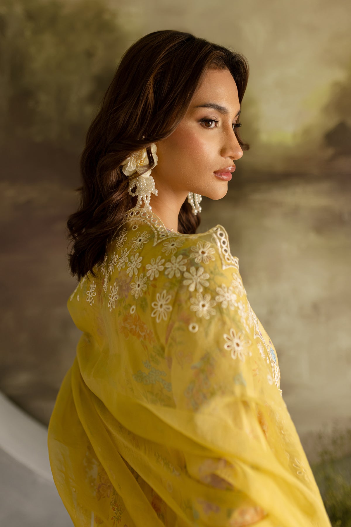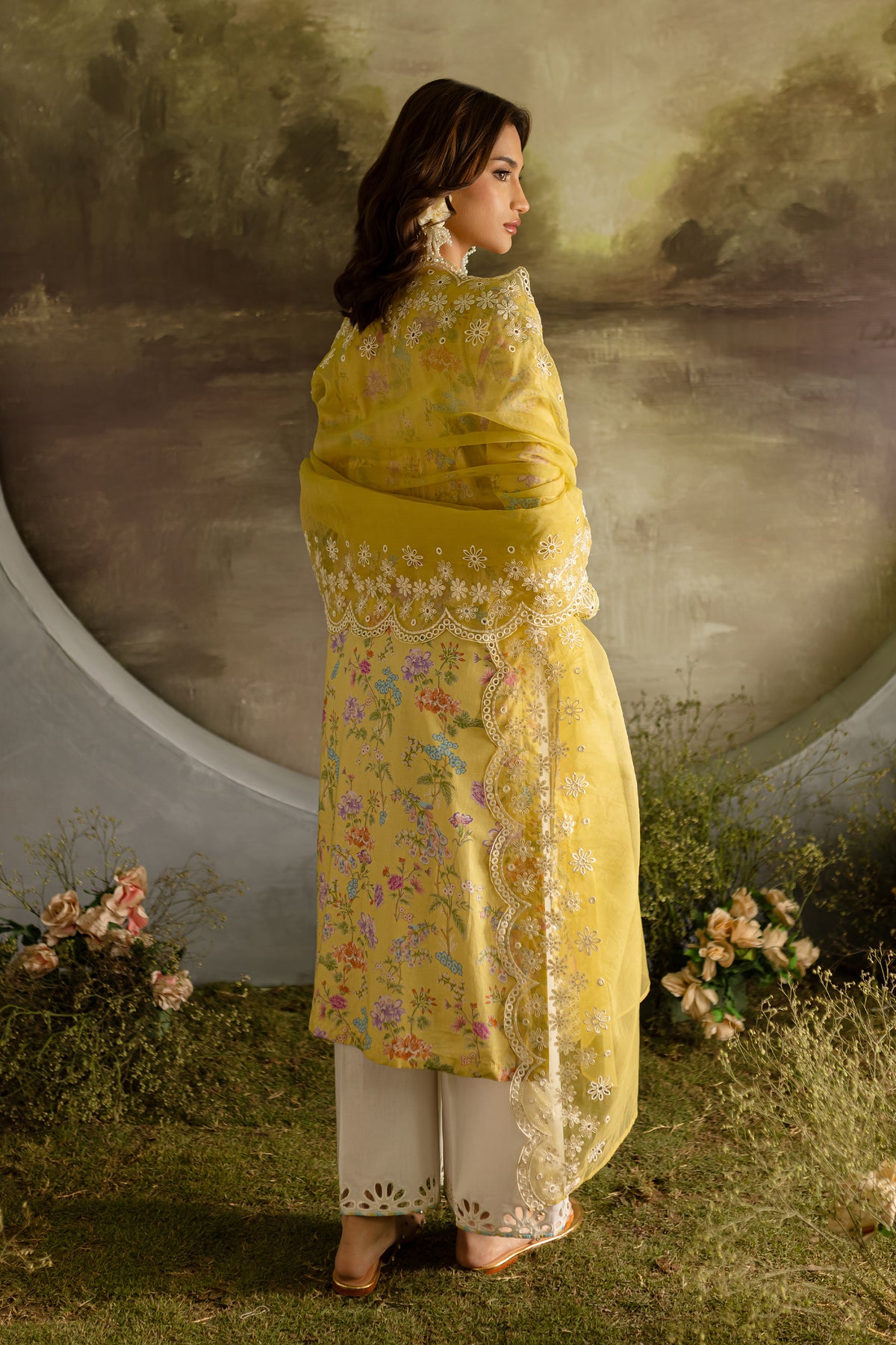The organza dyed dupatta features scalloped borders with bow detailing, adding a soft, feminine touch that ties the entire look together. The intricate embroidery at the sides elevates the dupatta, making it the perfect finishing piece for this bright and elegant ensemble.