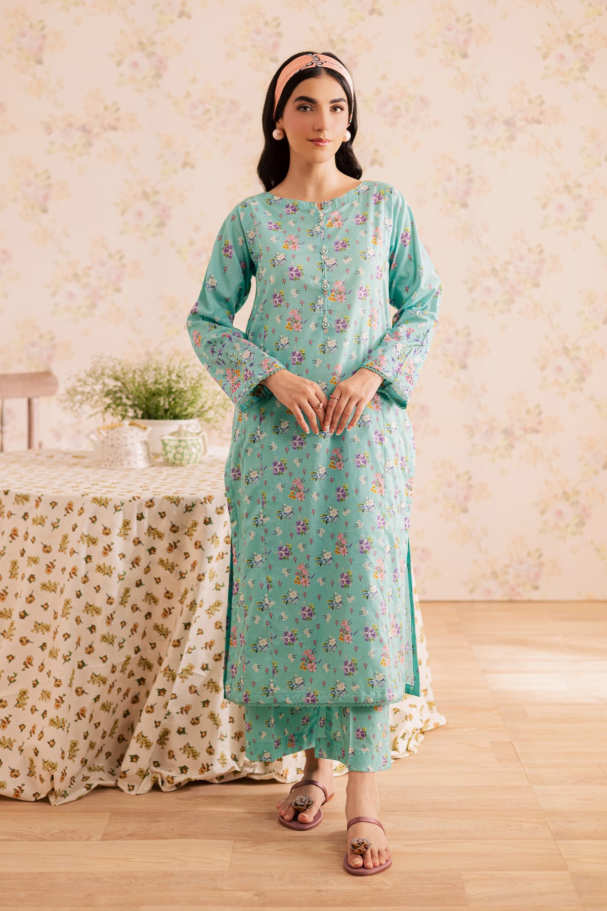 A beautifully printed blue lawn long shirt forms the highlight of this refined ensemble, featuring an embellished neckline adorned with a delicate pearl and button collage. The intricate accents add a touch of understated glamour, perfectly balancing tradition with contemporary flair.