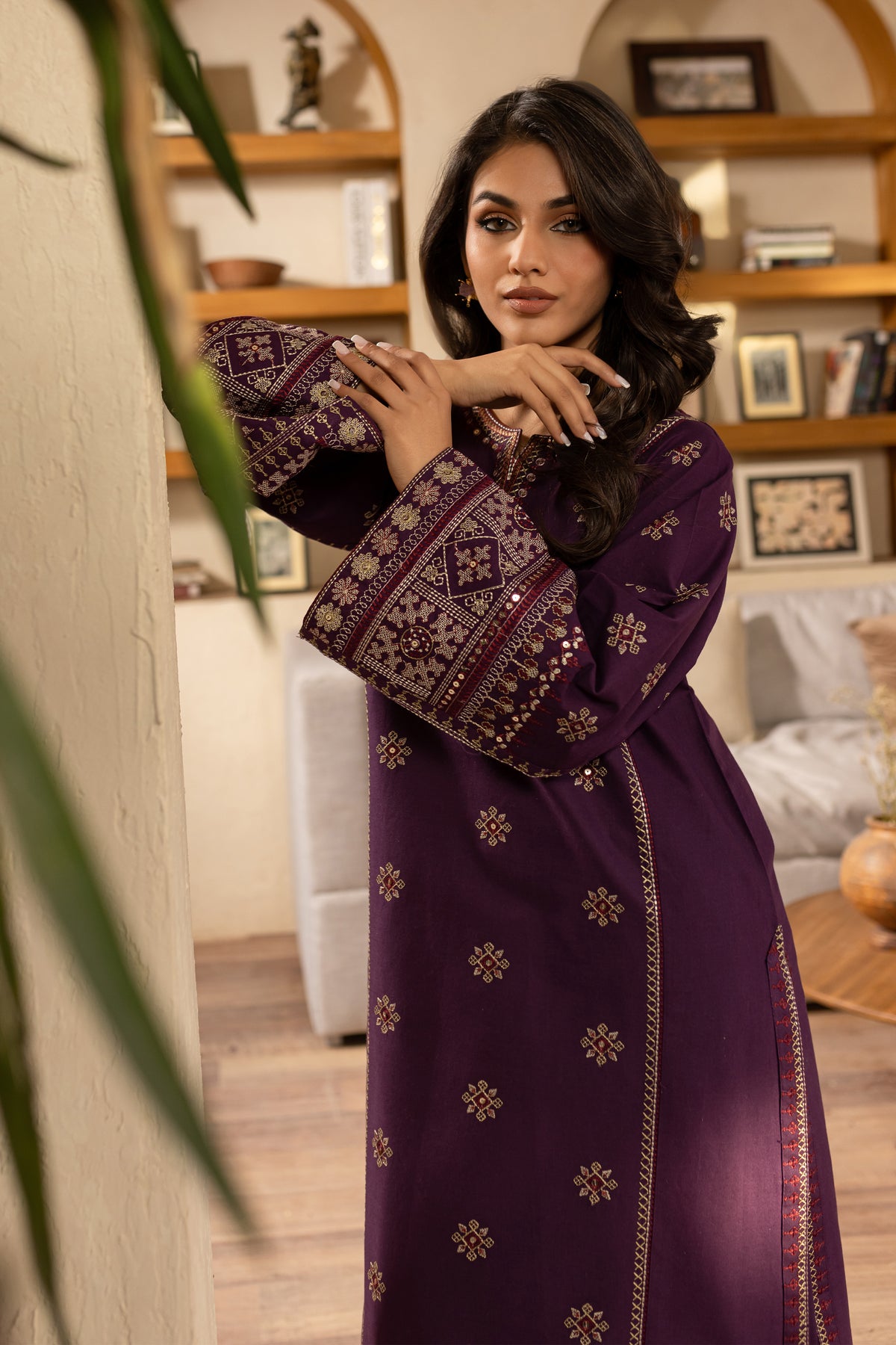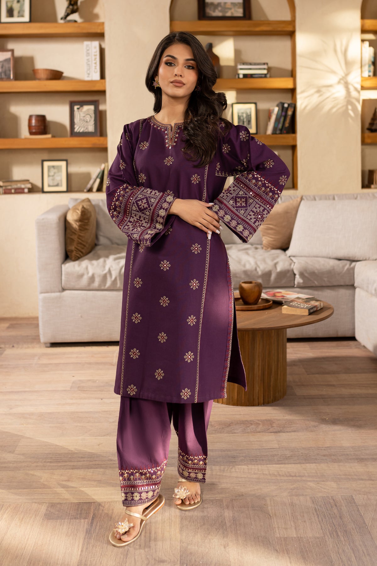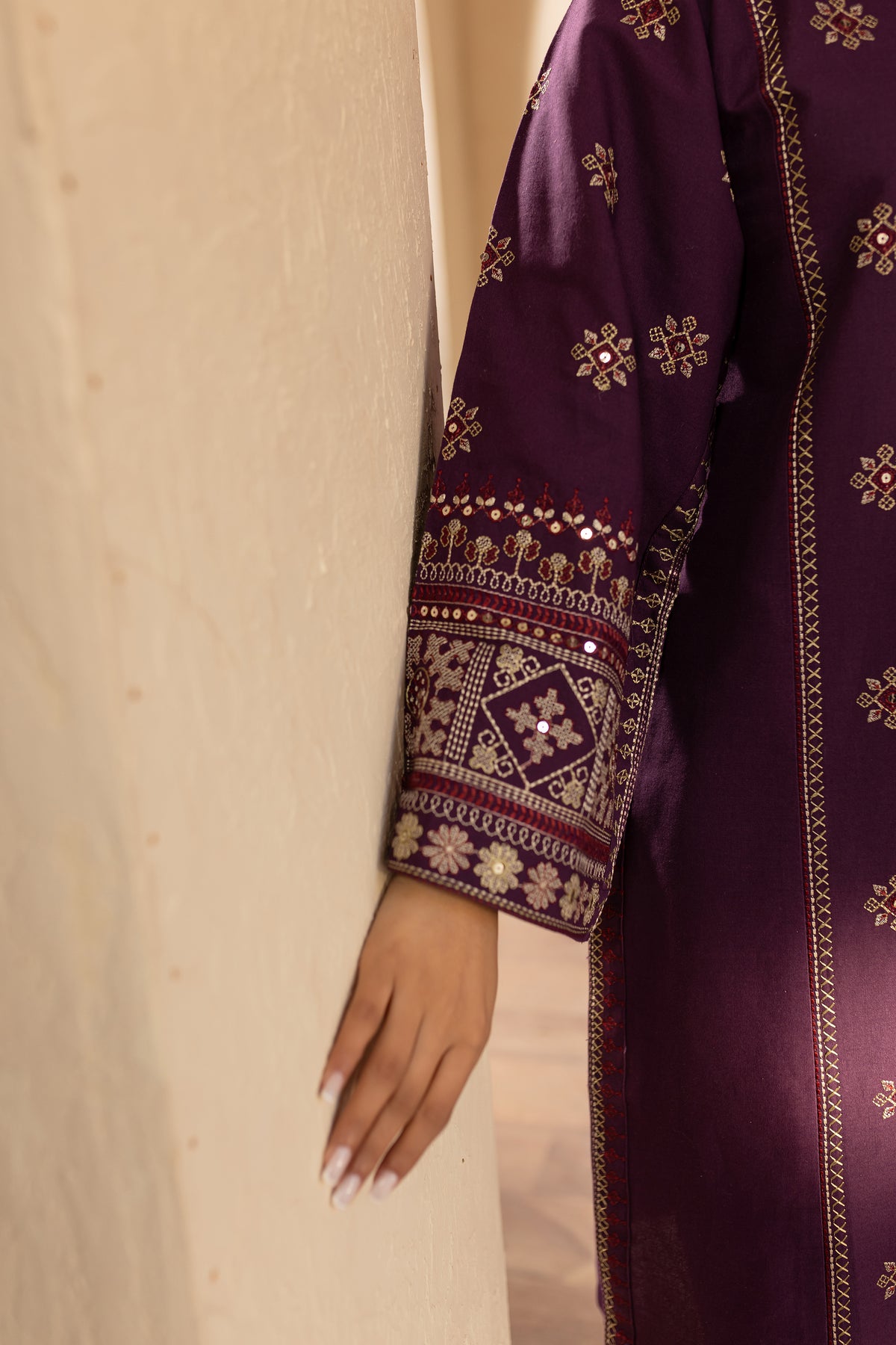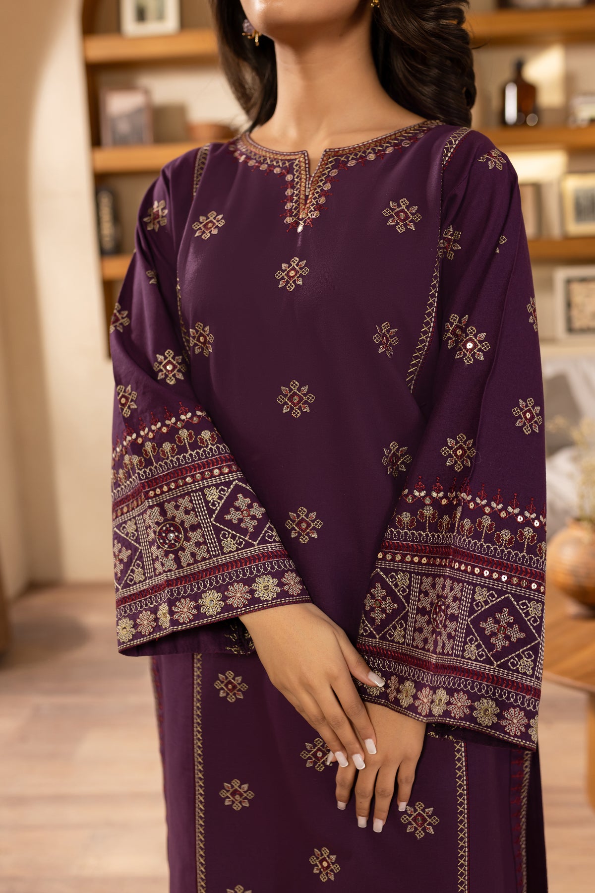 This elegant embroidered purple khaddar dress features heavy embroidery on the sleeves, adding a luxurious and detailed touch to the classic fabric. The intricate sleeve embroidery enhances the overall design, offering a blend of traditional craftsmanship with modern sophistication.