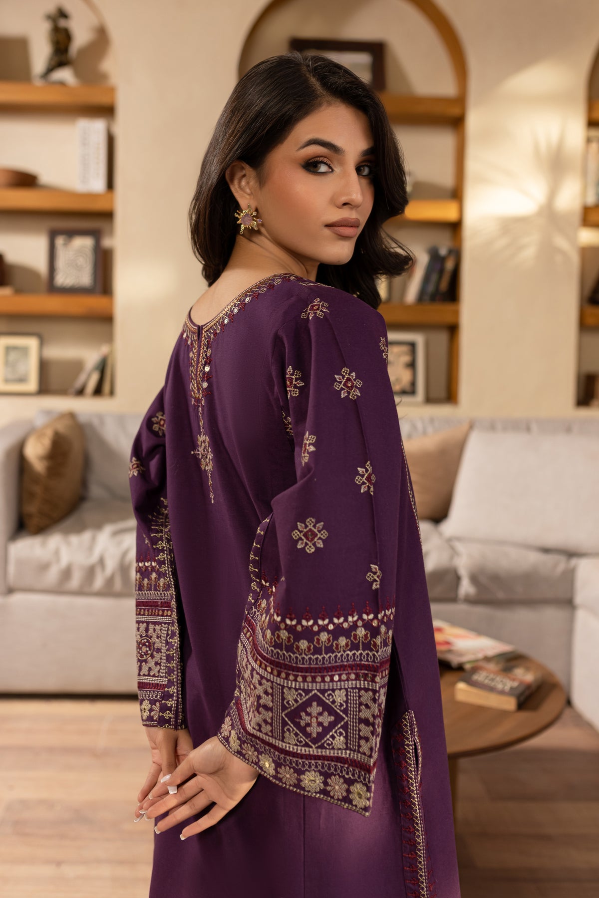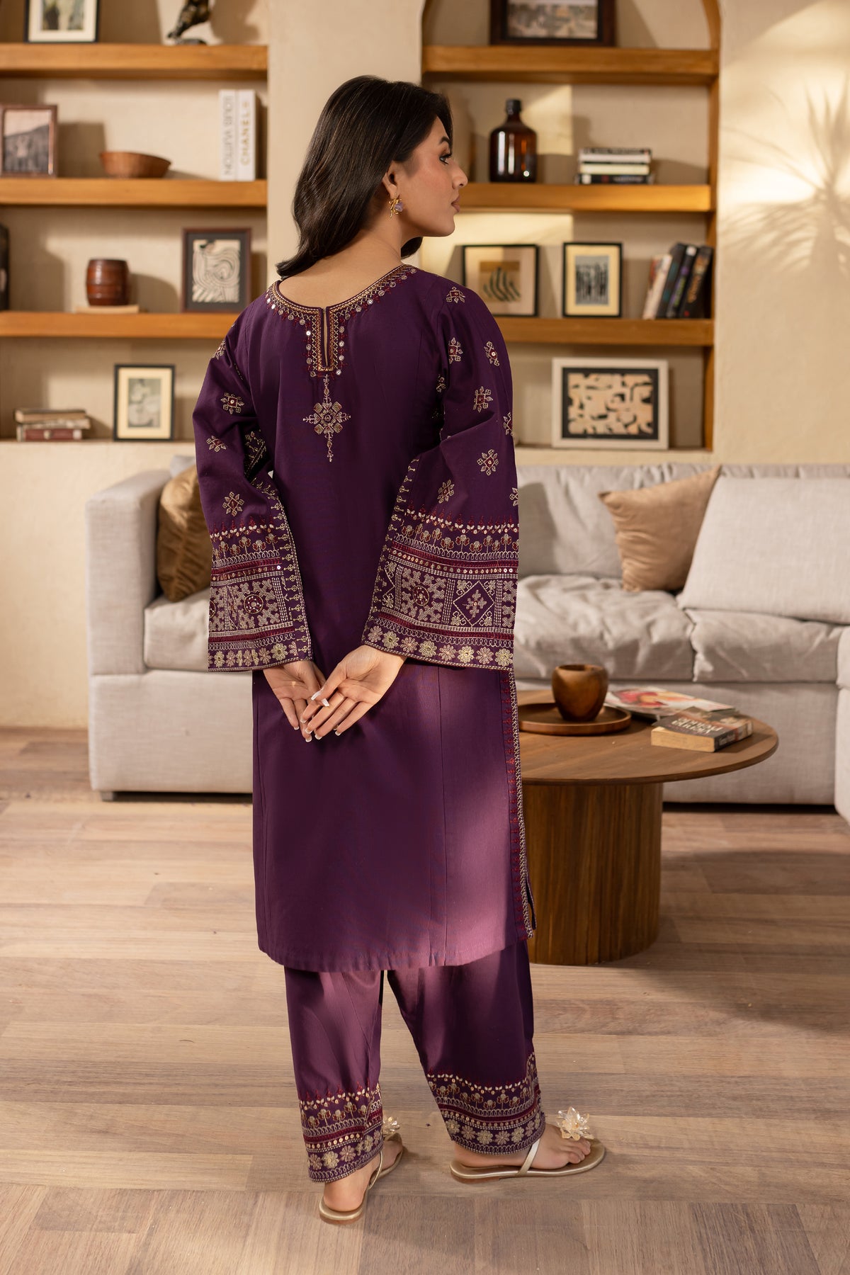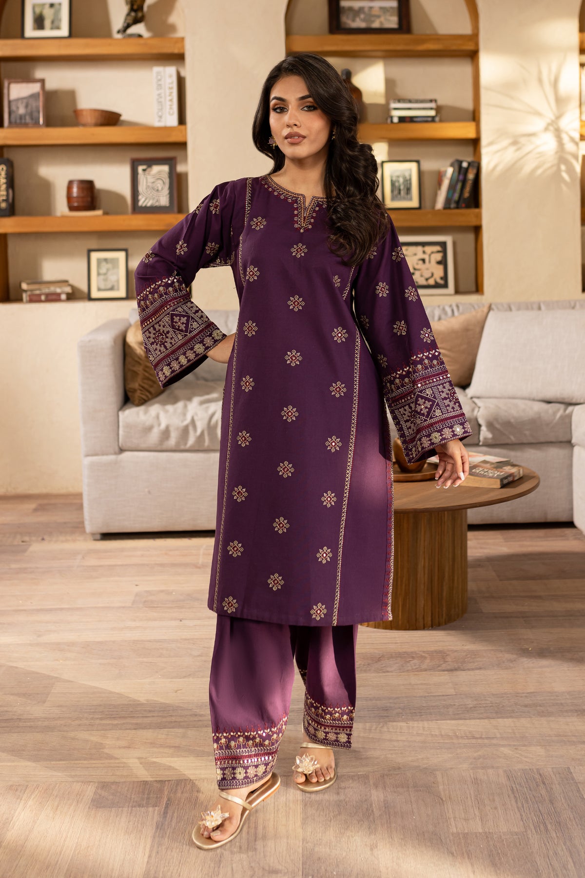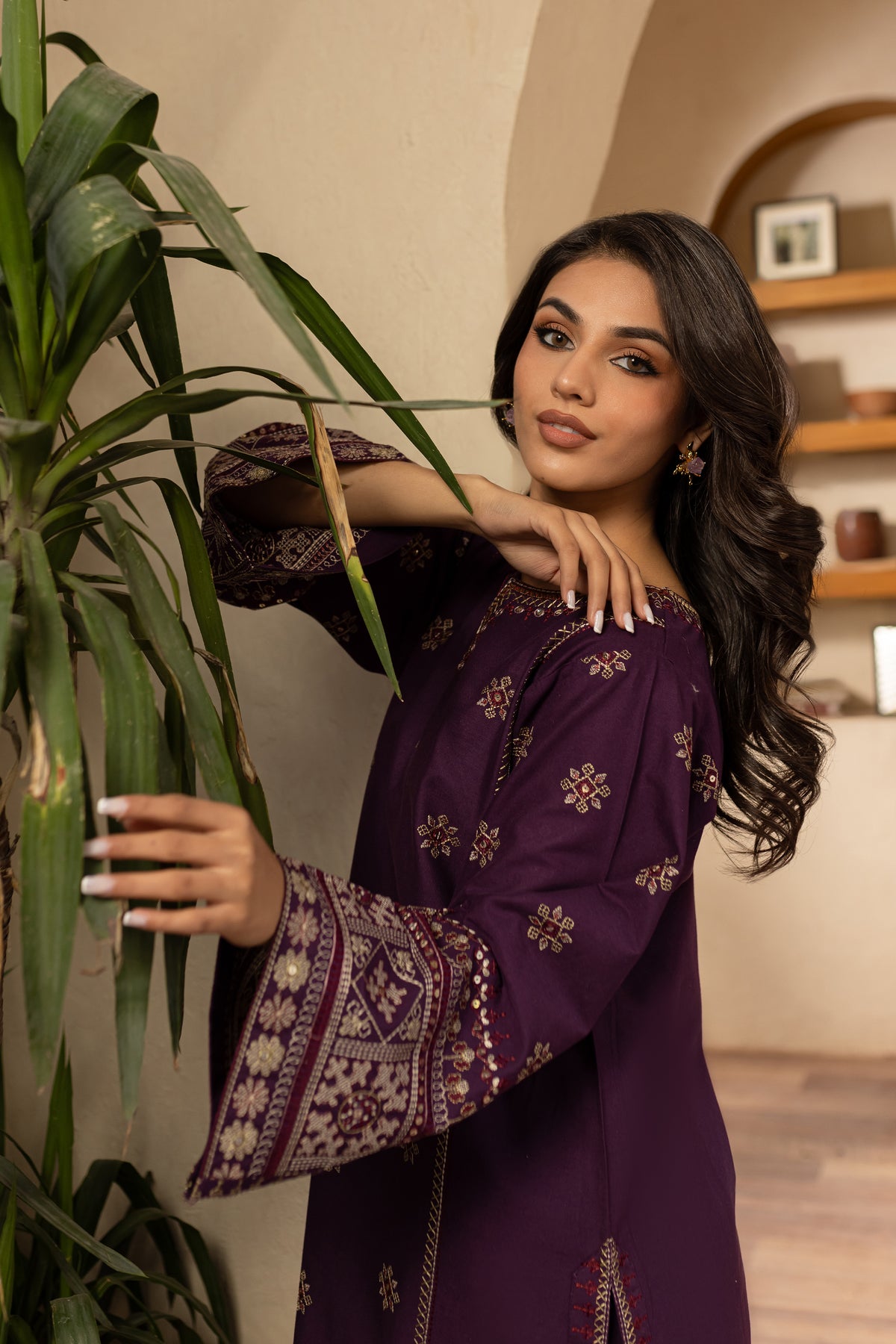 This elegant embroidered purple khaddar dress features heavy embroidery on the sleeves, adding a luxurious and detailed touch to the classic fabric. The intricate sleeve embroidery enhances the overall design, offering a blend of traditional craftsmanship with modern sophistication.