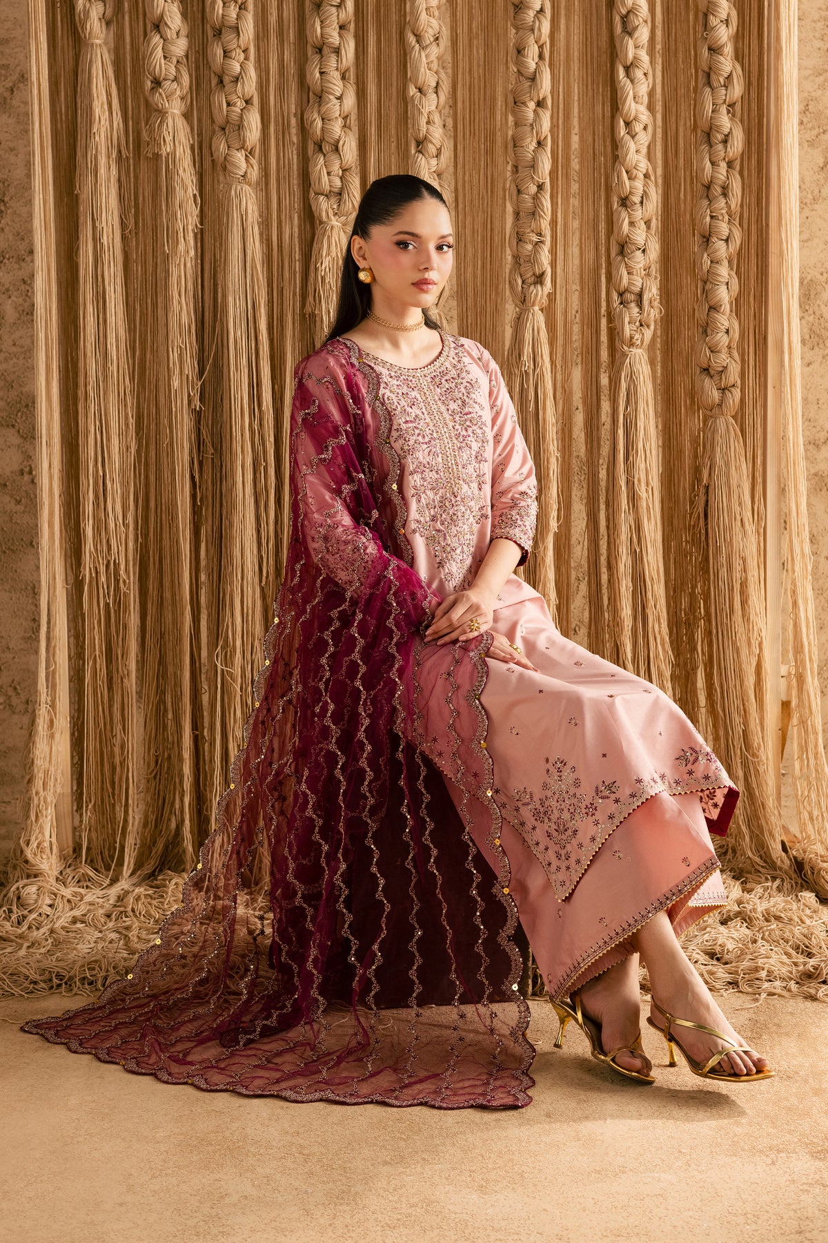 A net dupatta with heavy embroidery and scalloped pallus completes the ensemble, adding soft texture and a sophisticated festive flourish.