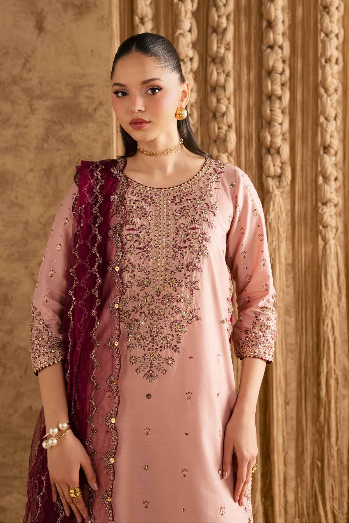 A long composed Taffty Pink embroidered shirt featuring a ling neckline, adorned with intricate adda work throughout. The shirt showcases composed side seams on the front and back with contrasting fabric details and all-over contrast facing, creating a rich Festive Eid look. Three-quarter sleeves carry matching composed embroidery with delicate adda accents.