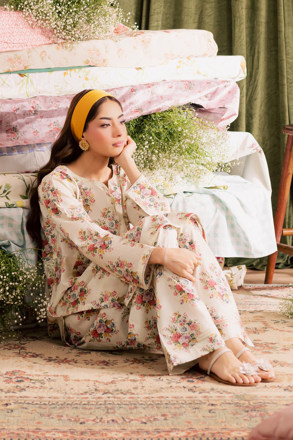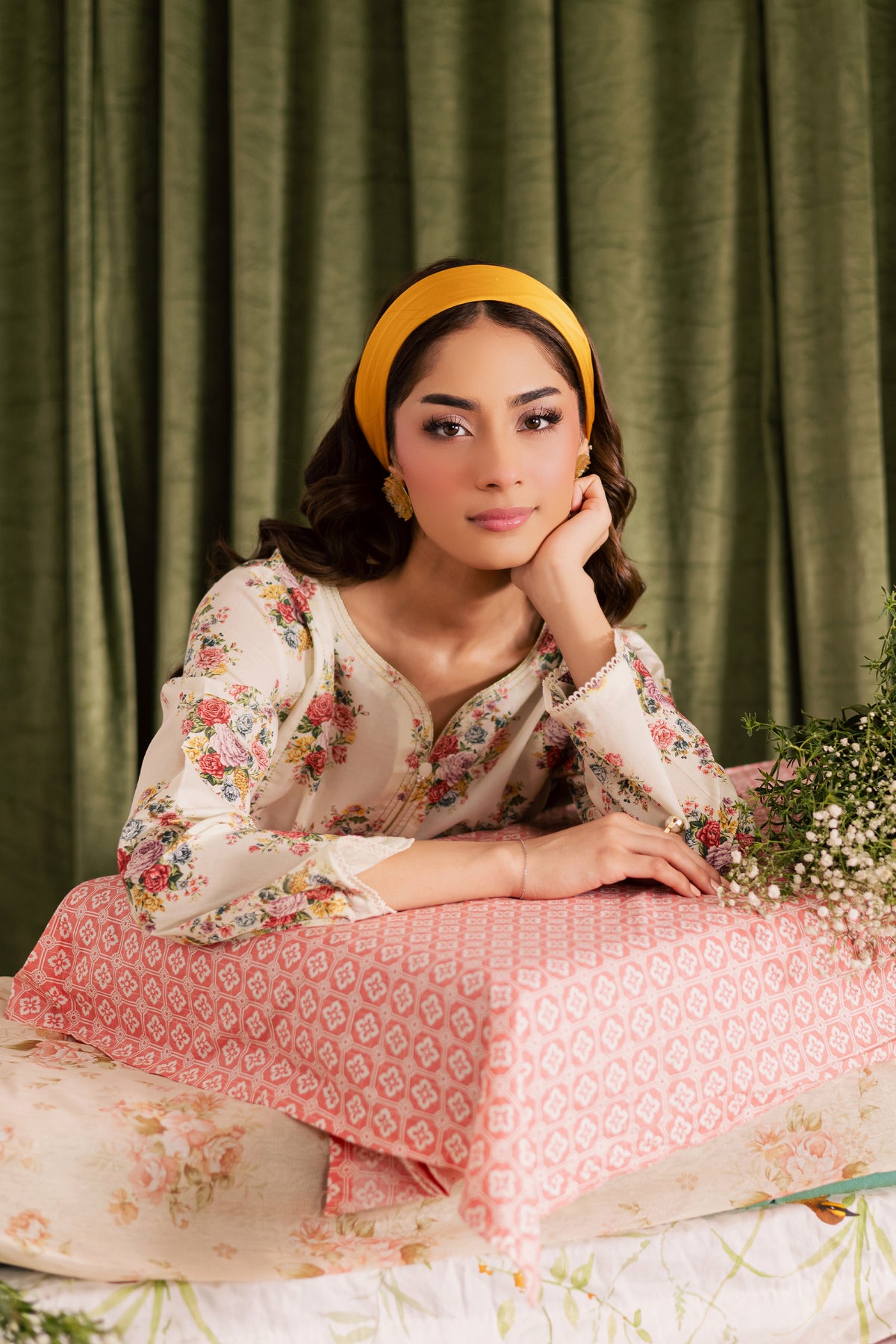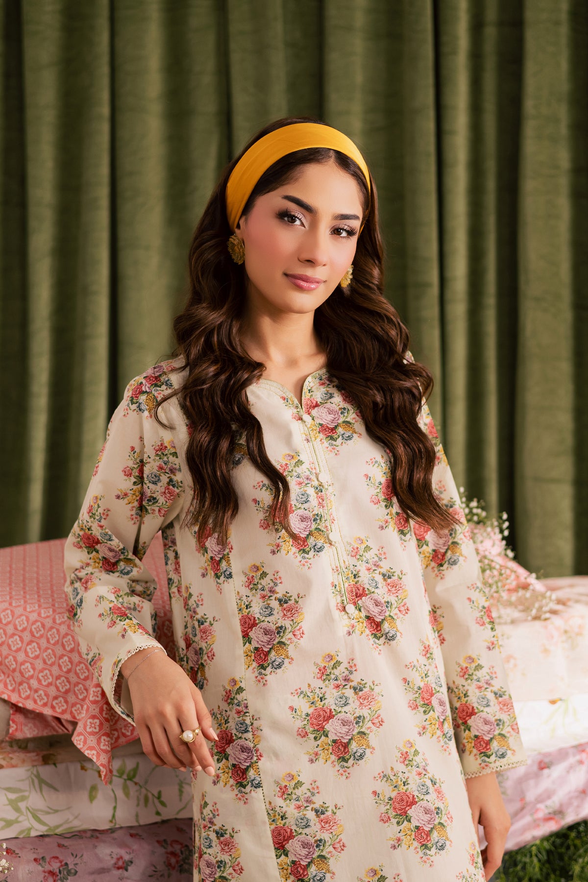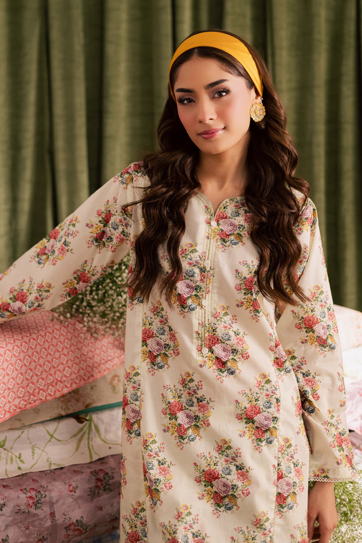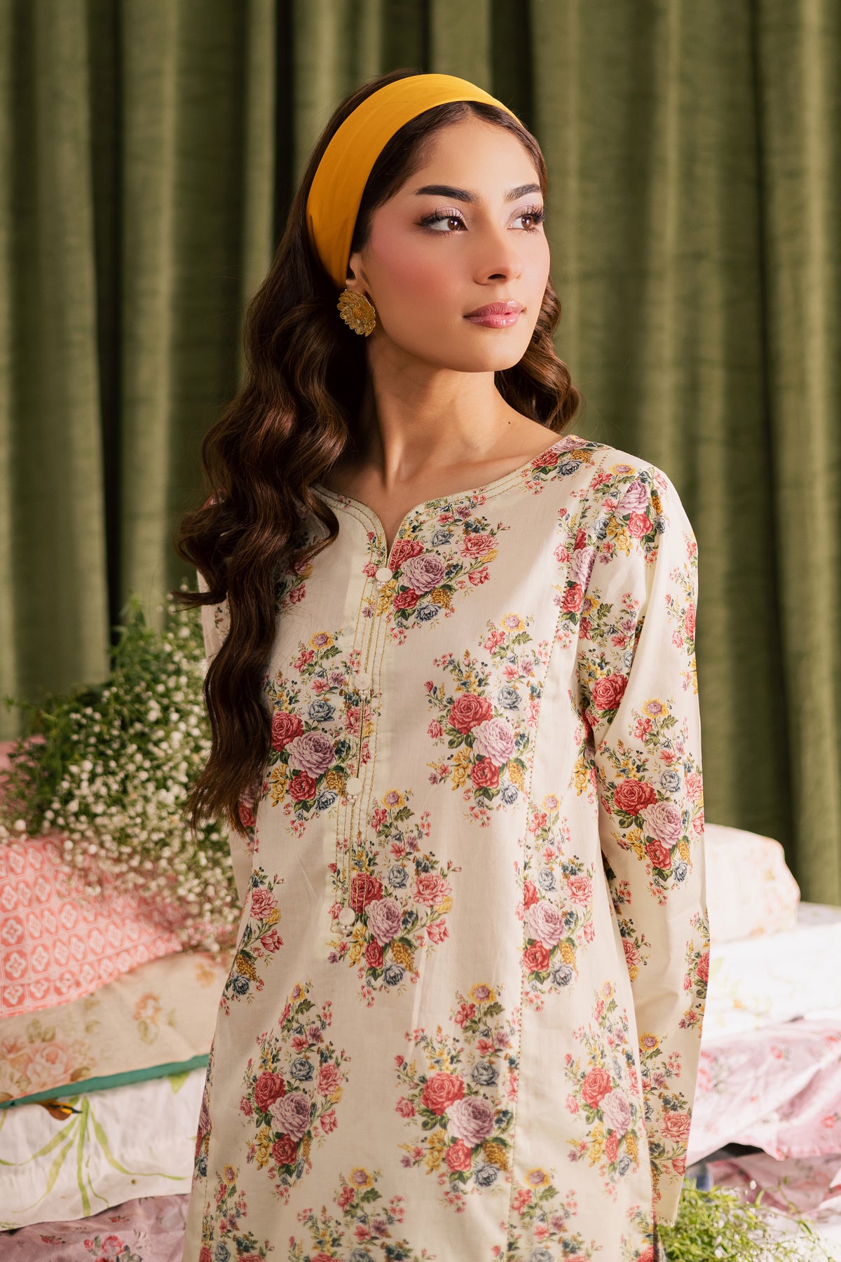 It is paired with a beautifully printed cambric Farshi shalwar, enhanced with gold dori stitching along the hem - adding a hint of festive charm and sophistication. Perfect for refined daytime wear or intimate gatherings.