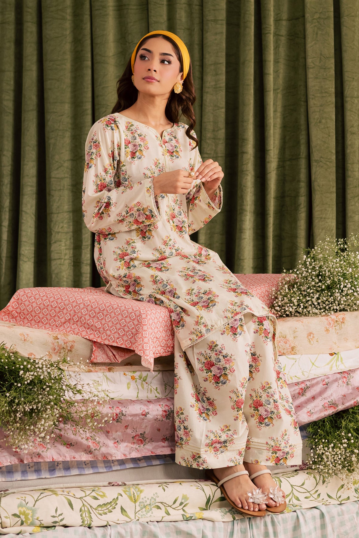 An elegant off-white lawn digital printed mid-length shirt sets a refined tone for this timeless ensemble. Subtle detailing along the neckline and delicate lace finishing add a graceful touch to the classic silhouette.