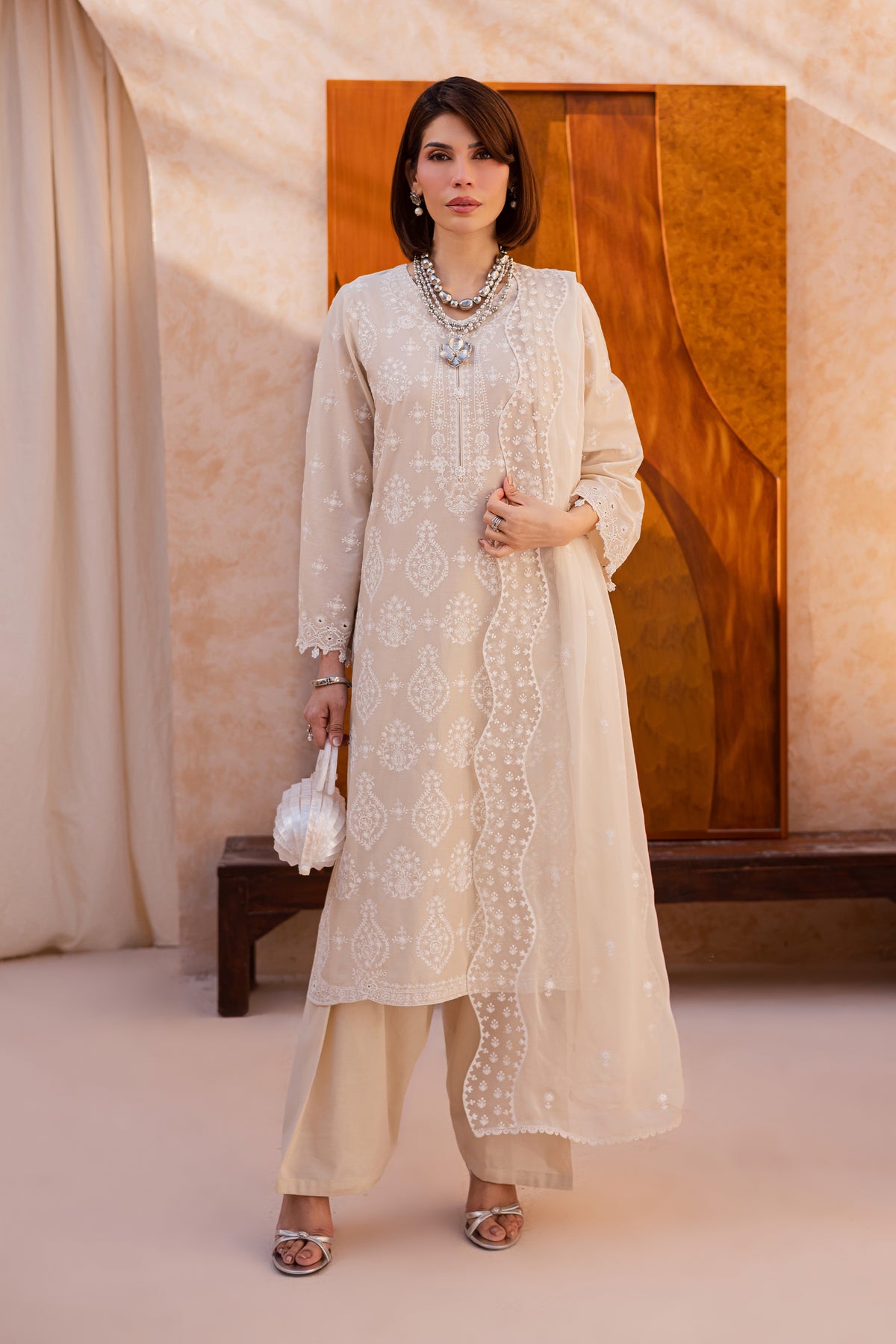 This three-piece ensemble features a fully embroidered shirt with sleeves, detailed with intricate threadwork and finished with delicate kawiya and pearl accents that enhance the silhouette with luminous festive elegance.