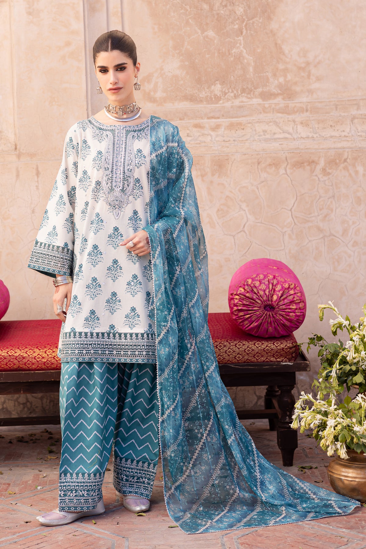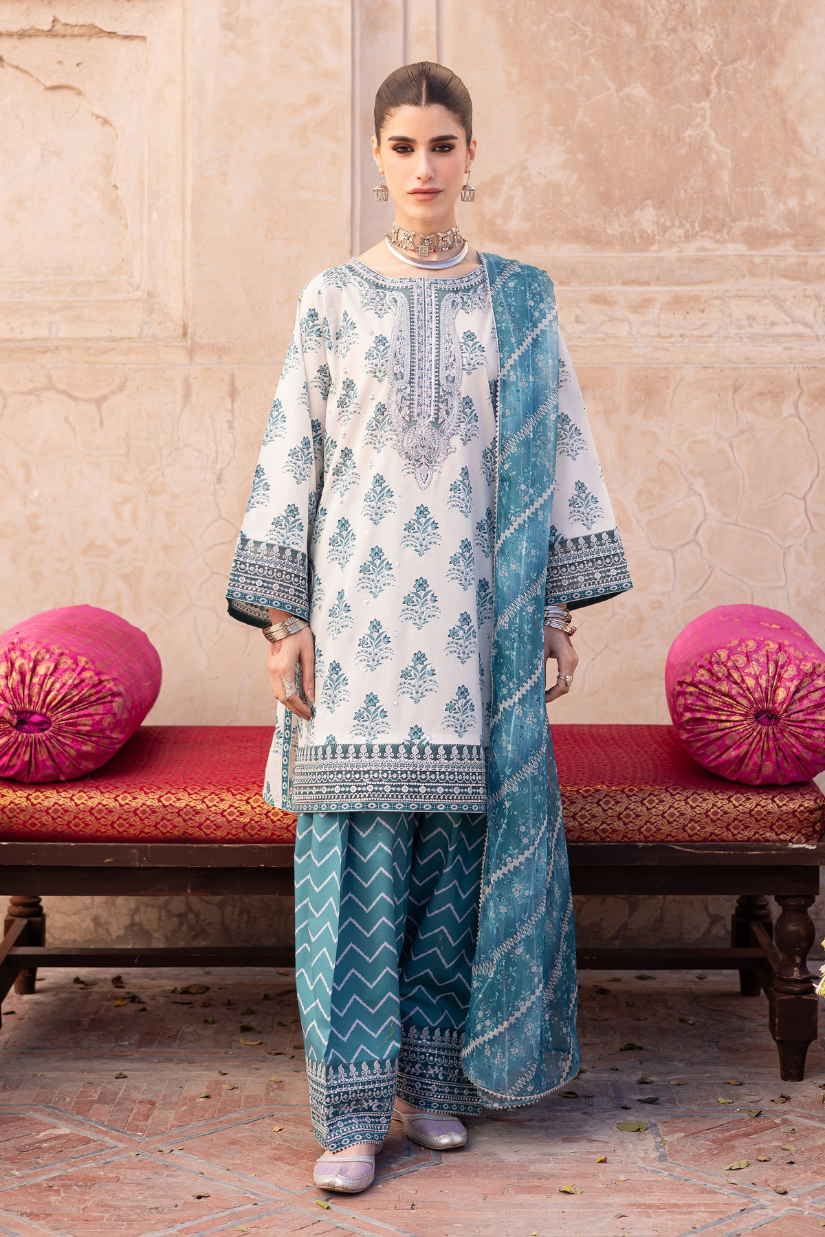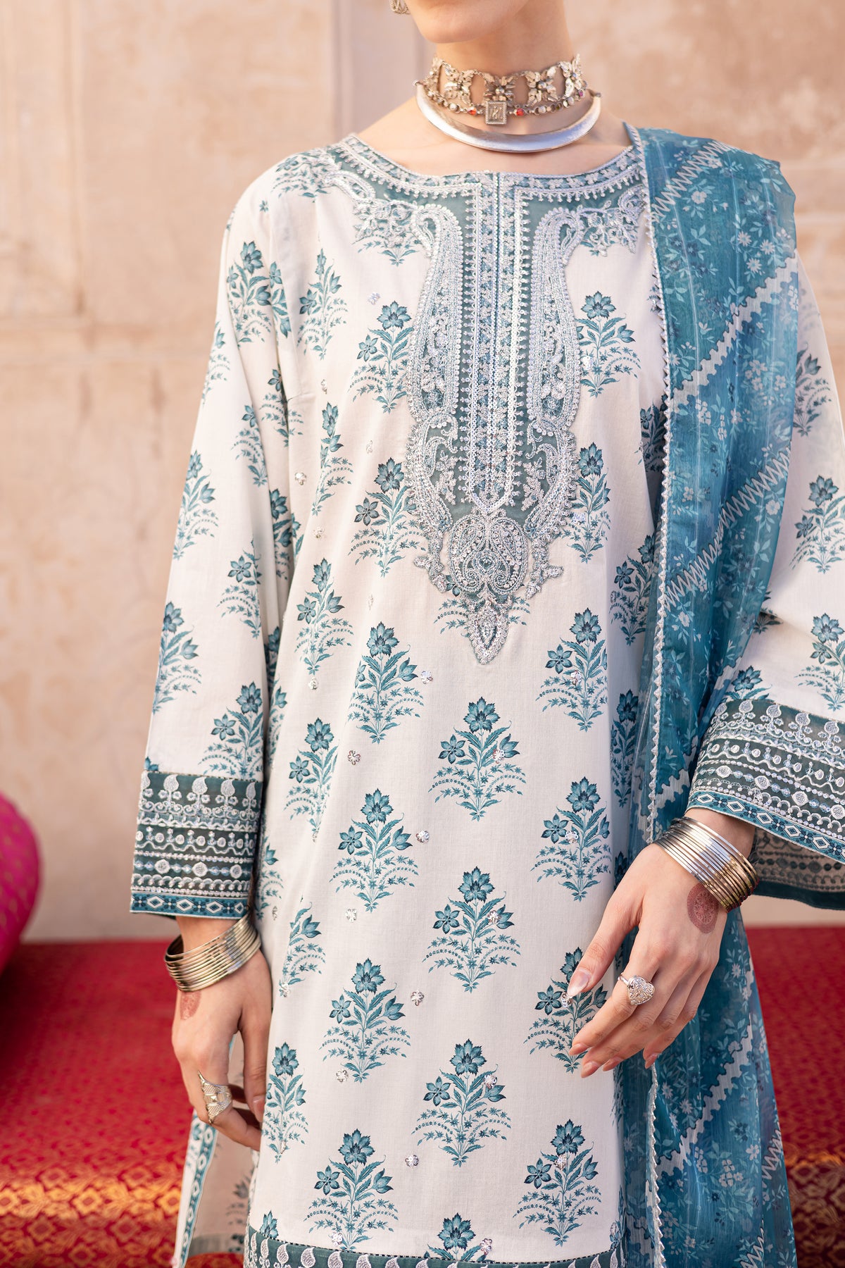 This printed off white lawn shirt is adorned with exquisite embroidery at the neckline, side chaaks, and hem, adding a touch of intricate detailing to the design. The front of the shirt is enhanced with a delicate sequin spread, offering a subtle yet elegant shimmer.