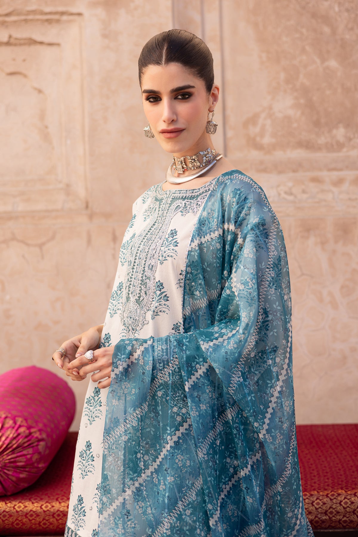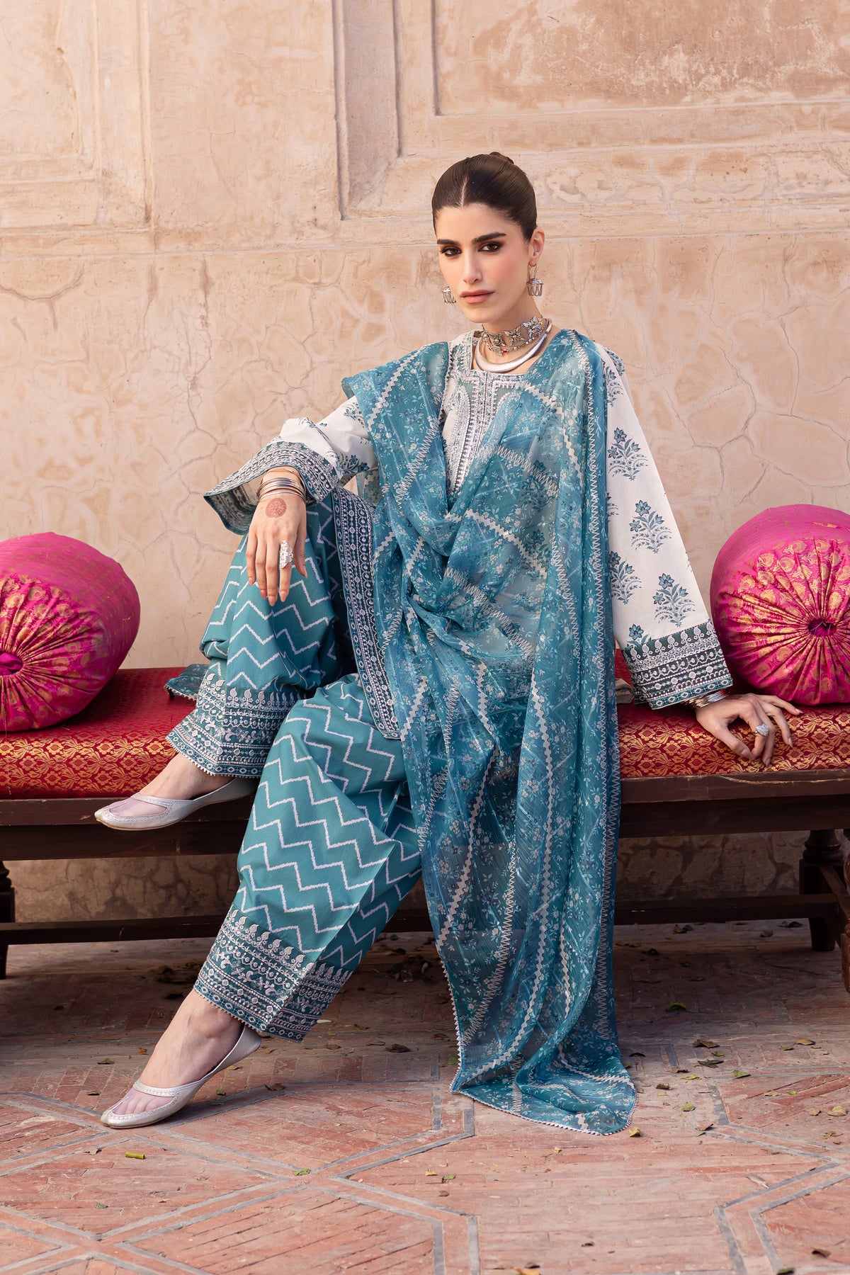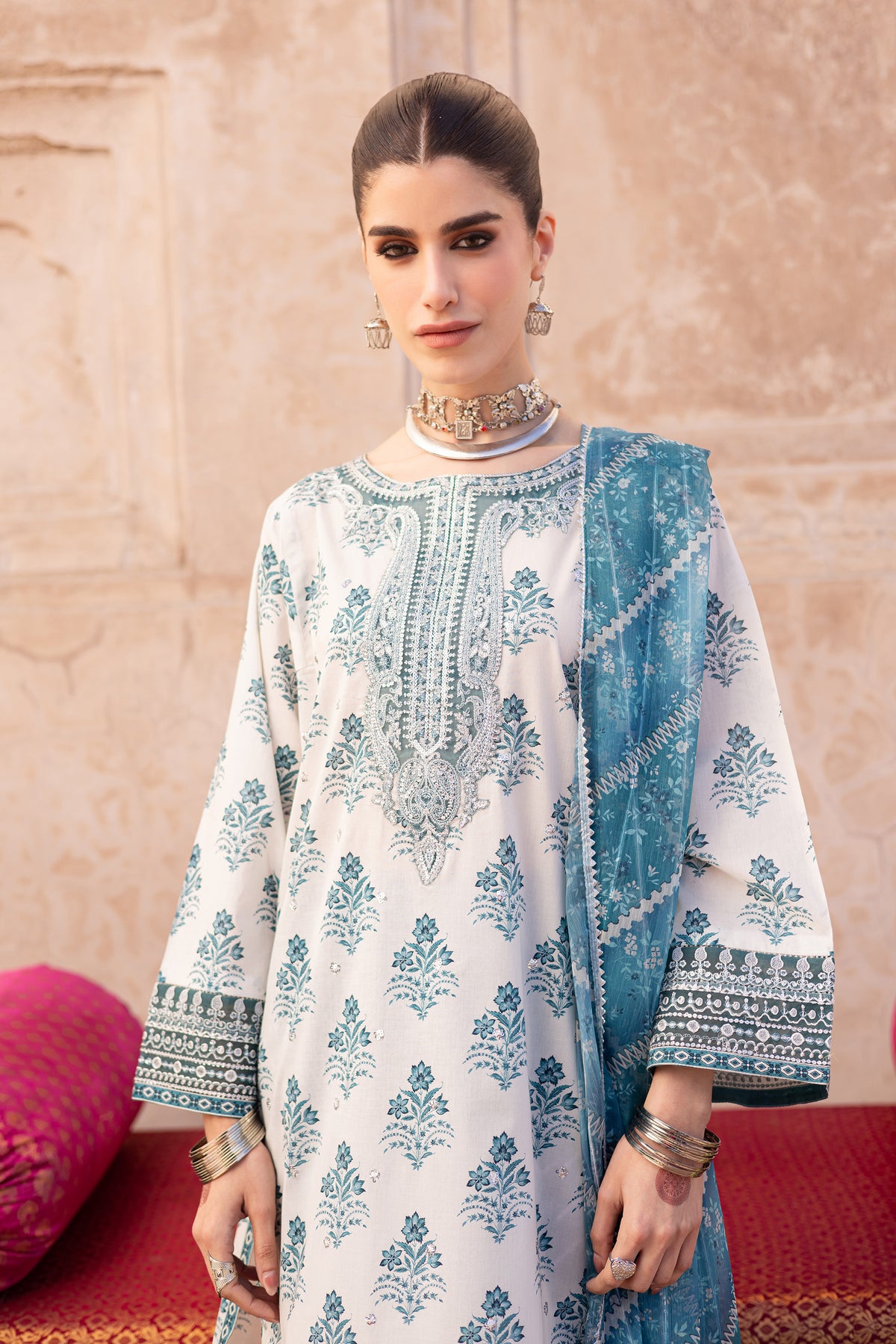 This printed off white lawn shirt is adorned with exquisite embroidery at the neckline, side chaaks, and hem, adding a touch of intricate detailing to the design. The front of the shirt is enhanced with a delicate sequin spread, offering a subtle yet elegant shimmer.