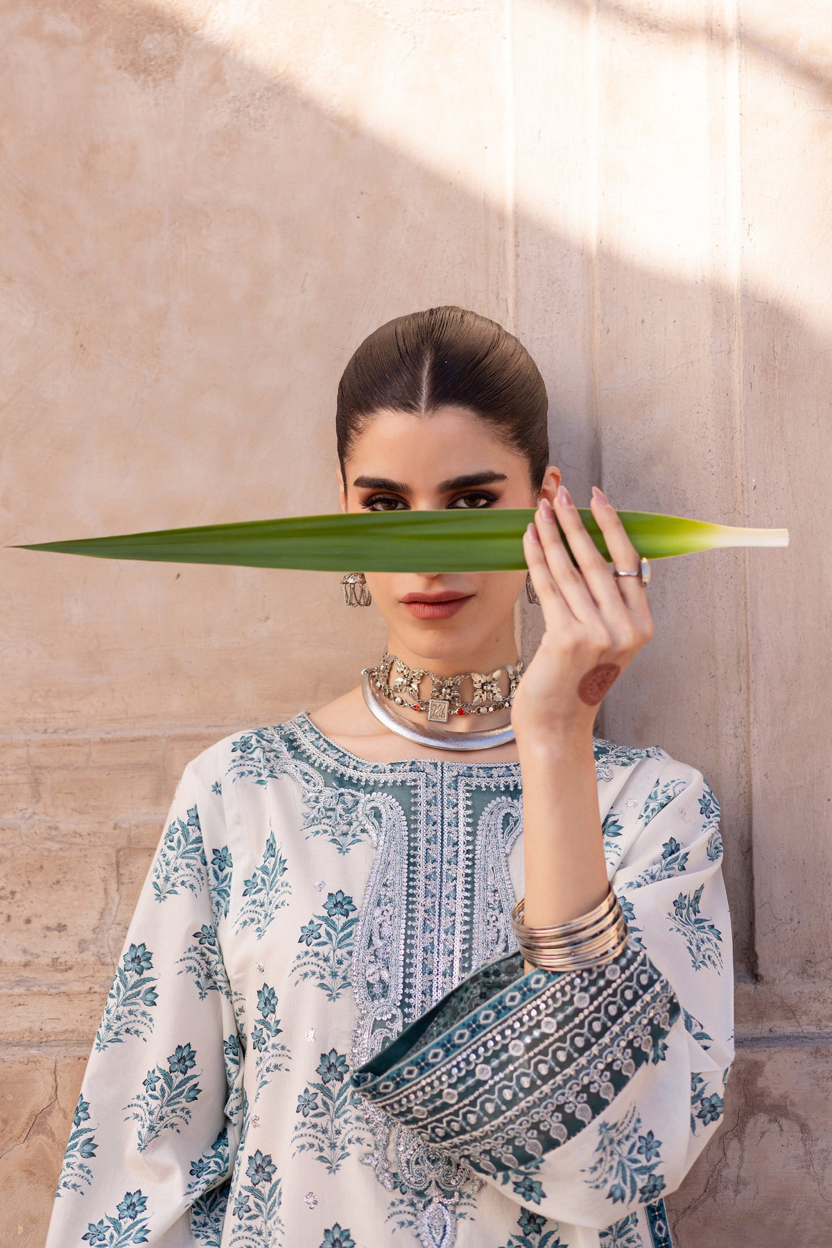The outfit is paired with a printed cambric farshi shalwar, beautifully embroidered at the hem, which complements the shirt’s intricate detailing and adds to the overall elegance of the ensemble.