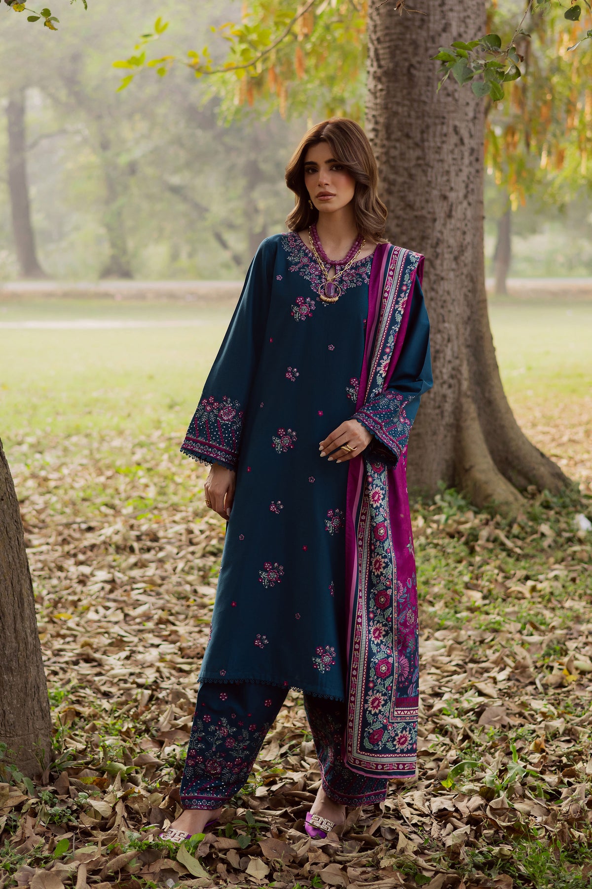 This 3-piece prussian khaddar ensemble is a celebration of color and craftsmanship. The long shirt features a beautifully embroidered front and sleeves, brought to life with vibrant threads that add a touch of artistry to every detail. Finished with delicate lace accents, it carries a perfect balance of elegance and warmth, ideal for the winter season.