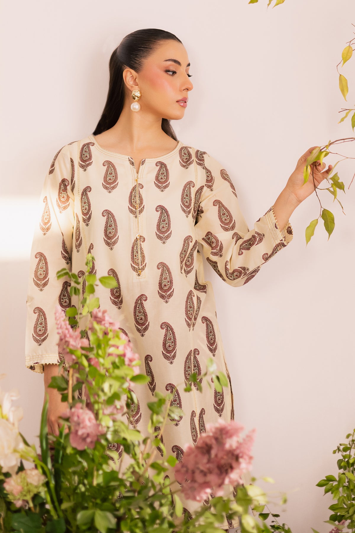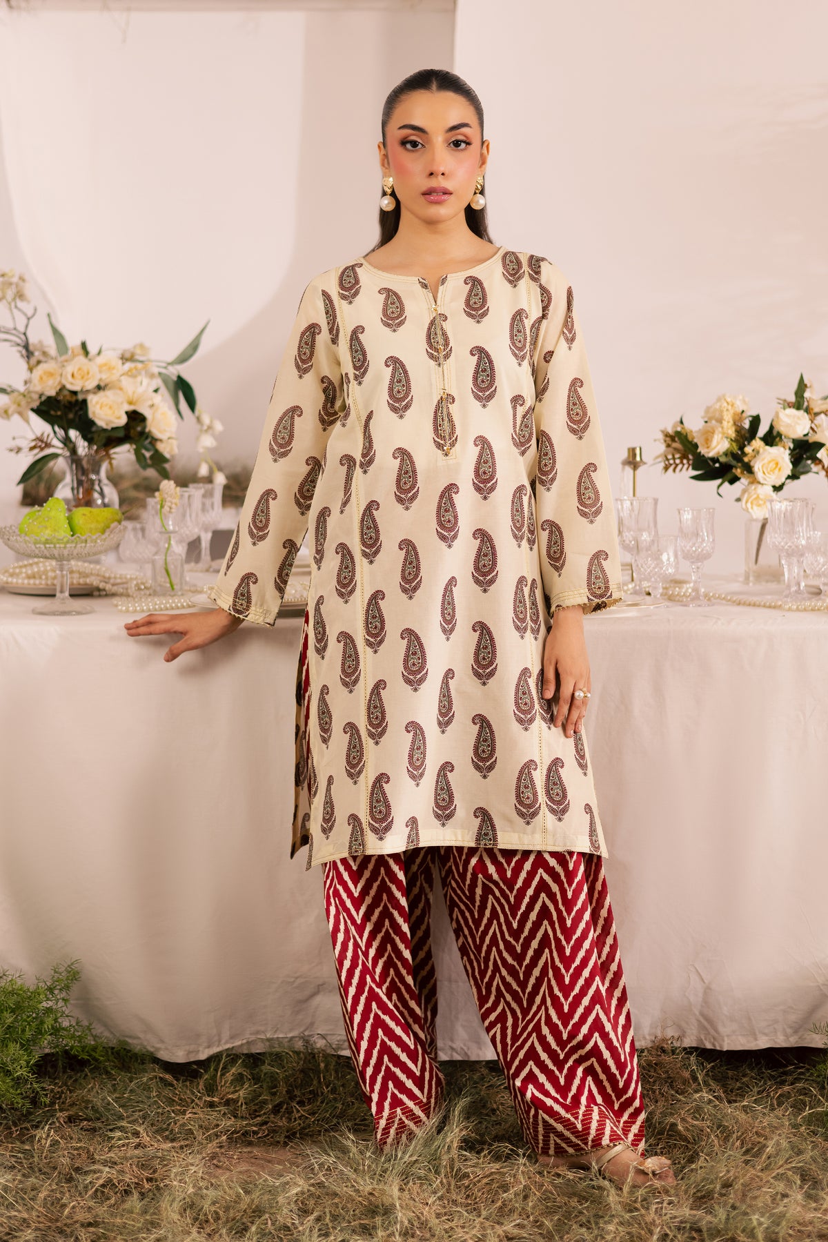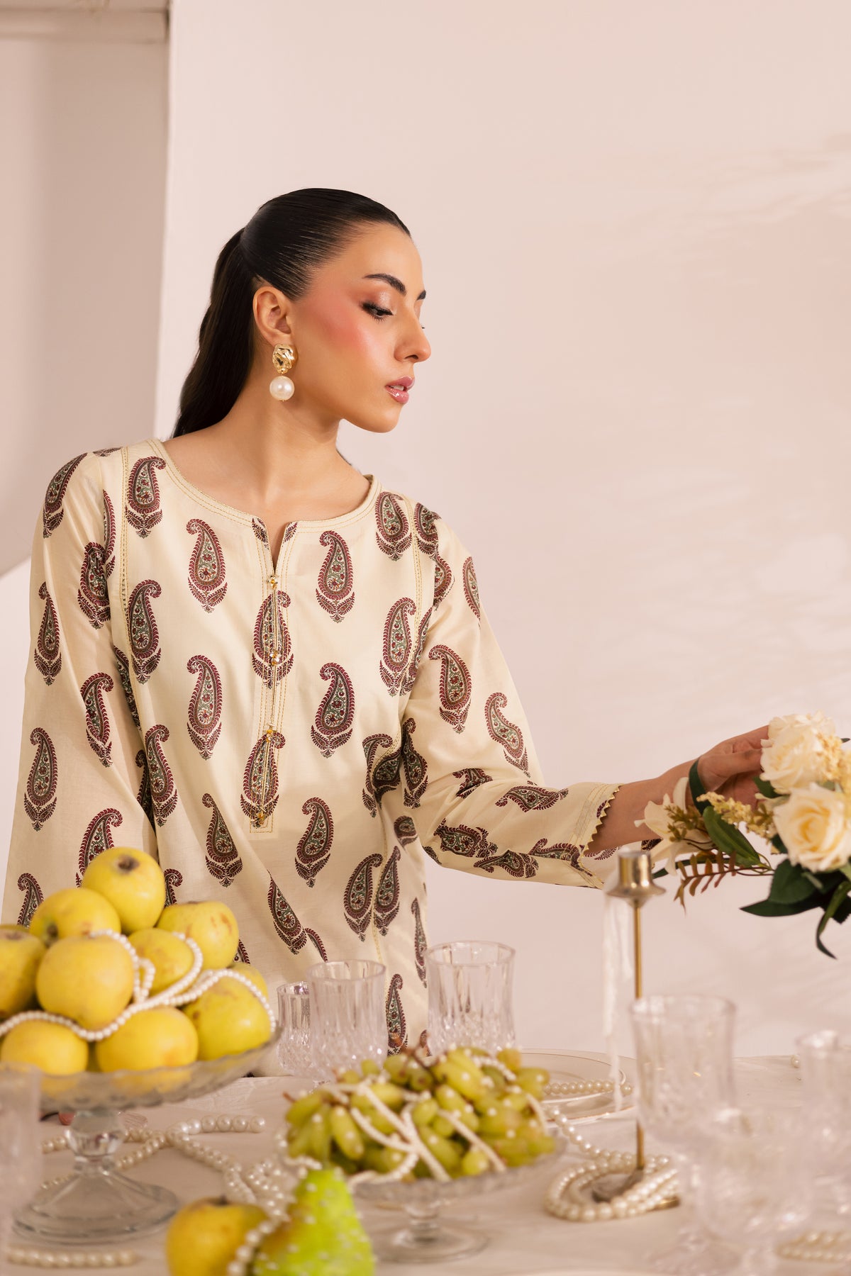 Paired with a printed cambric farshi shalwar, beautifully finished with gold stitch lines at the hem, perfectly complementing the shirt’s intricate accents for a cohesive, graceful look.