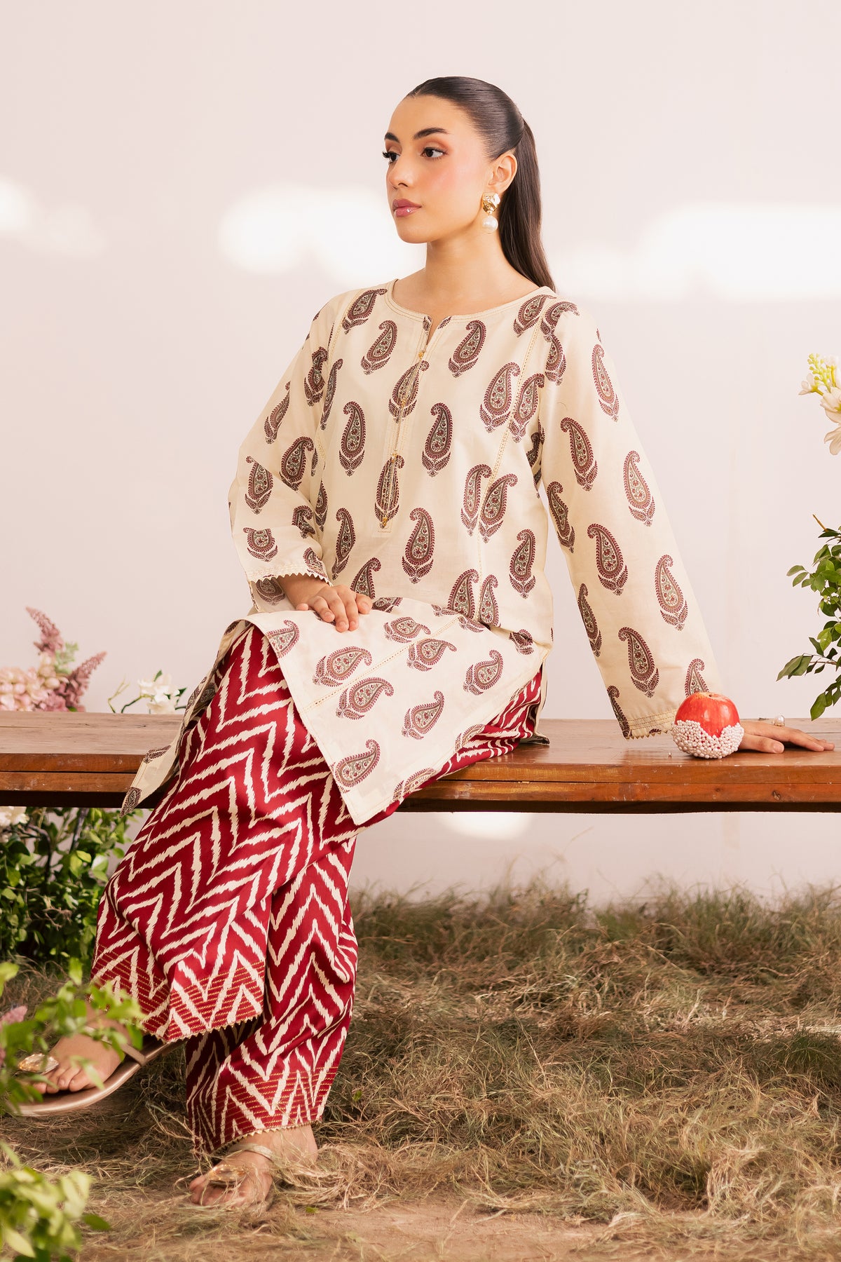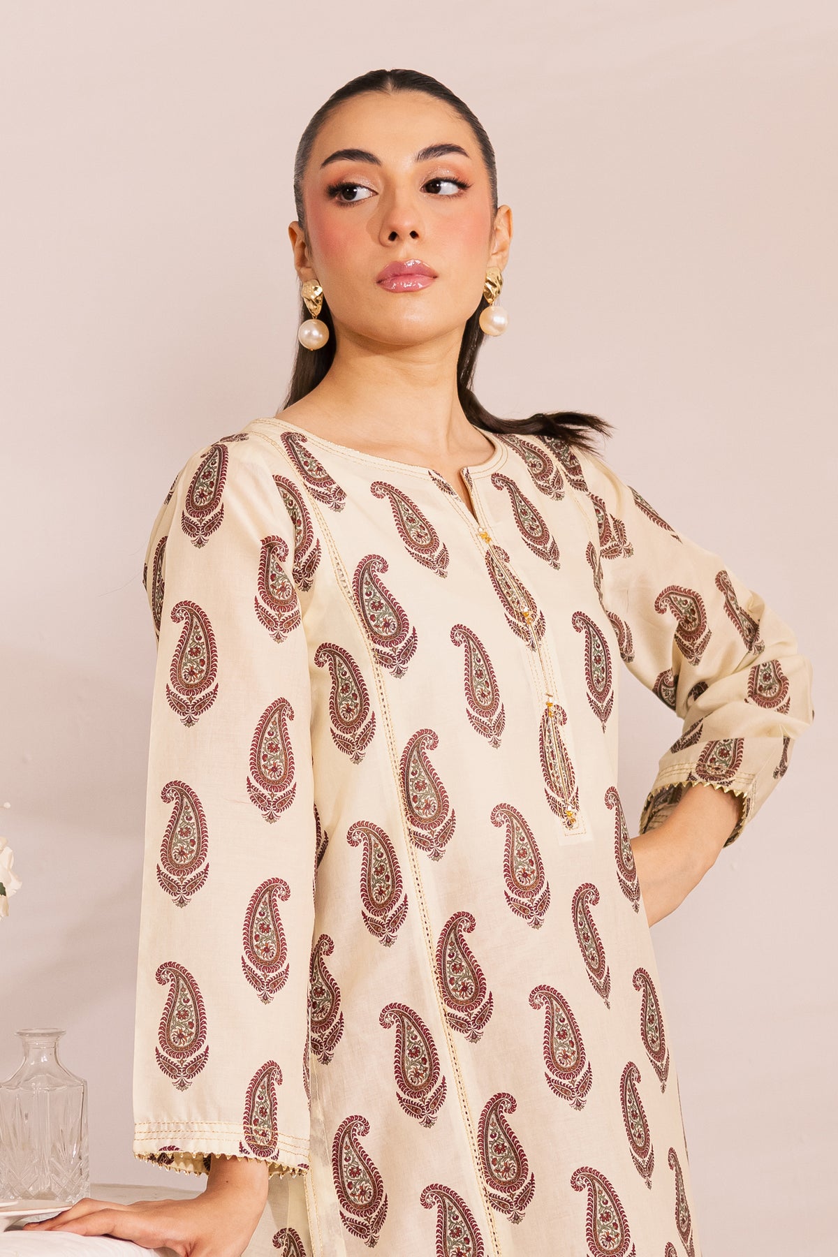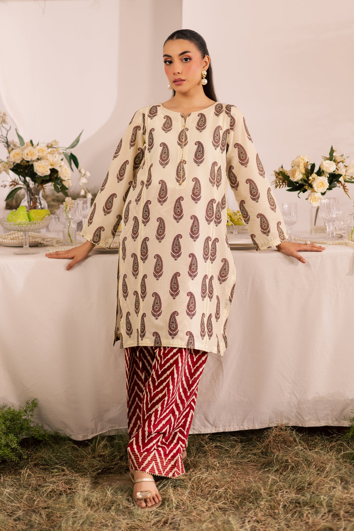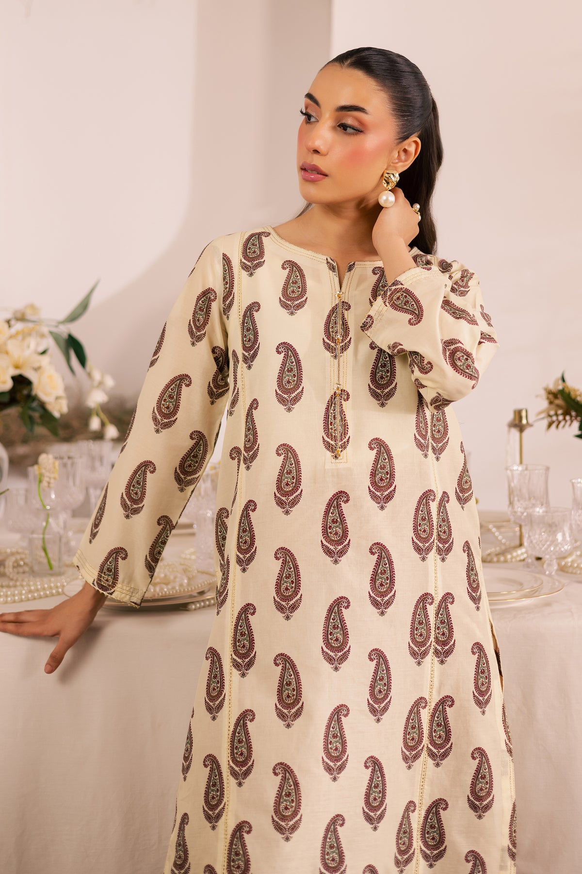 Paired with a printed cambric farshi shalwar, beautifully finished with gold stitch lines at the hem, perfectly complementing the shirt’s intricate accents for a cohesive, graceful look.